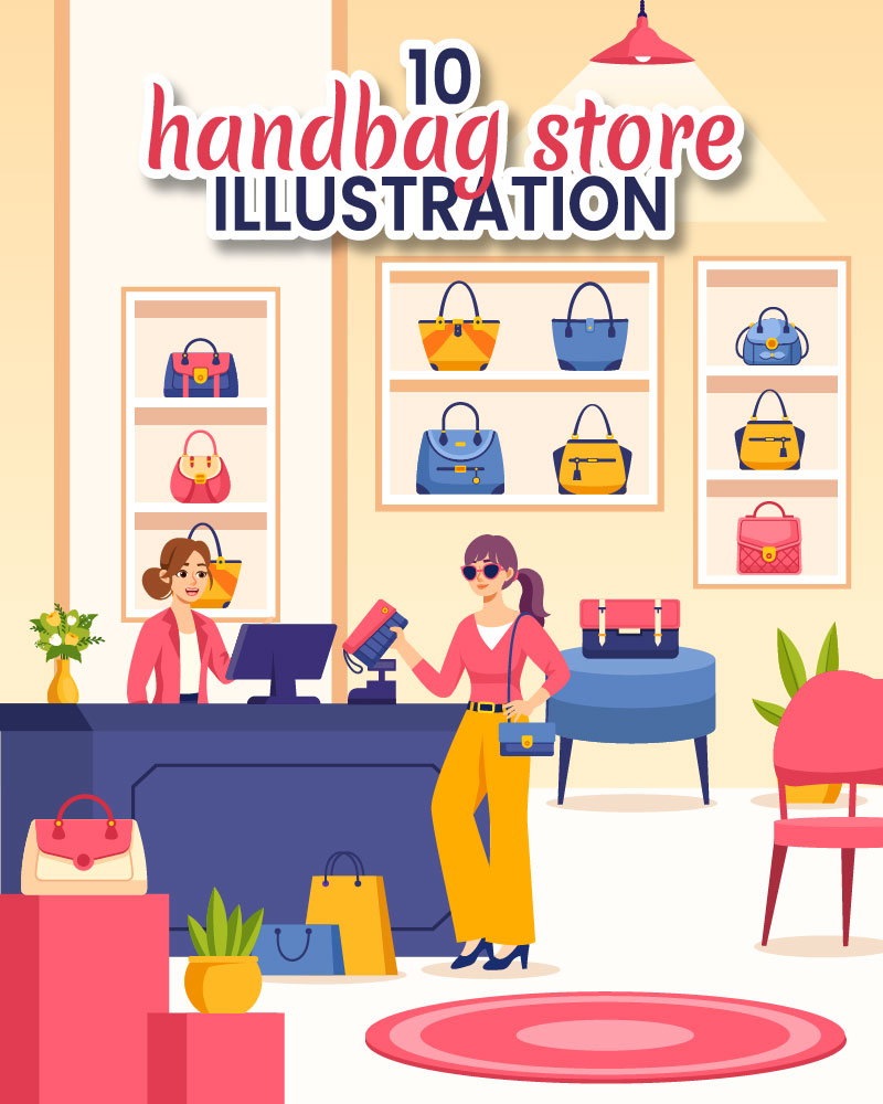 Handbag Store Vector Illustration with Collection of Various Quality Bags and Different Types of Lifestyle in Flat Cartoon Background Design Suitable for Poster, Web Banner, Brochure, Landing Page and Others Background Template Features: