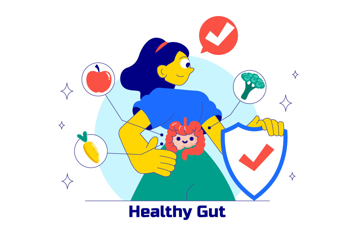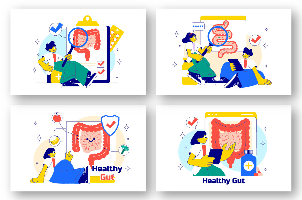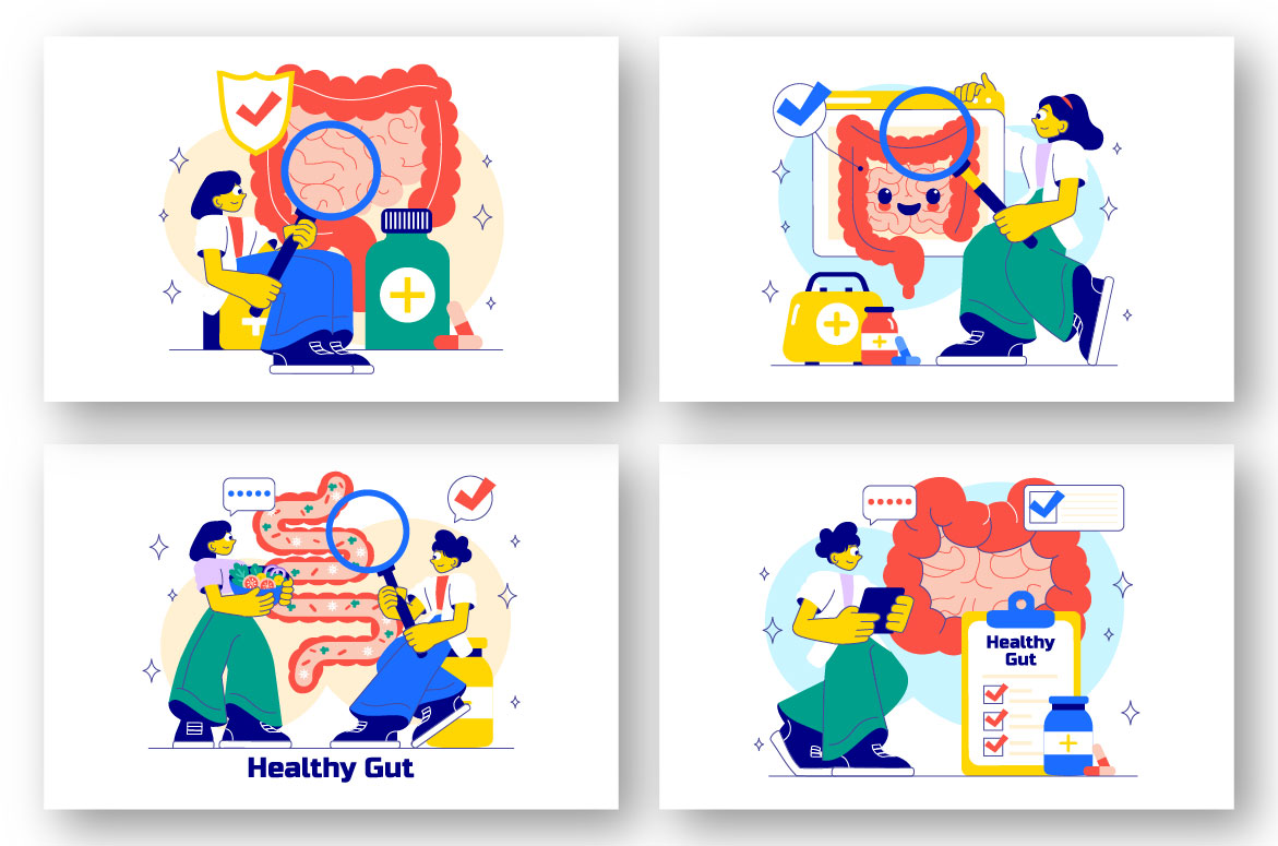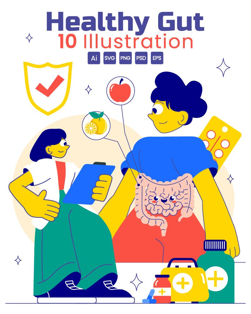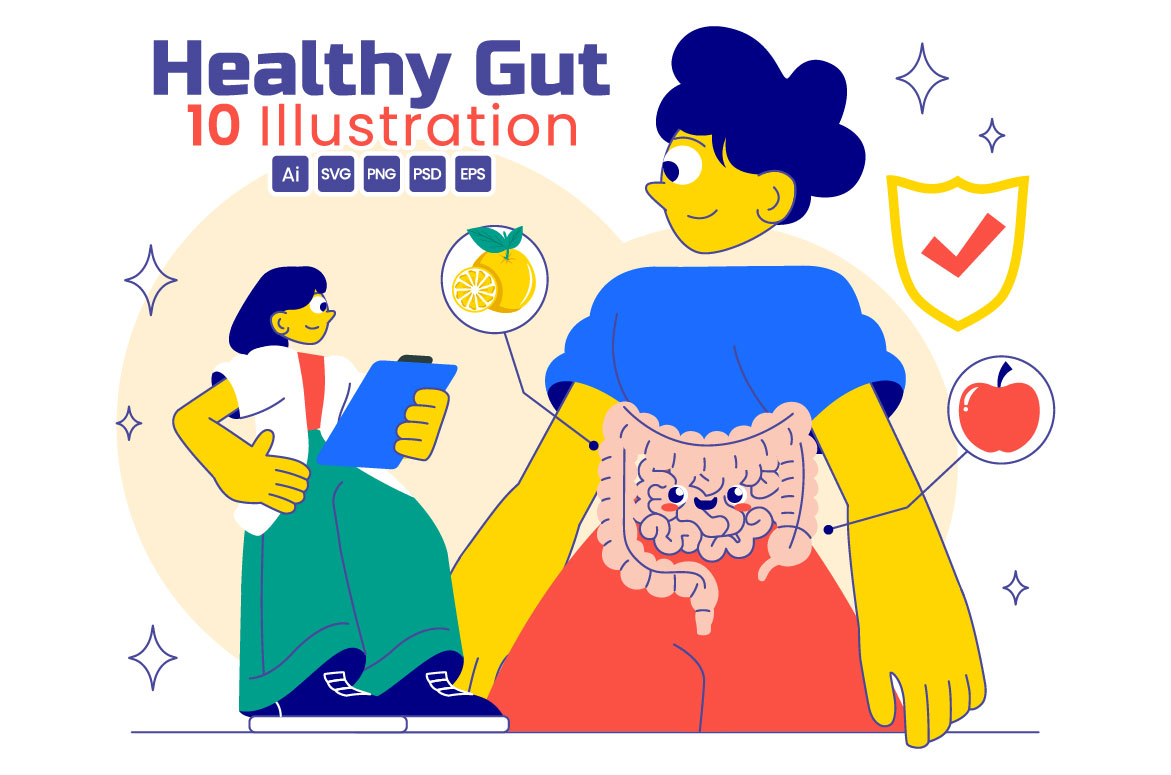 Healthy Gut Illustration featuring Human Digestive System Anatomy with Gut Microflora, Inflamed Intestinal Cells, Bacteria, and Probiotics Background Suitable for Poster, Web Banner, Brochure, Landing Page and Others Background Template Features: