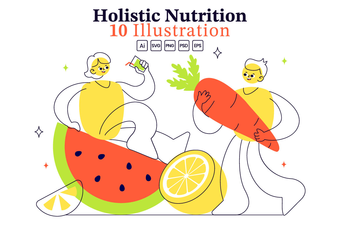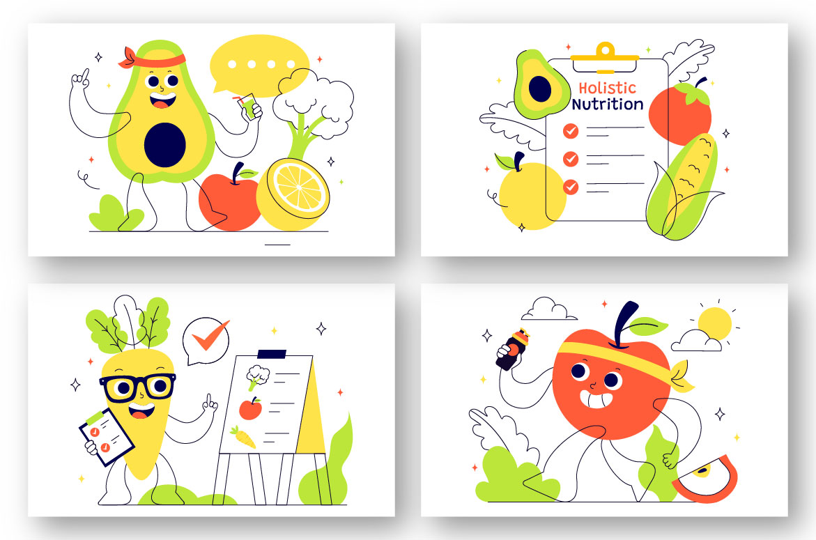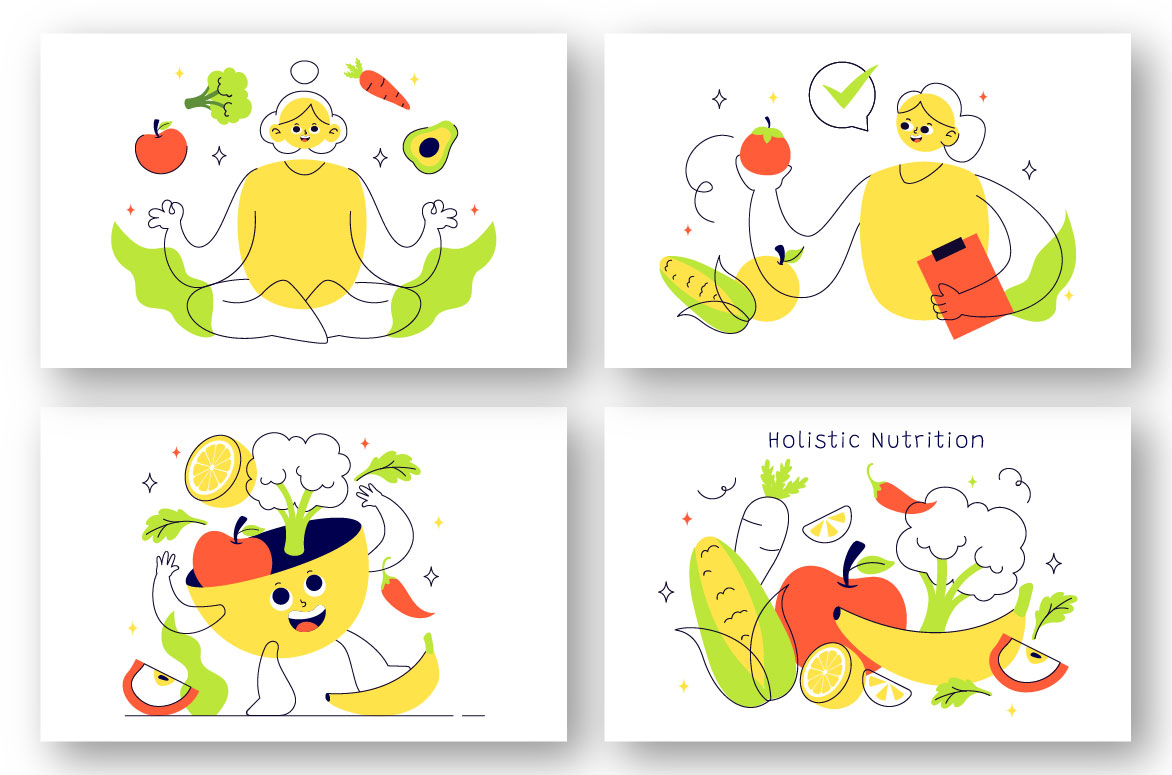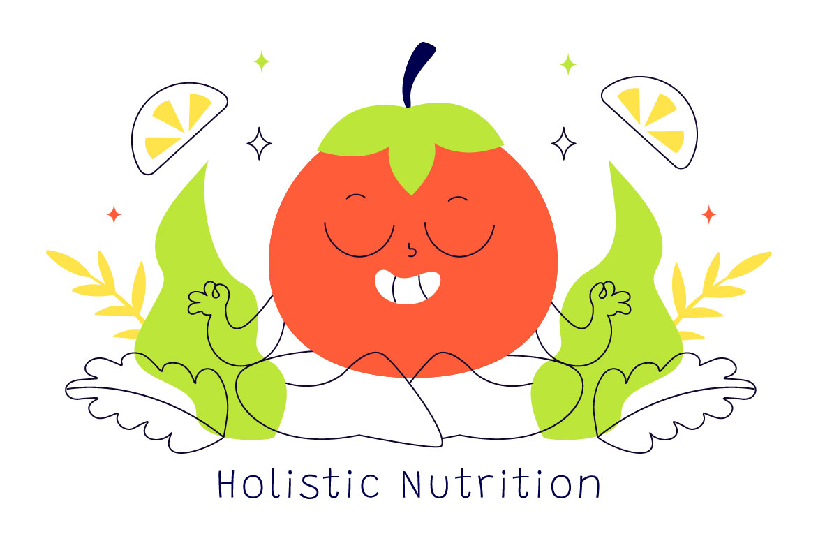 Holistic Nutrition Vector Illustration Featuring Healthy Food, Fruits, and Vegetables, Emphasizing Lifestyle and Environmental Aspects in a Background Suitable for Poster, Web Banner, Brochure, Landing Page and Others Background Template Features: