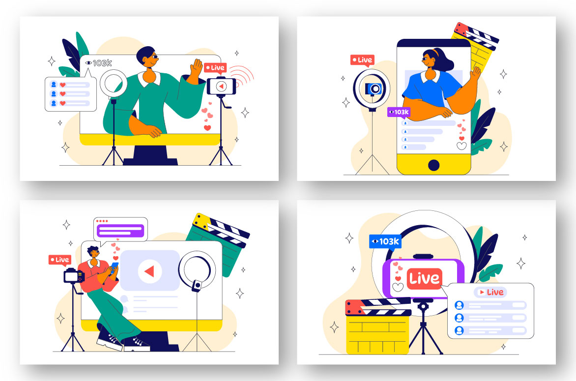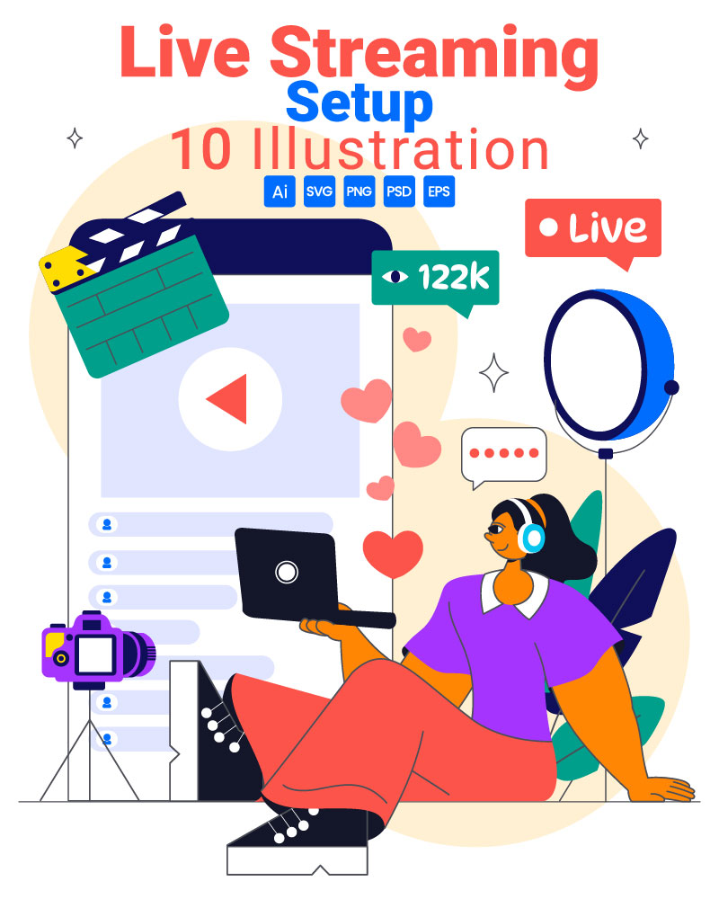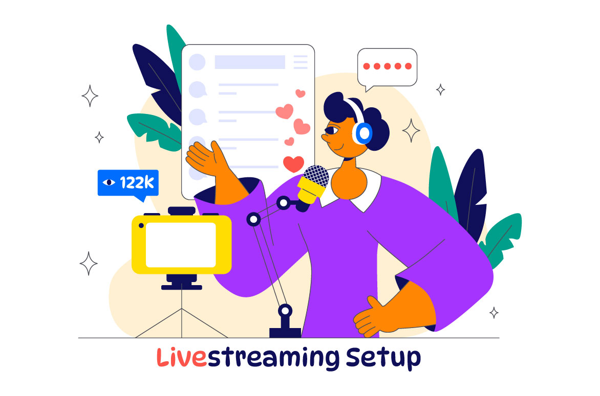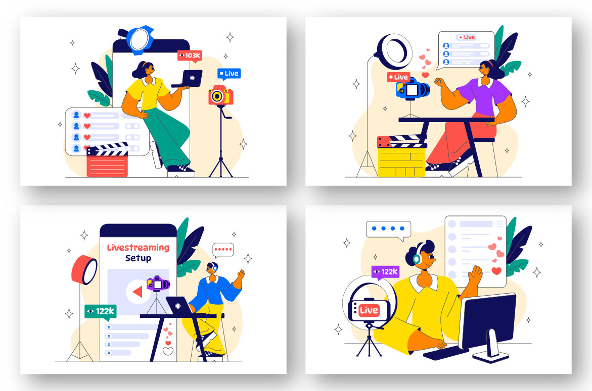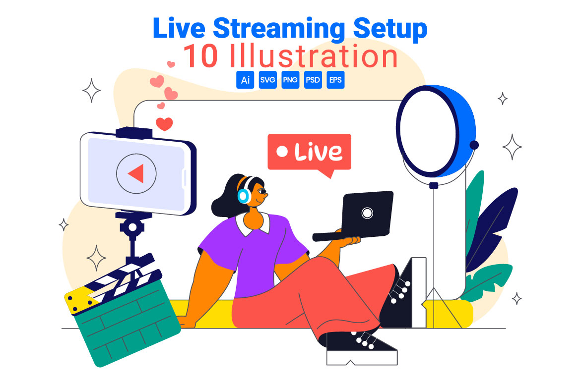 Live Streaming Setup Vector Illustration Featuring People as Online Streamers with Multiple Screens, Microphones, and Headphones in a Flat Background Suitable for Poster, Web Banner, Brochure, Landing Page and Others Background Template Features: