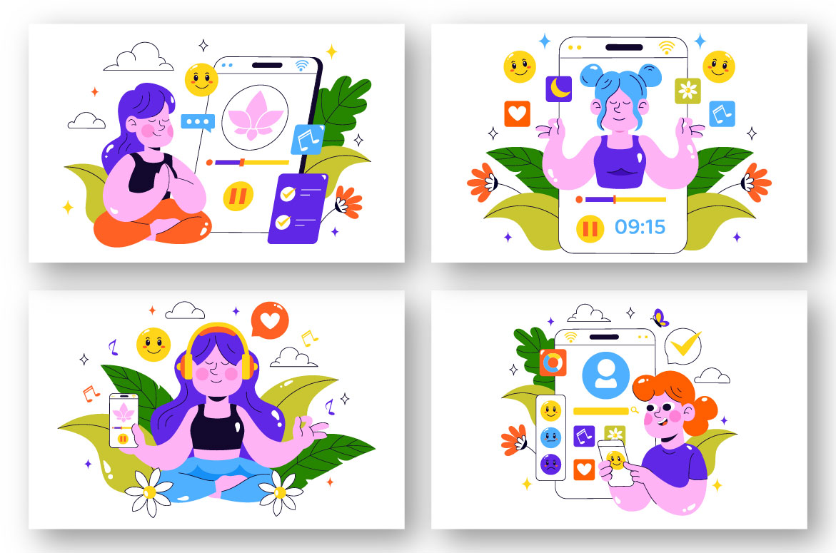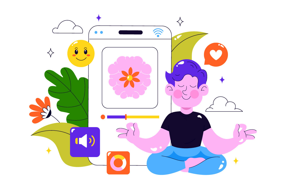 Mental Wellness Meditation Apps Vector Illustration featuring Mobile Software with Yoga Therapy for Anxiety and Relaxation in a Flat Style Background Suitable for Poster, Web Banner, Brochure, Landing Page and Others Background Template Features: