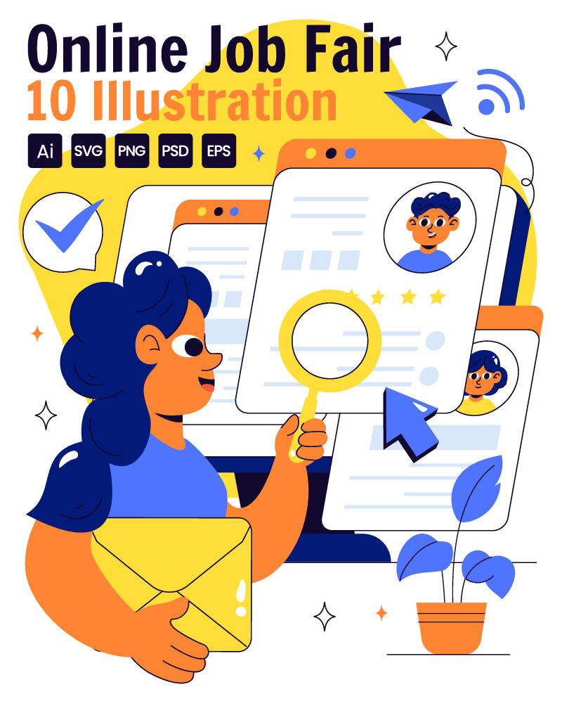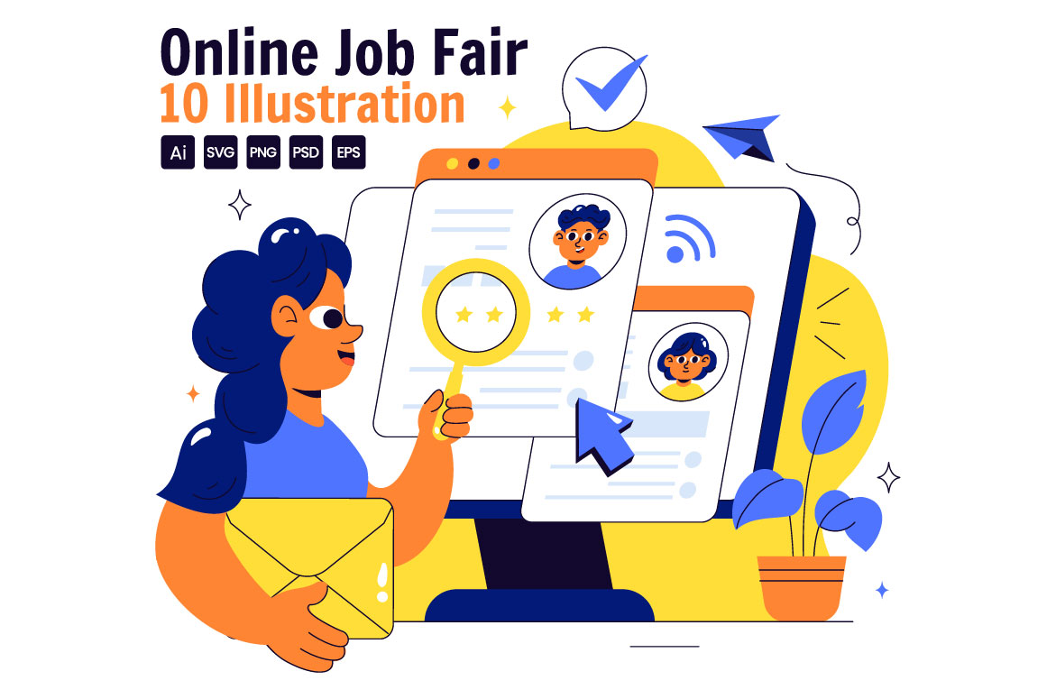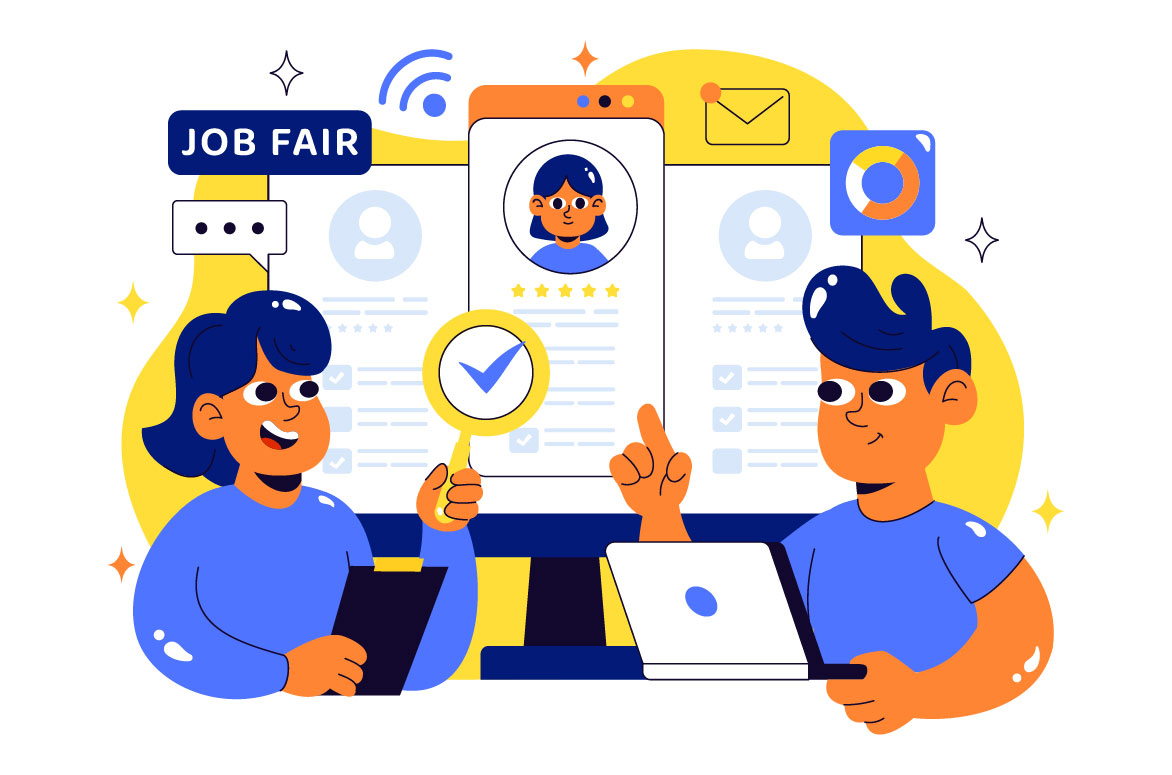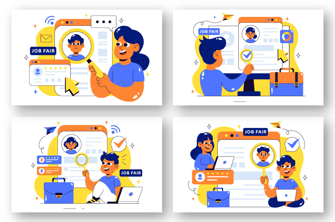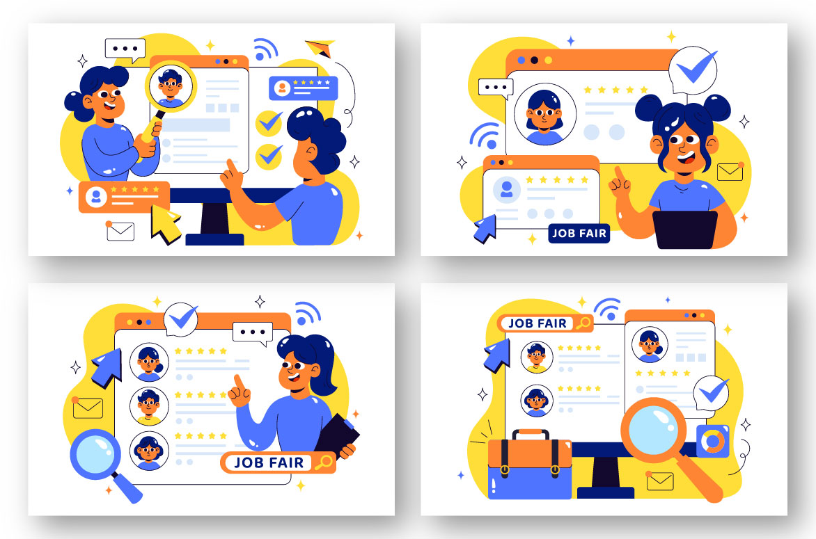 Online Job Fair Vector Illustration featuring We Are Hiring with Recruitment, Resume Selection Process, and Agency Interview in a Flat Background Suitable for Poster, Web Banner, Brochure, Landing Page and Others Background Template Features: