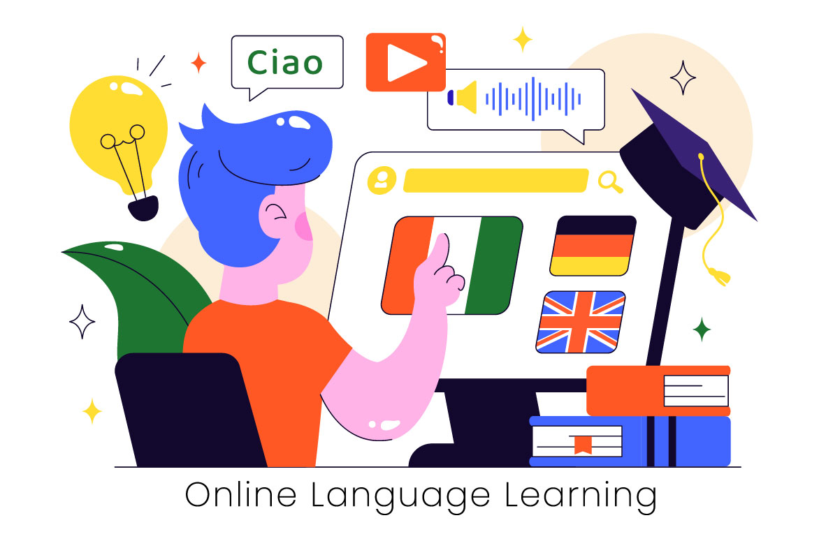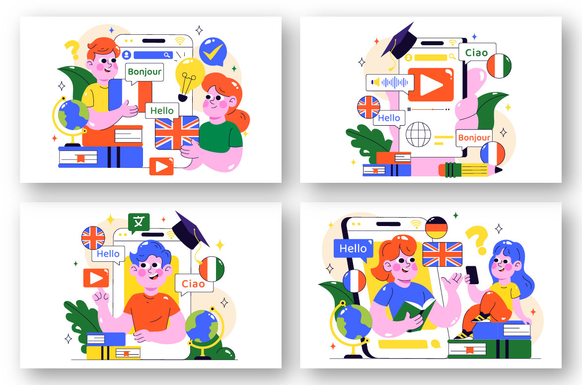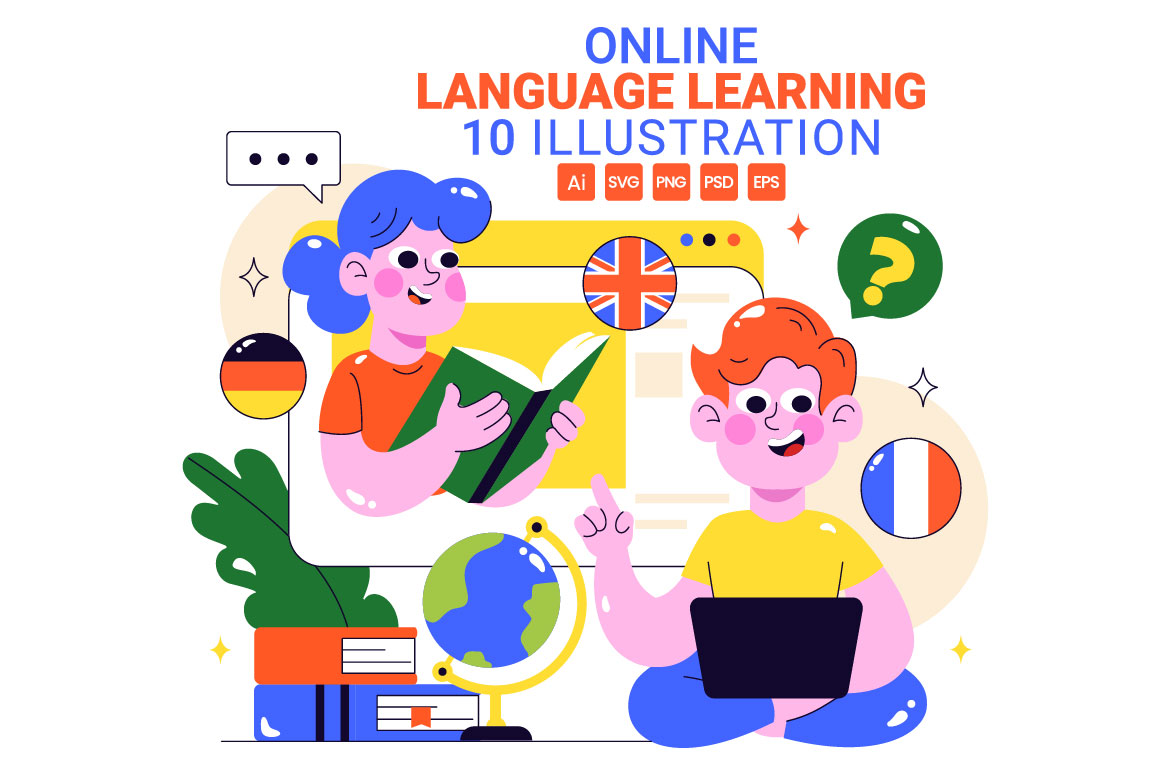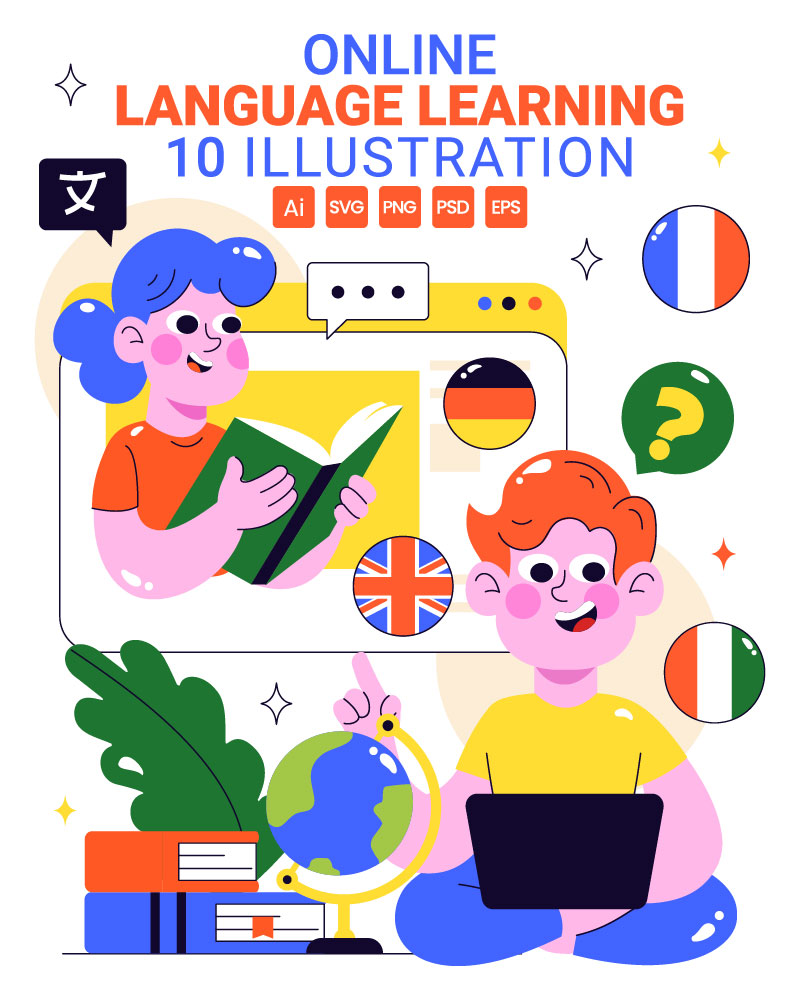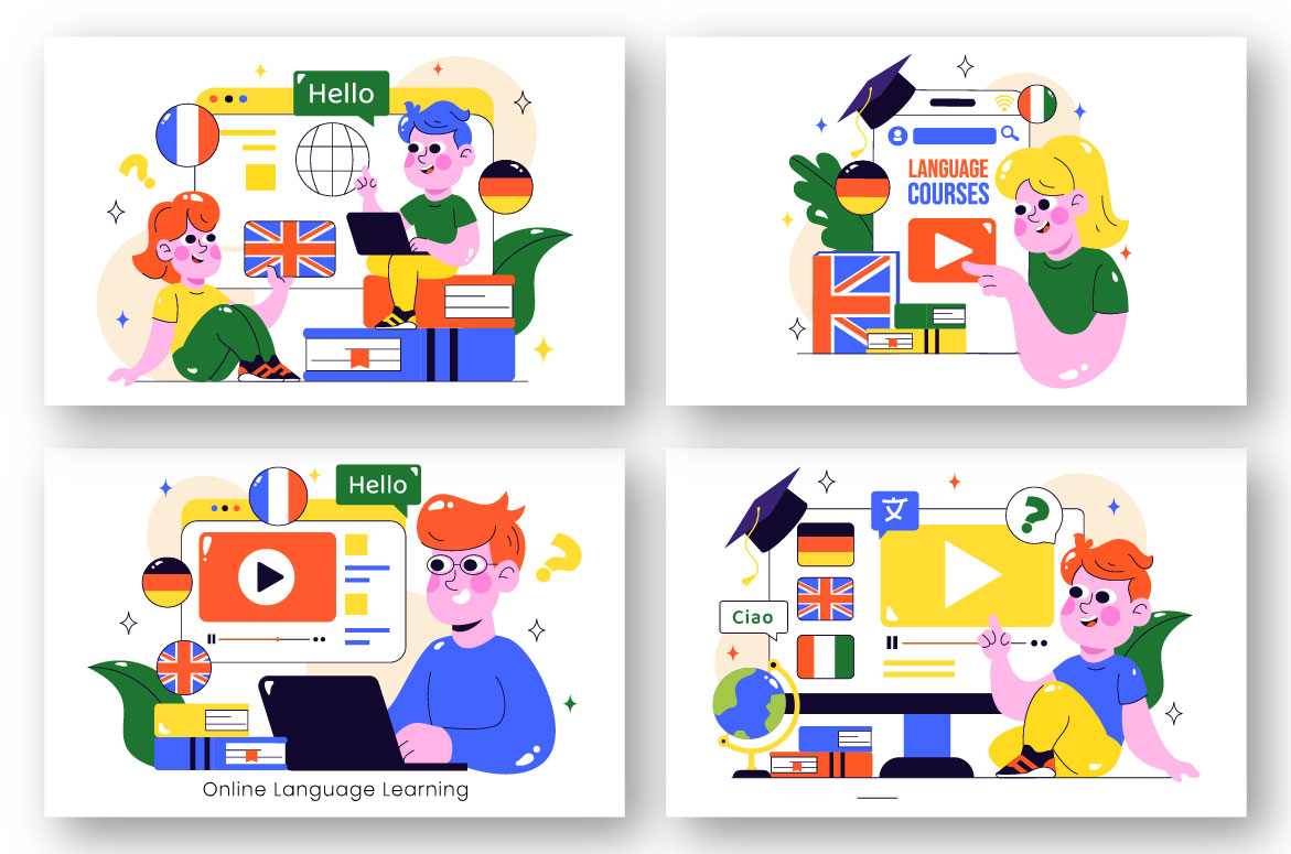 Online Language Learning Vector Illustration Featuring Courses, Training Programs, and Studying Foreign Languages Abroad through Website Education Suitable for Poster, Web Banner, Brochure, Landing Page and Others Background Template Features: