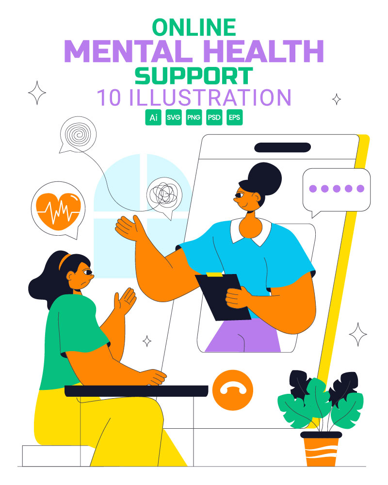 Online Mental Health Support Vector Illustration featuring Therapy Compositions and a Remote Consultation App with Psychological Assistance Service Suitable for Poster, Web Banner, Brochure, Landing Page and Others Background Template Features: