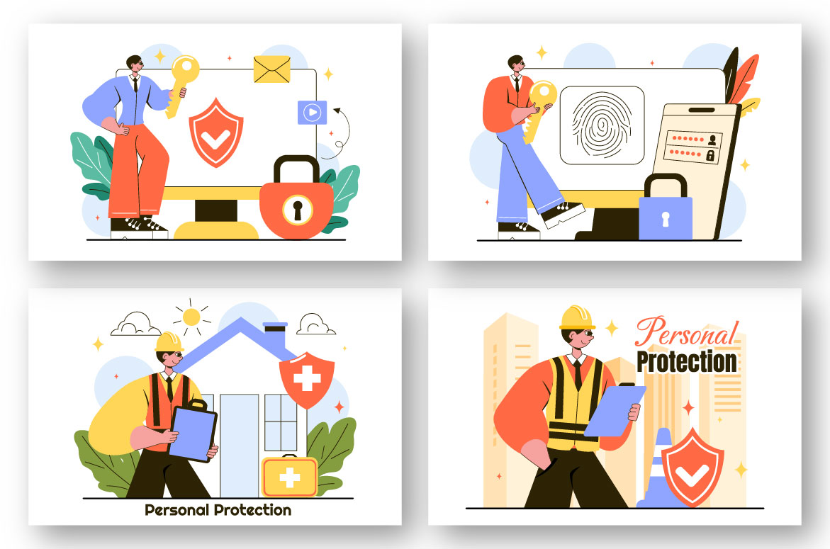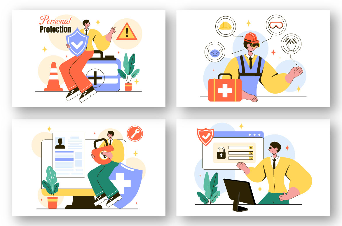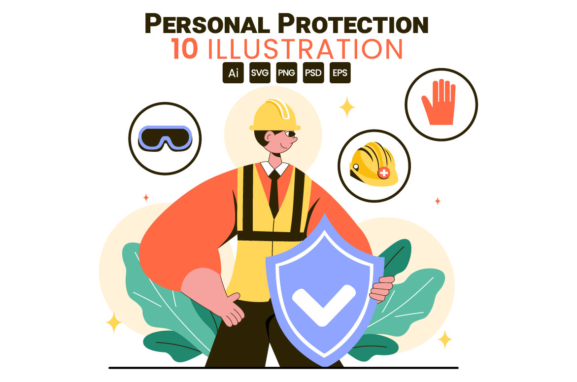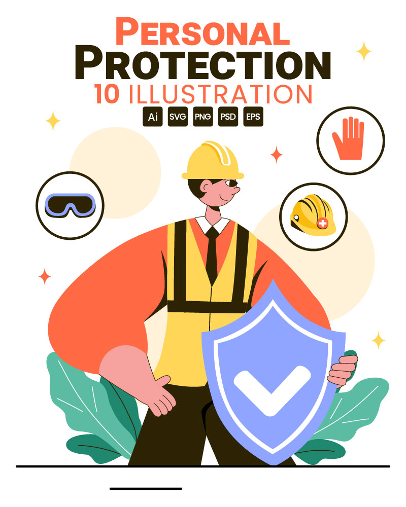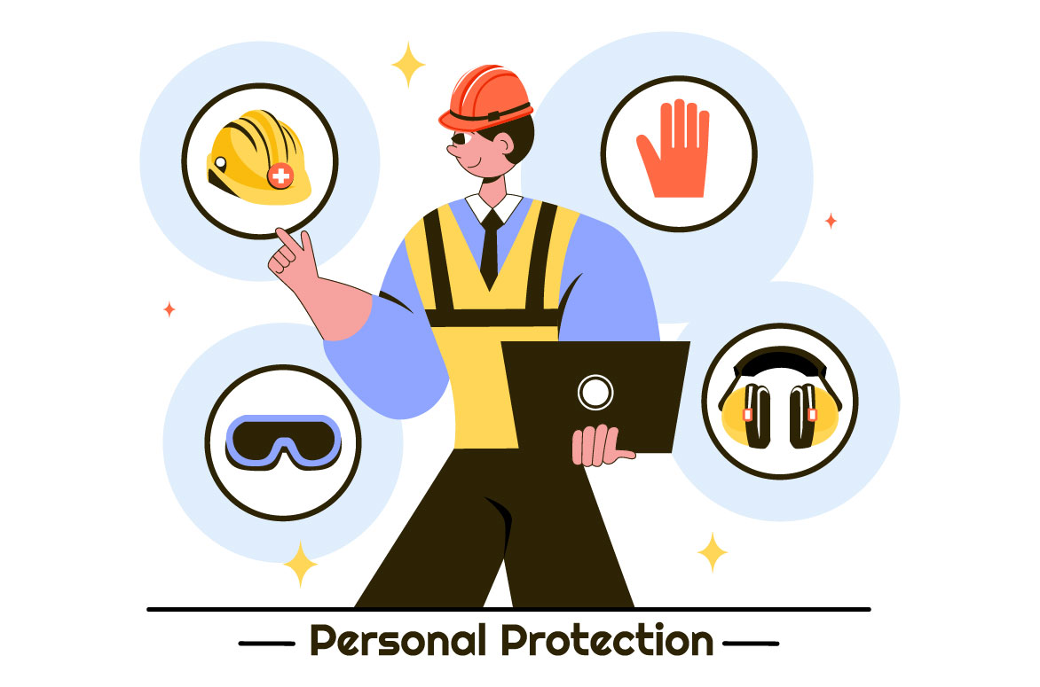 Personal Protection Vector Illustration Featuring Safety Equipment with a Construction Industrial Worker and Construction Tools in a Flat Background Suitable for Poster, Web Banner, Brochure, Landing Page and Others Background Template Features: