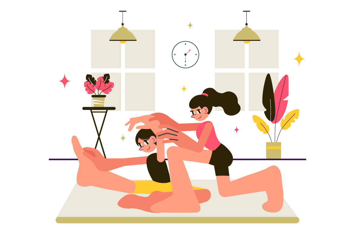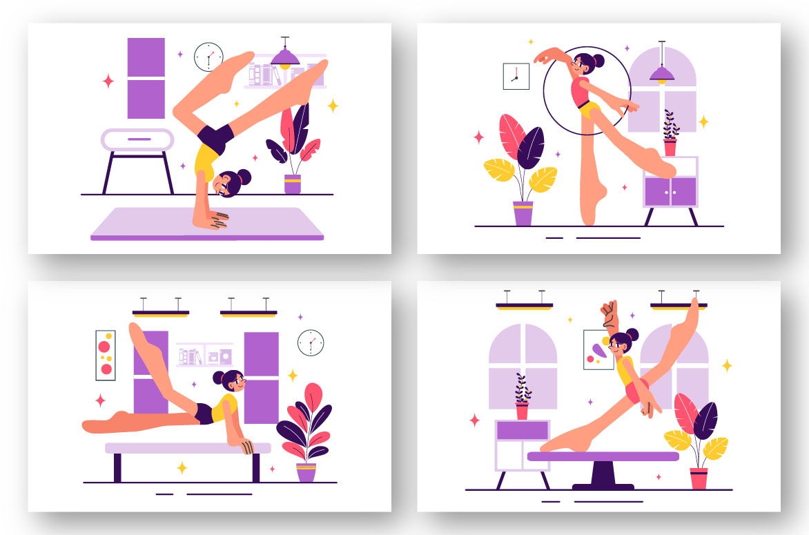 Rhythmic Gymnastics Illustration Featuring Professional Athletes Performing Artistic Acrobatic Moves, Showcasing Strength and Flexibility at Home Suitable for Poster, Web Banner, Brochure, Landing Page and Others Background Template Features:
