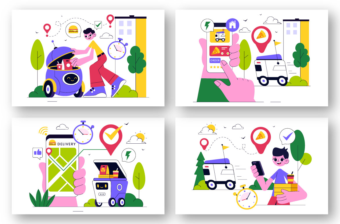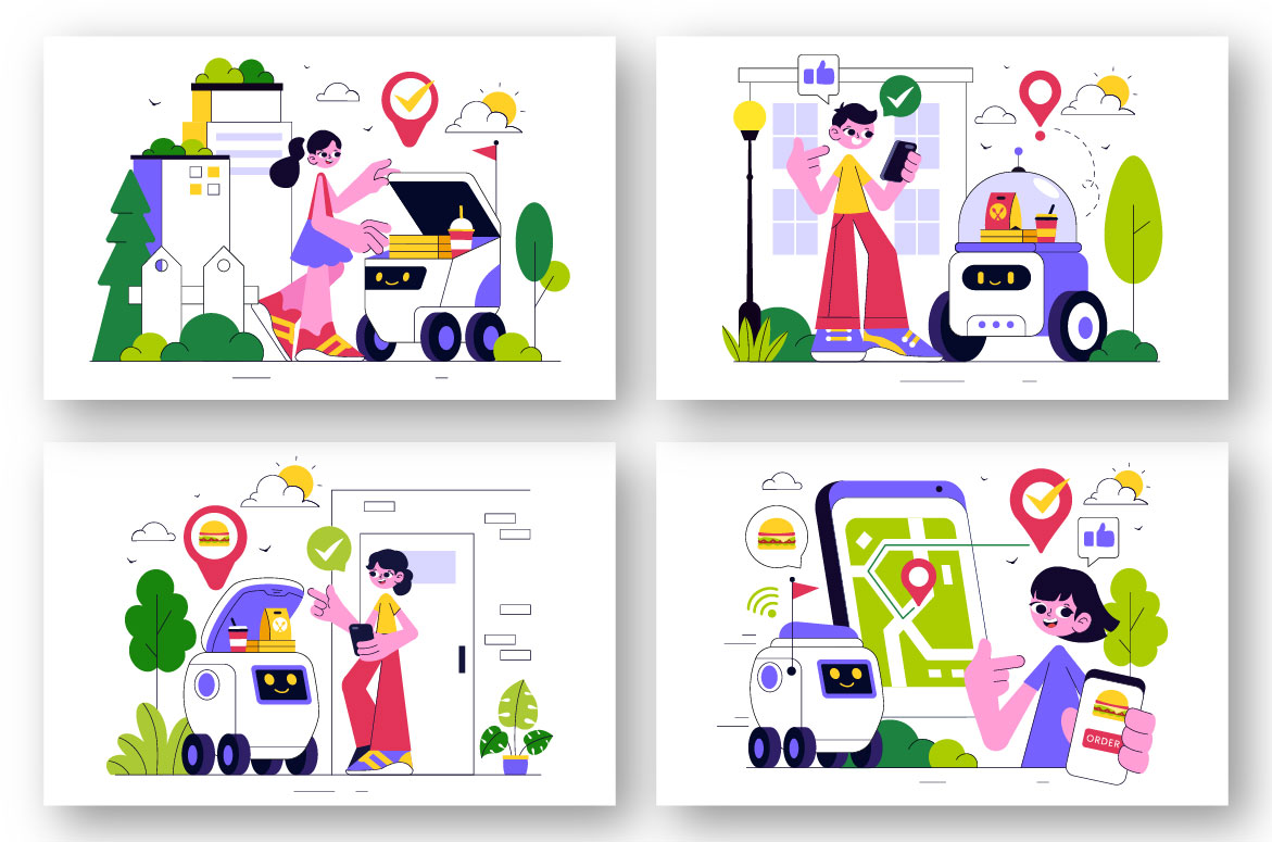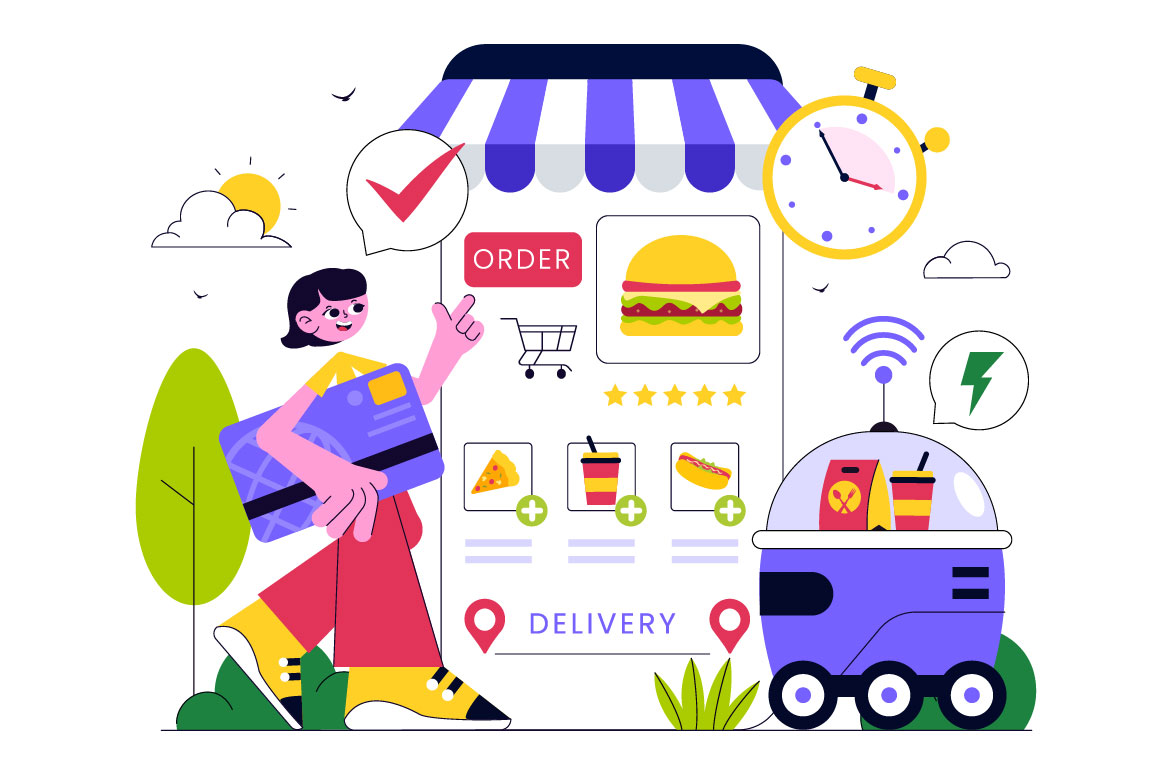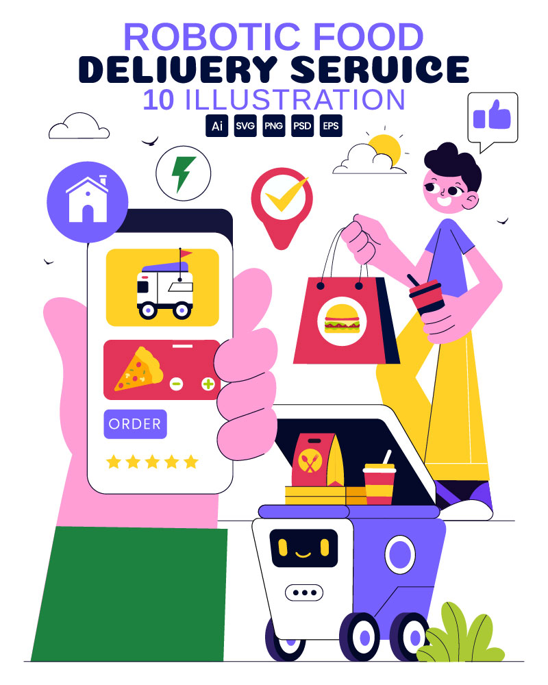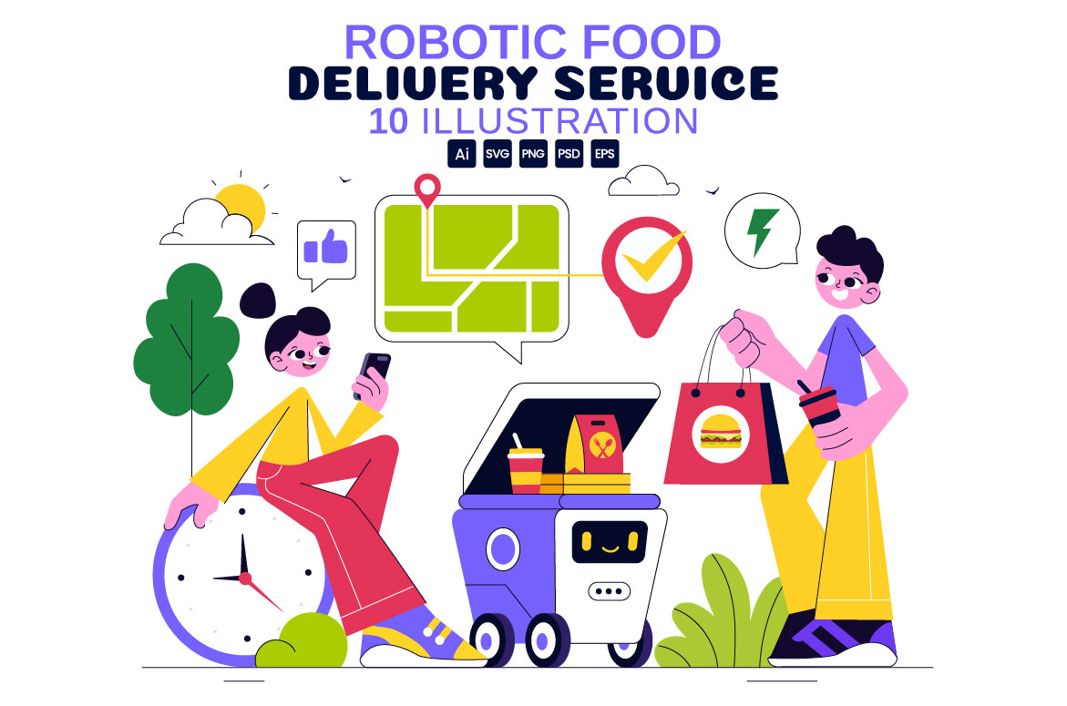 Food Delivery Robot Service Vector Illustration Featuring an AI Robot Serving Boxed Meals in a Restaurant with a Modern Robotic Waiter System Design Suitable for Poster, Web Banner, Brochure, Landing Page and Others Background Template Features: