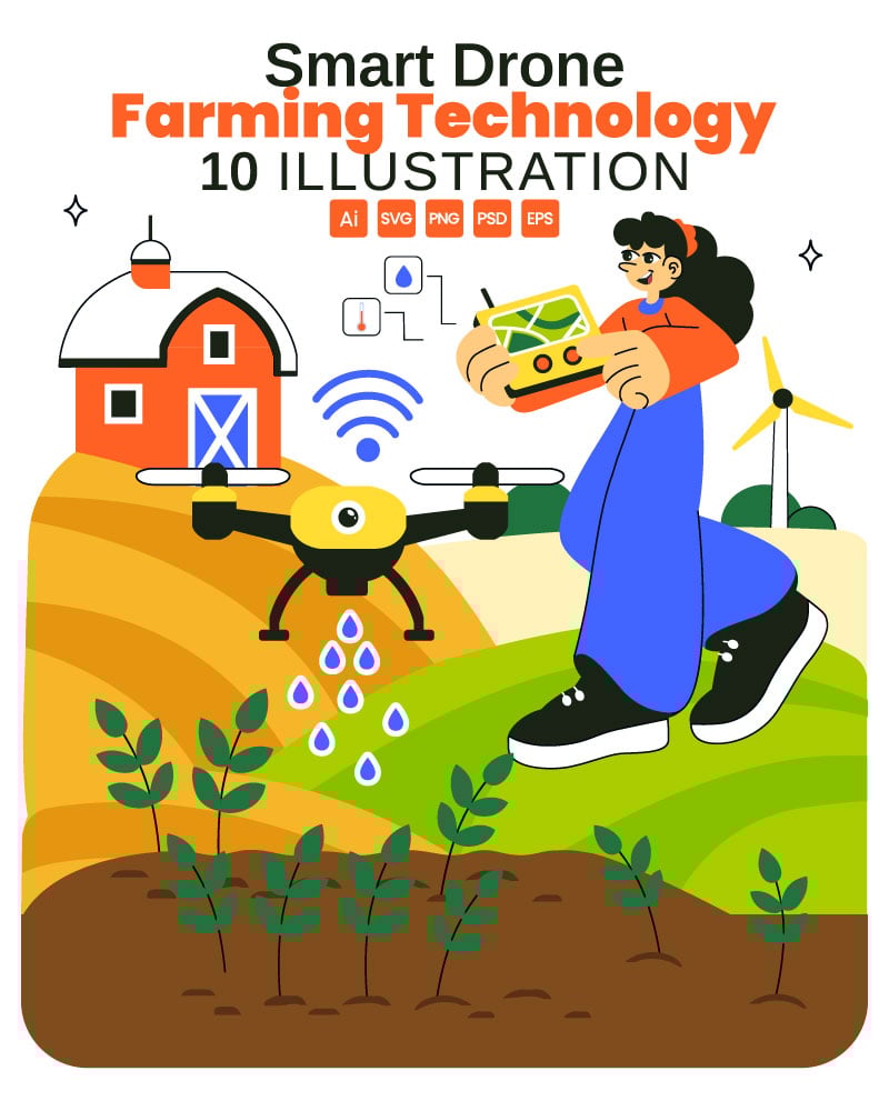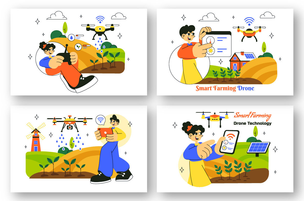 Smart Drone Farming Technology Vector Illustration Featuring a Farmer Managing His Industrial Farm Using a Tablet in a Flat Background Suitable for Poster, Web Banner, Brochure, Landing Page and Others Background Template Features: