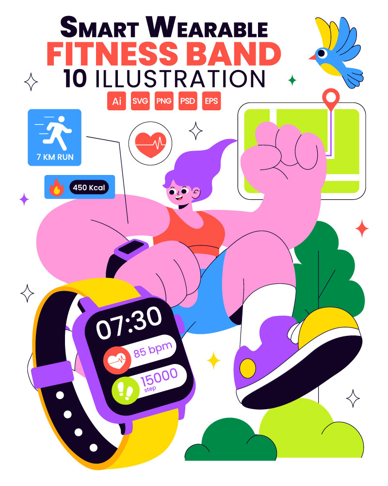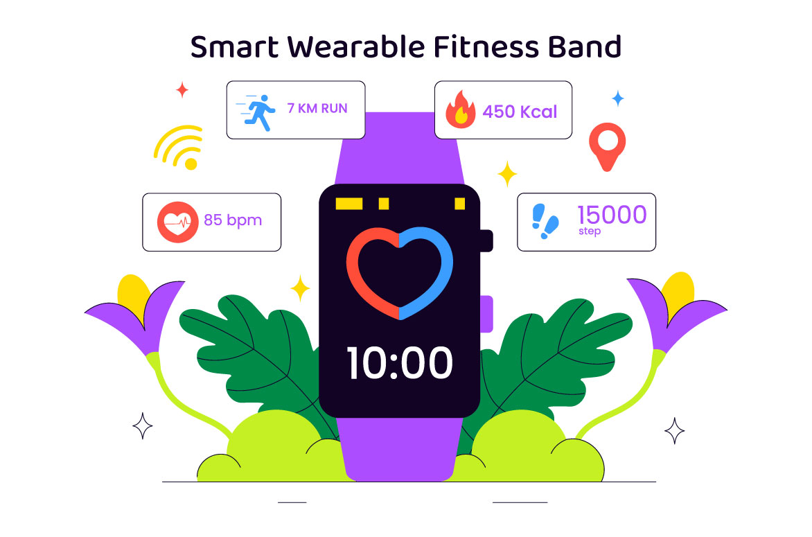 Smart Wearable Fitness Band Vector Illustration Featuring Smartwatch Tracker With Multimedia Apps For Lifestyle, Work, And Heart Rate Monitoring Suitable for Poster, Web Banner, Brochure, Landing Page and Others Background Template Features: