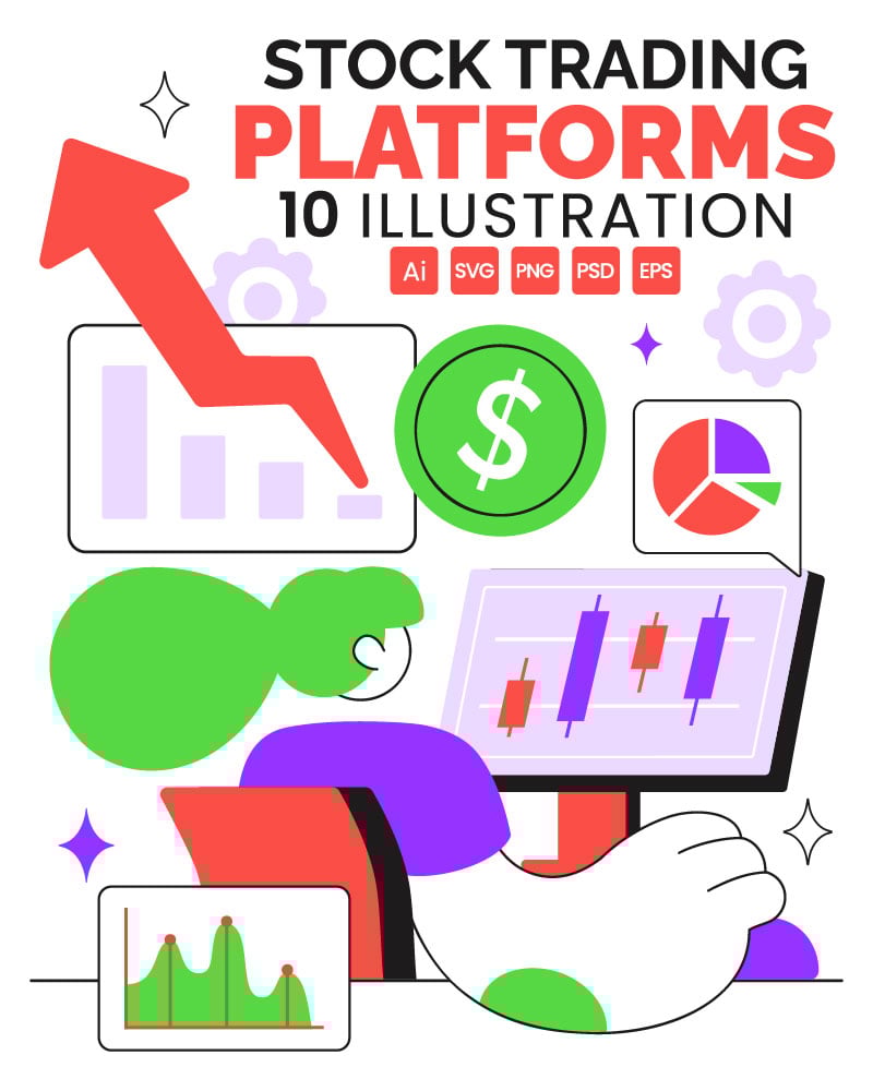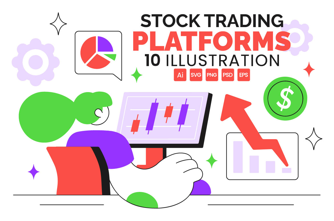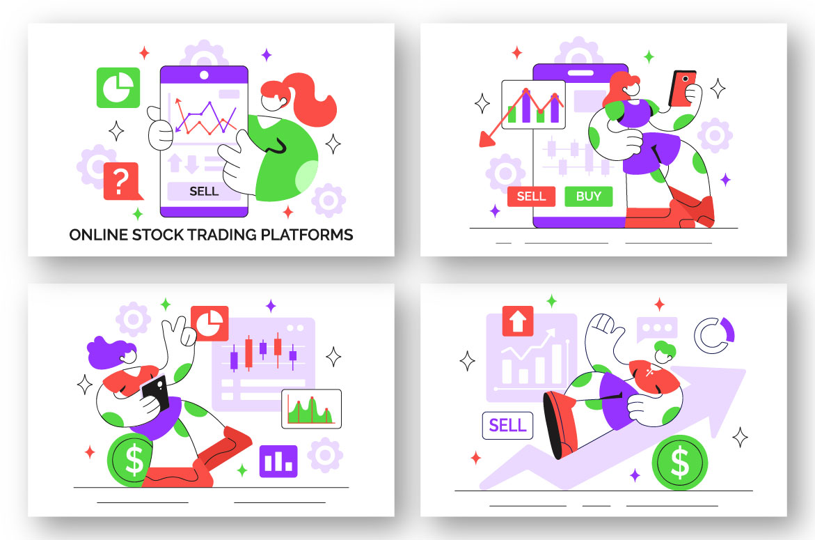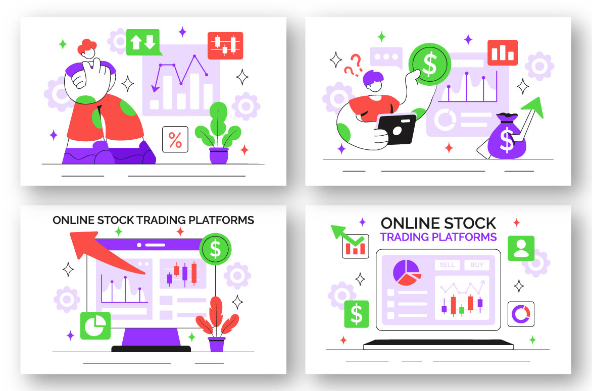 Online Stock Trading Platforms Illustration Featuring Buying and Selling Digital Assets Like Bitcoin for Potential Profit or Investment Purposes Suitable for Poster, Web Banner, Brochure, Landing Page and Others Background Template Features: