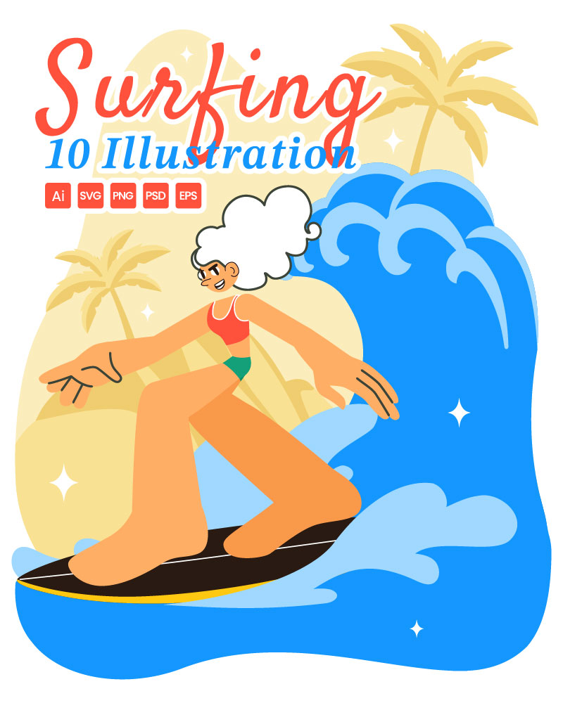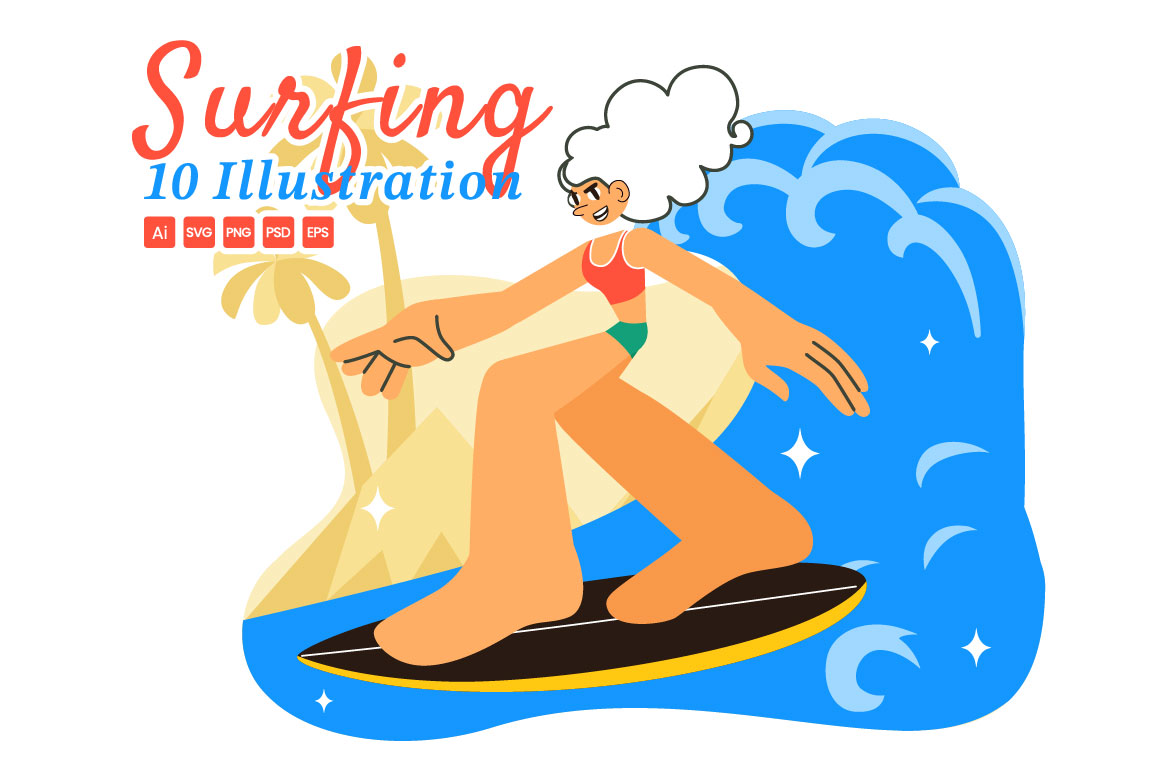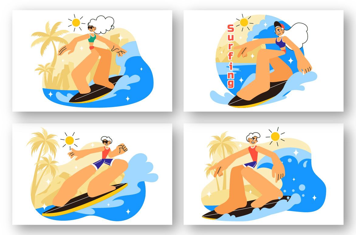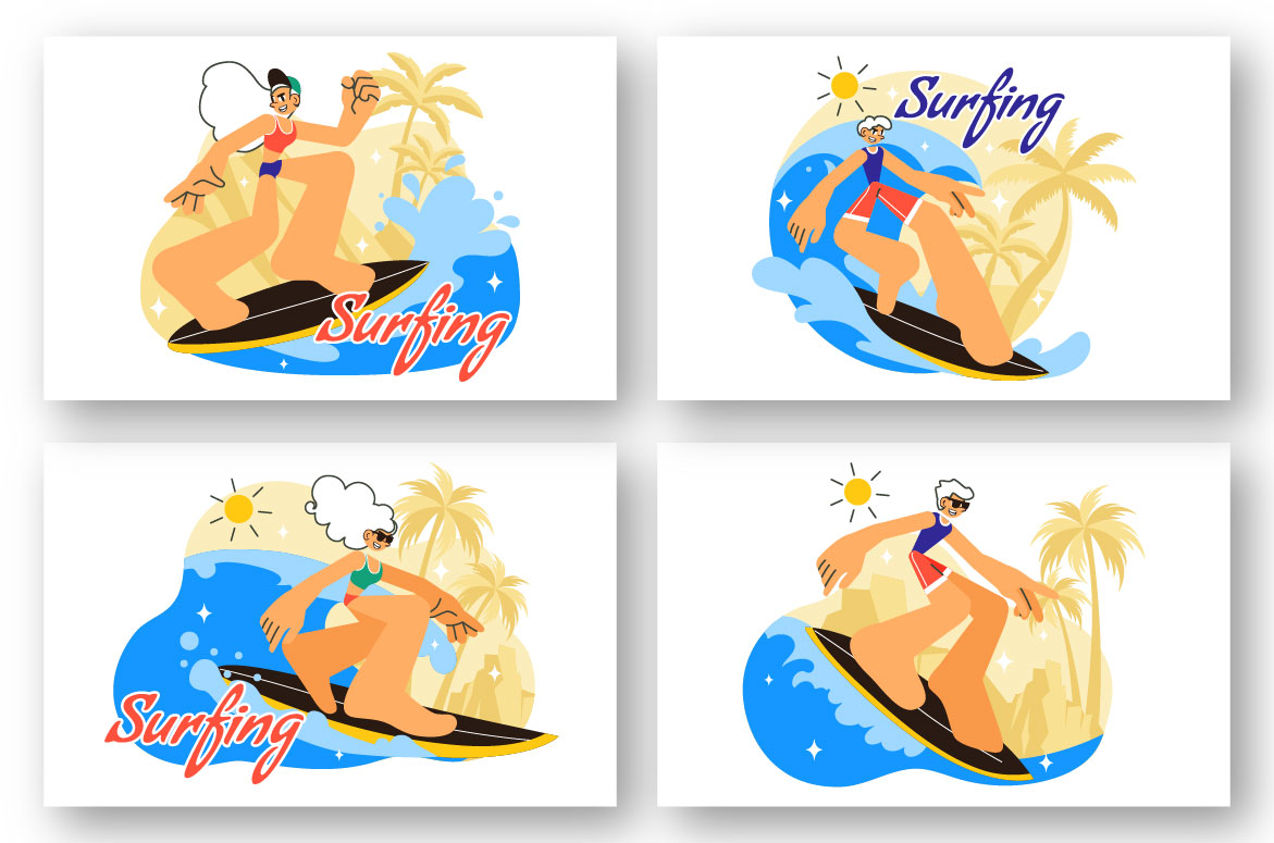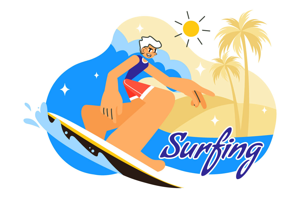 Summer Surfing Vector Illustration of Water Sports Activities, Featuring Surfboards Riding Ocean Waves or Floating in a Flat Style Cartoon Background Suitable for Poster, Web Banner, Brochure, Landing Page and Others Background Template Features:
