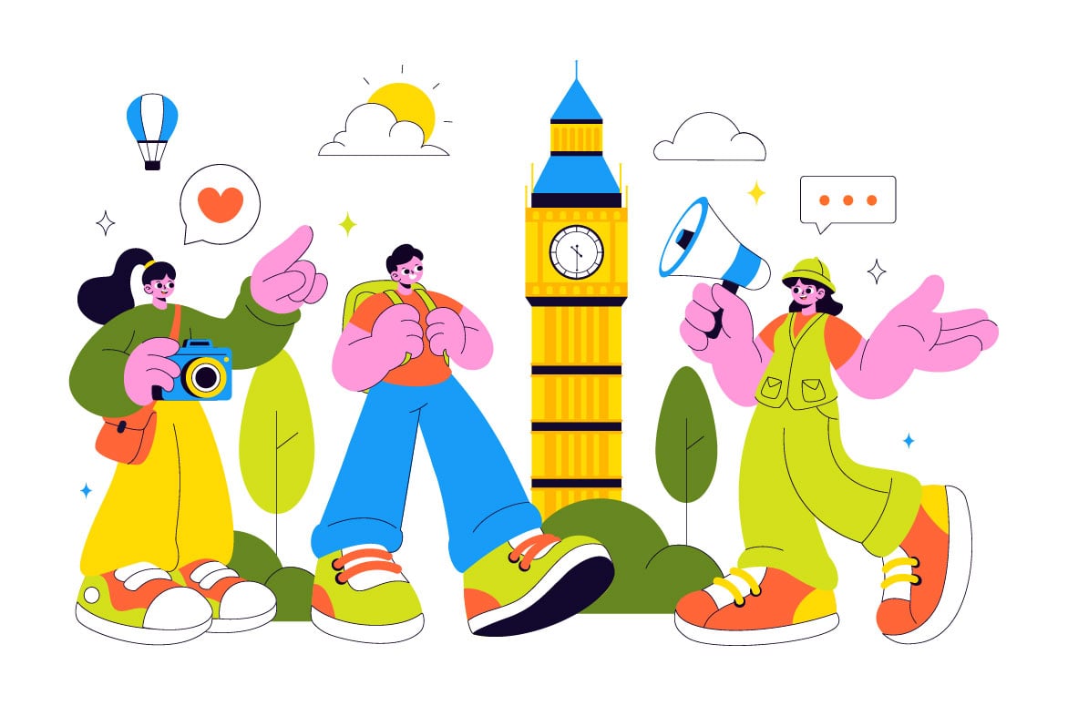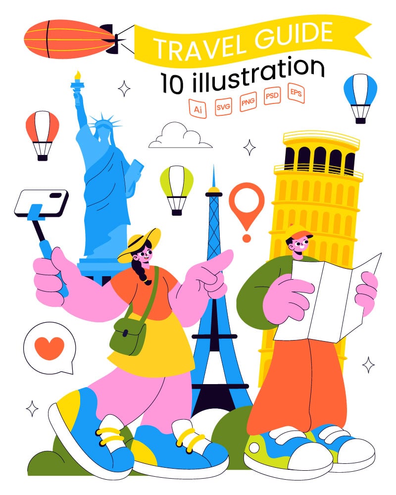 Travel Guide and Tour Vector Illustration Showing Interesting Places to a Group of Tourists for Vacation Planning in a Flat Style Cartoon Background Suitable for Poster, Web Banner, Brochure, Landing Page and Others Background Template Features: