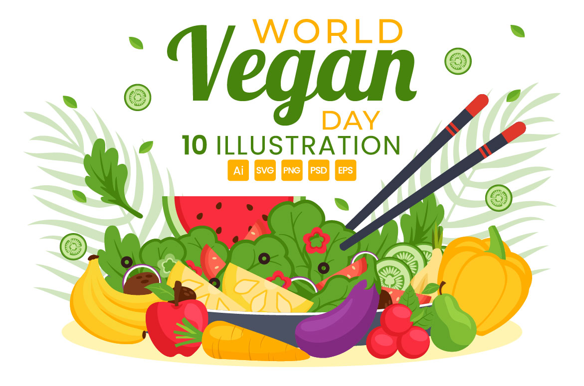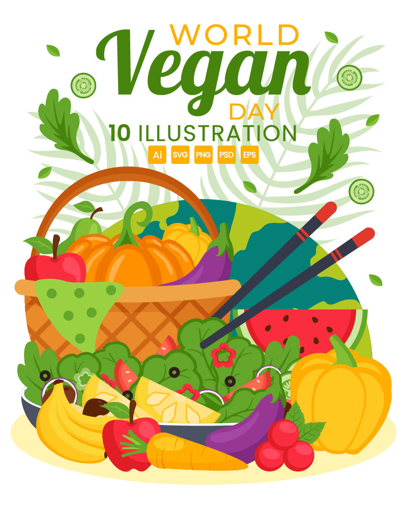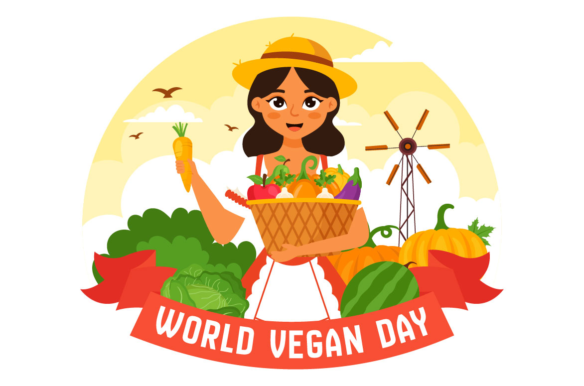 World Vegan Day Vector Illustration featuring a Variety of Vegetables and Fruits to Celebrate the Vegan Lifestyle in a Flat Style Cartoon Background Suitable for Poster, Web Banner, Brochure, Landing Page and Others Background Template Features: