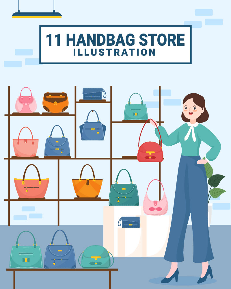 Handbag Store with Collection of Various Quality Bags and Different Types of Lifestyle in Flat Hand Drawn Cartoon Background Illustration Suitable for Poster, Banner, Brochure, Greeting Card and Other Template Features: