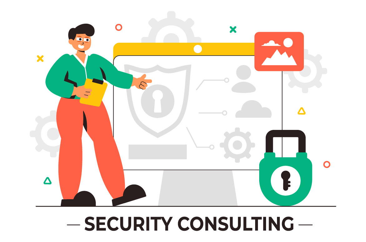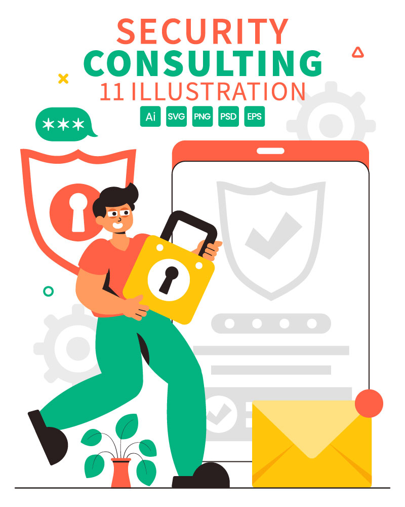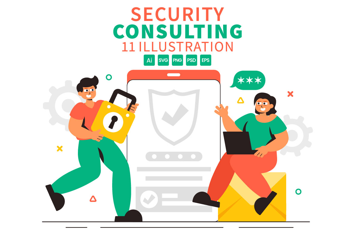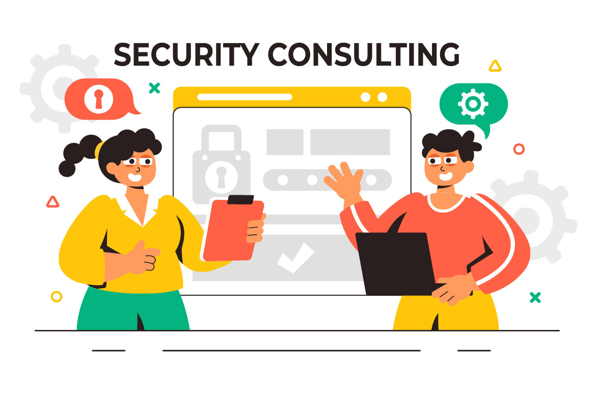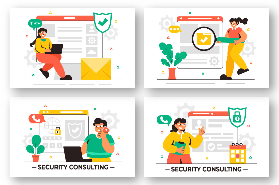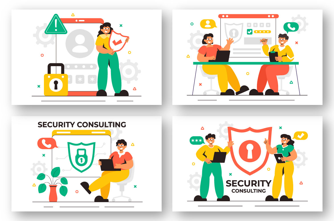 Security Consulting Illustration Featuring Information Technology and Ethical Hackers Conducting Testing, Development, and Cybersecurity Consulting Suitable for Poster, Web Banner, Brochure, Landing Page and Others Background Template Features: