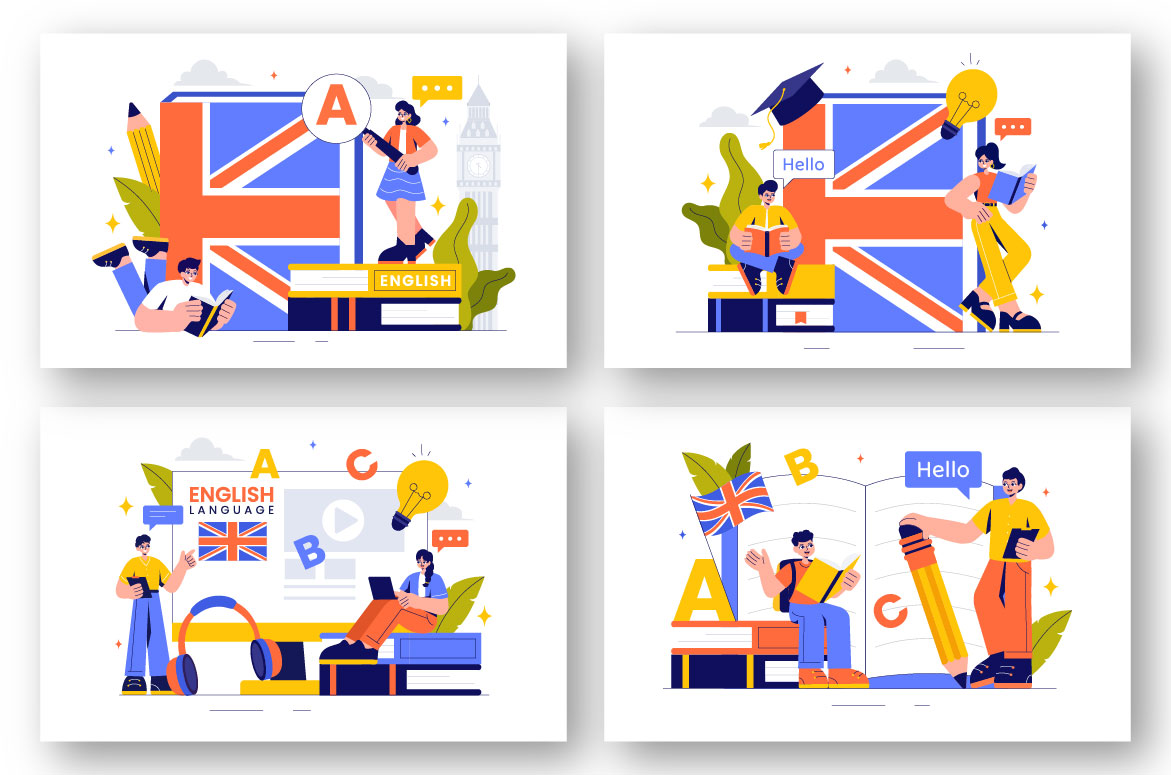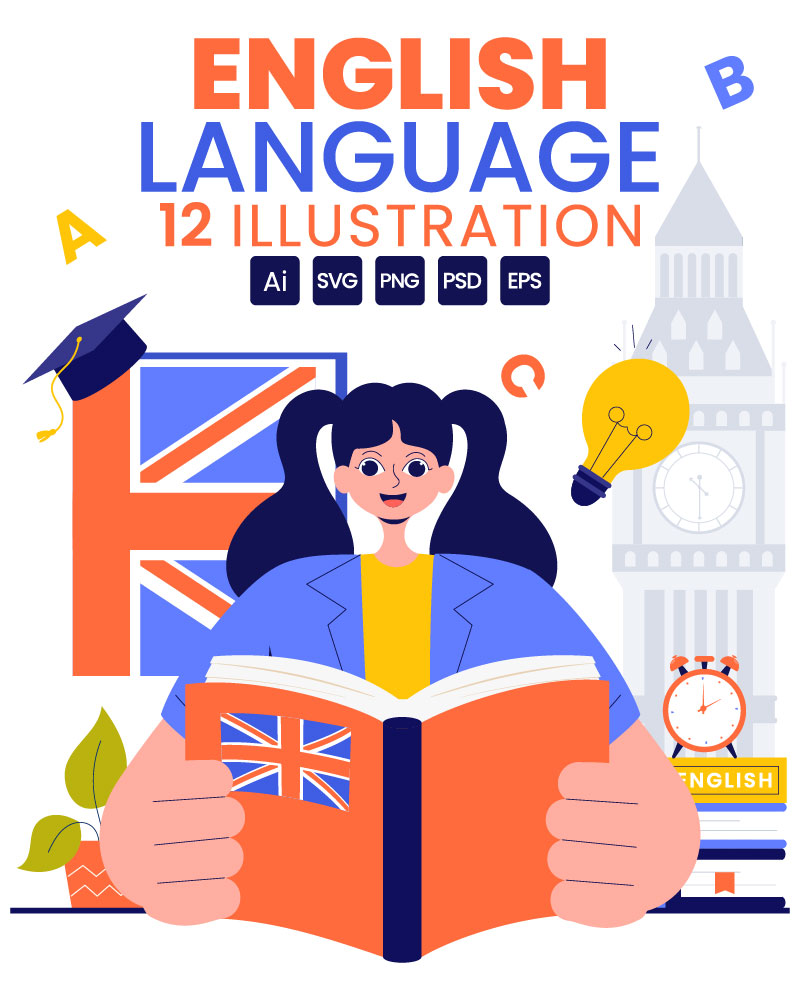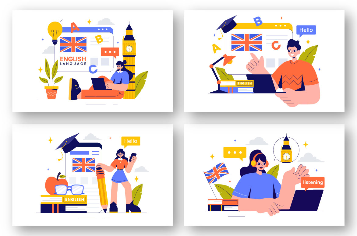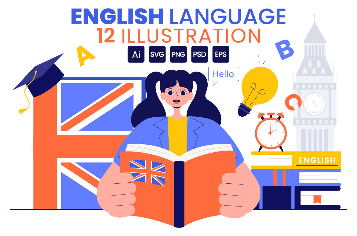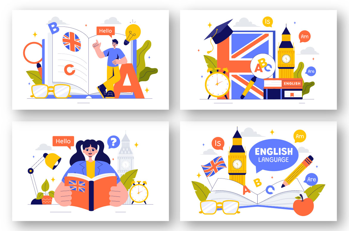 English Language Vector Illustration featuring Students Studying Foreign Languages, Global Communication, and Elementary Grammar Lessons Background Suitable for Poster, Web Banner, Brochure, Landing Page and Others Background Template Features: