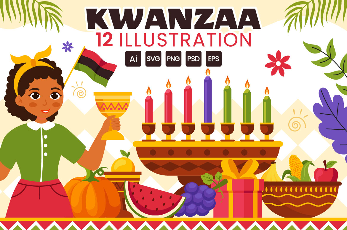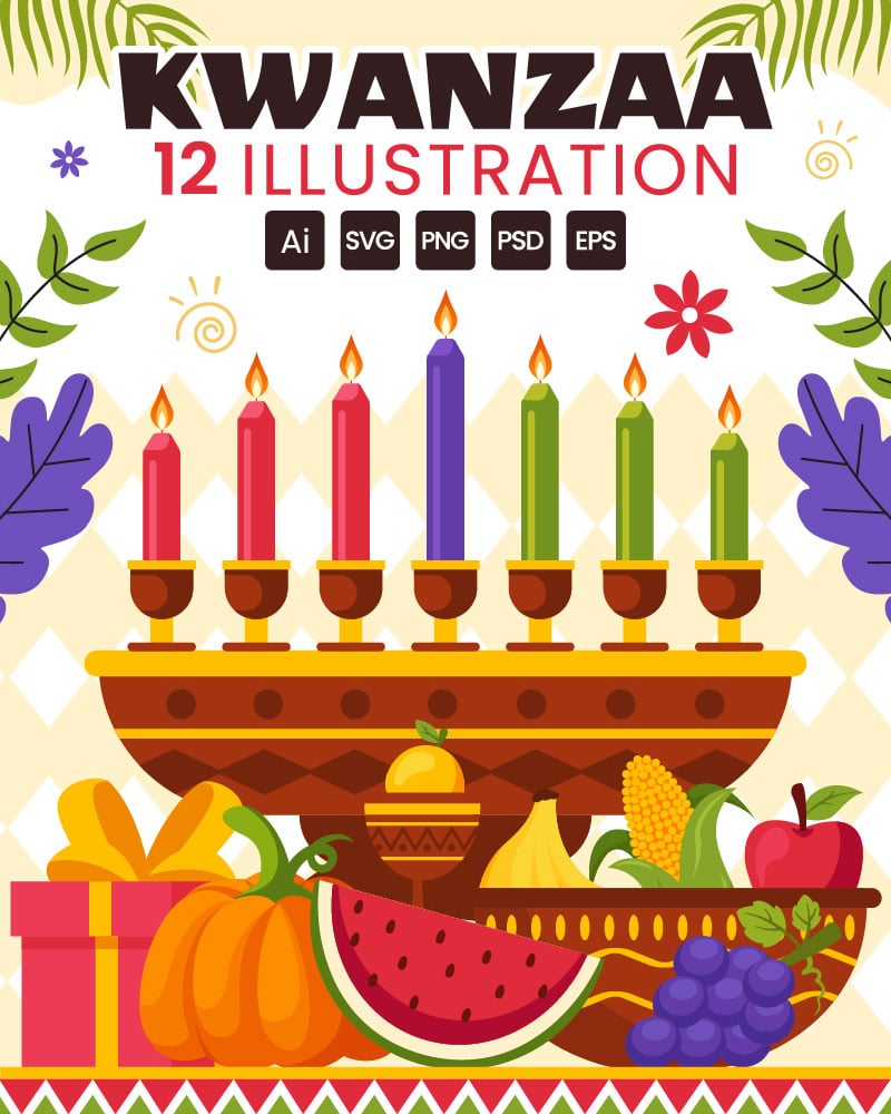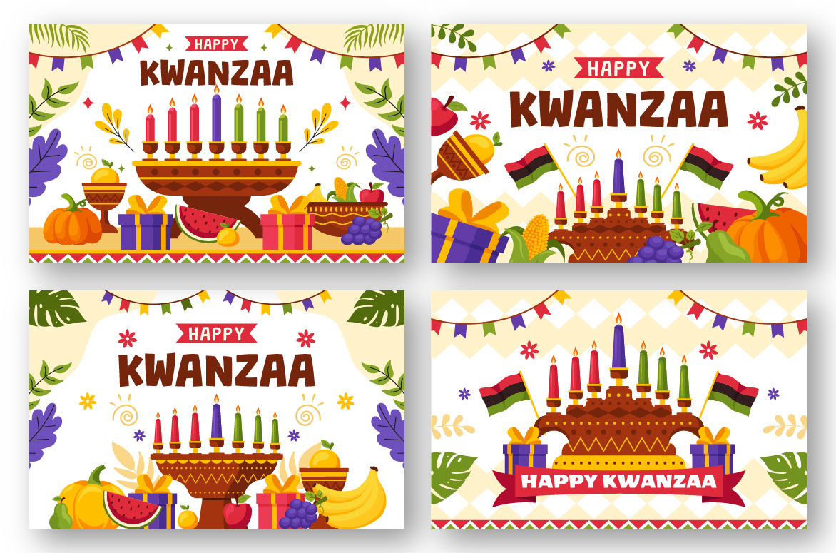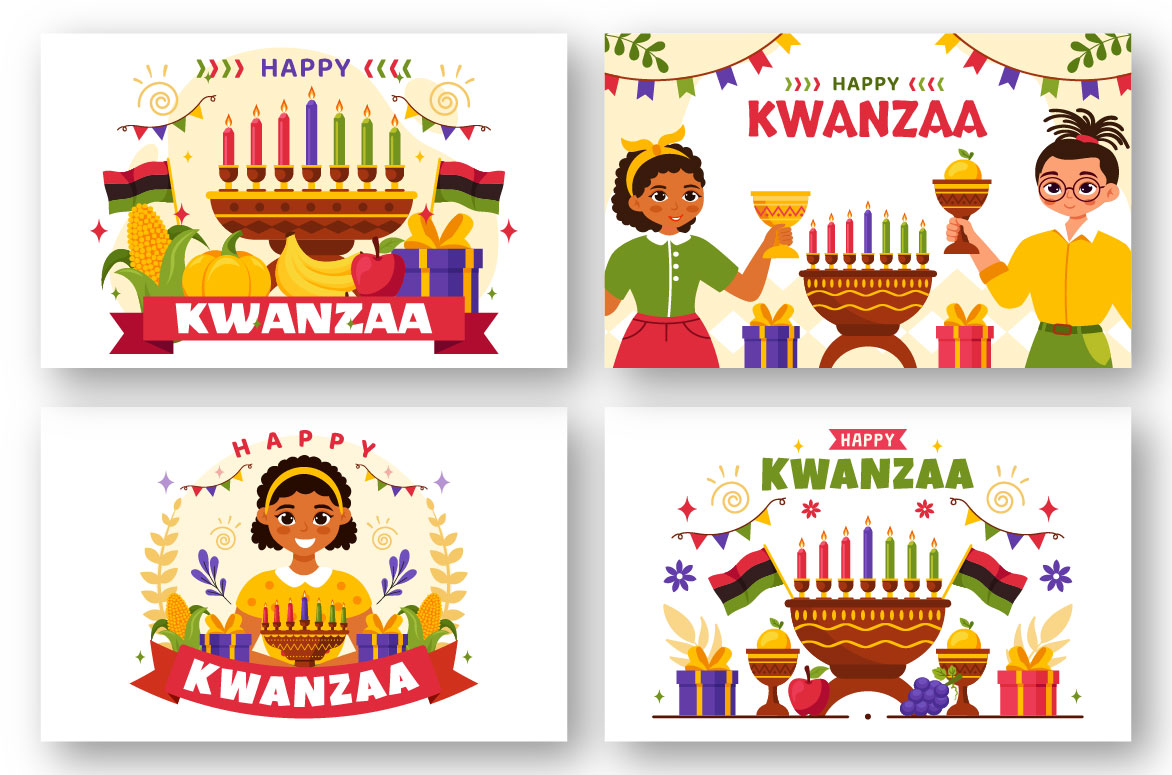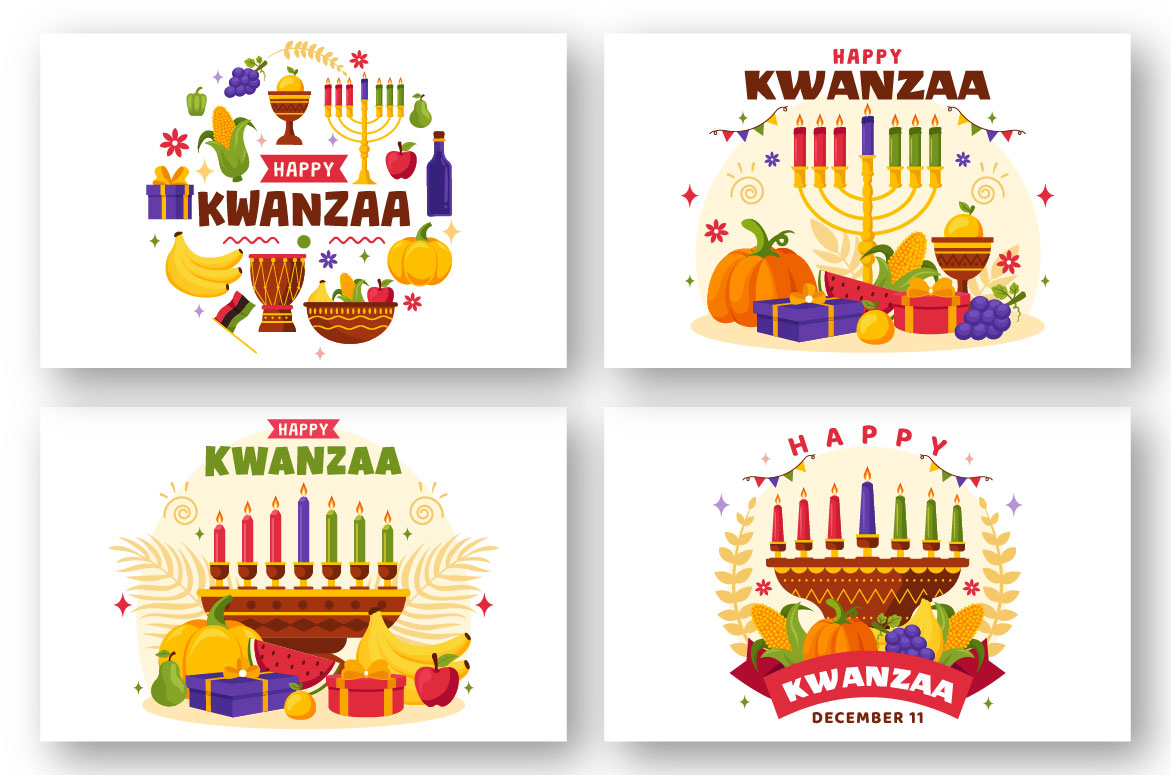 Happy Kwanzaa Vector Illustration Featuring Mazao, Zawadi, Mkeka, Kinara, Gifts, and Candles as Traditional African Holiday Symbols in a Flat Style Cartoon Background Suitable for Poster, Web Banner, Brochure, Landing Page and Others Background Template Features: