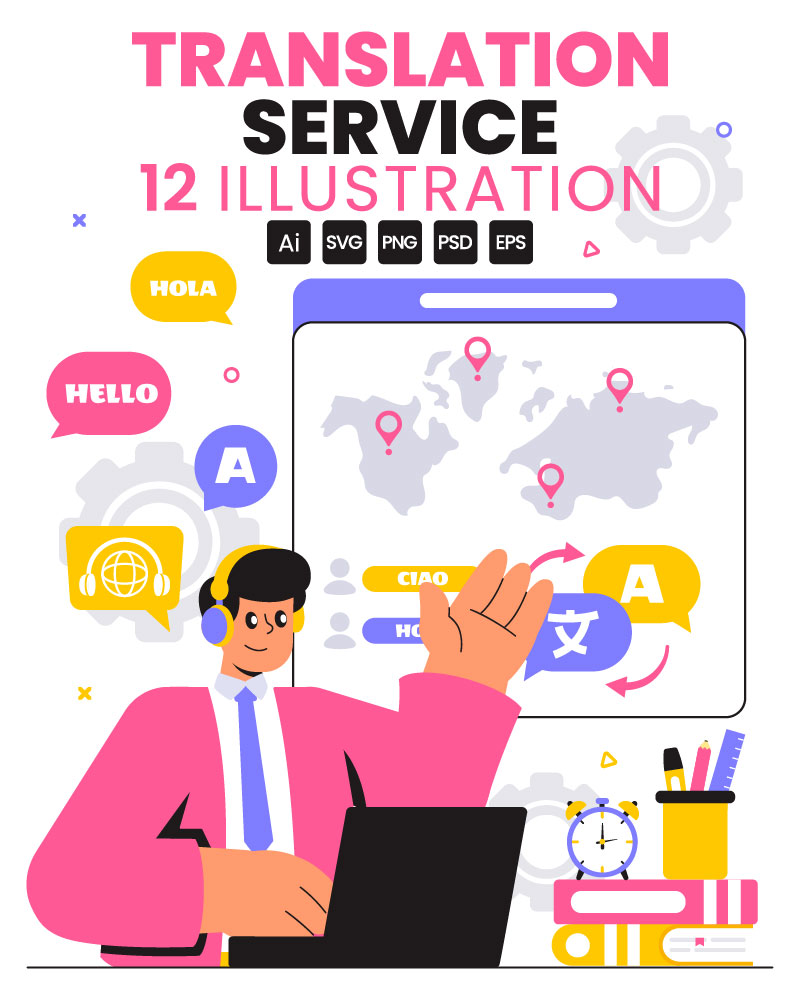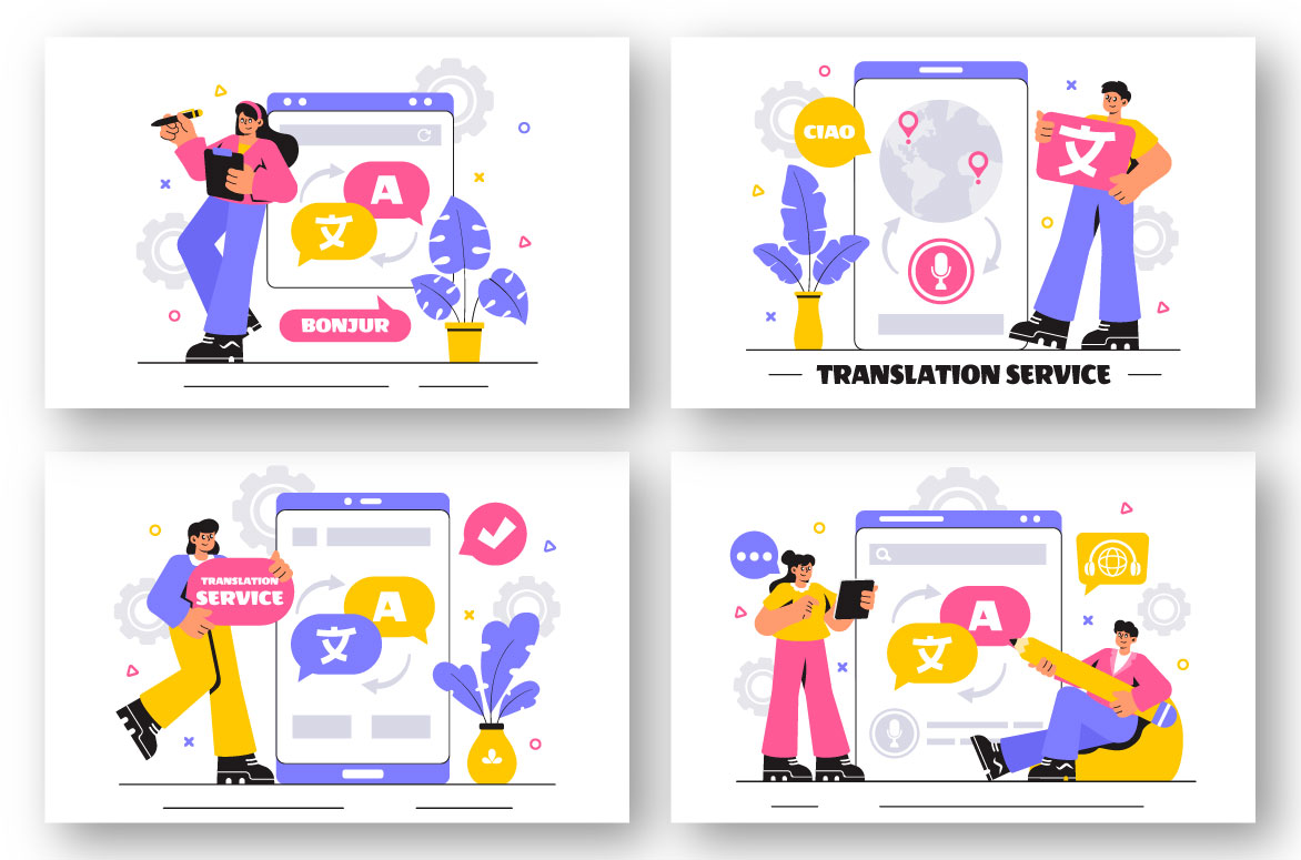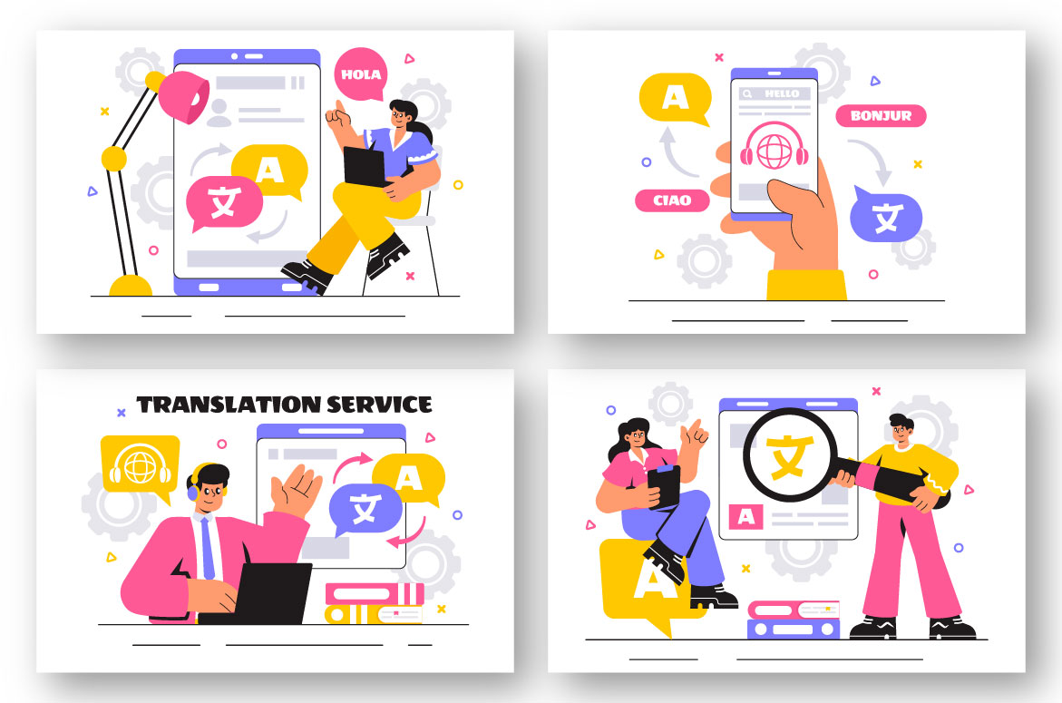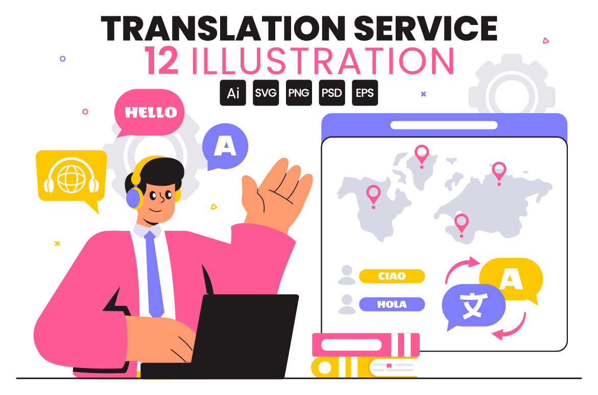 Translator Service Vector Illustration Featuring Multilanguage Translation for Various Countries Using a Dictionary in a Flat Style Cartoon Background Suitable for Poster, Web Banner, Brochure, Landing Page and Others Background Template Features:
