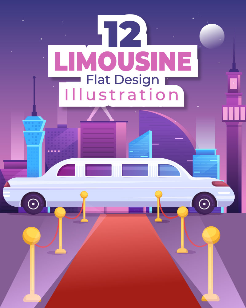 VIP Limousine Car of Red Carpet for Celebrity Superstar Walk with Night City Landscape View in Flat Cartoon Illustration. Limousine Car with Night City Urban View and Luxury Metropolis Concept. Limousine Car with Sunset or Sunrise Views on the Beach. Limousine on Wedding Ceremony with Pictures of Car, Men and Women Wearing Married Dresses. VIP Taxi Limousine Car for Distinguished or Important Guests. Template Features: