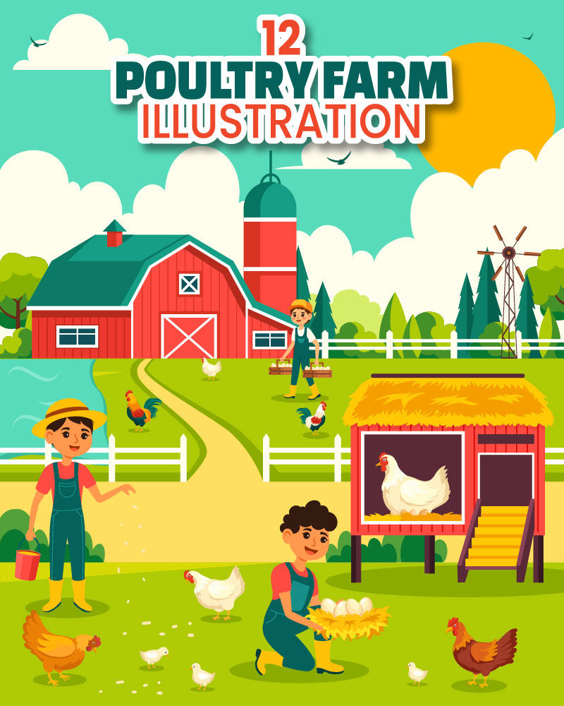 Poultry Farm Vector Illustration with Chickens, Roosters, Straw, Cage and Egg on Scenery of Green Field in Flat Cartoon Background Design Suitable for Poster, Web Banner, Brochure, Landing Page and Others Background Template Features: