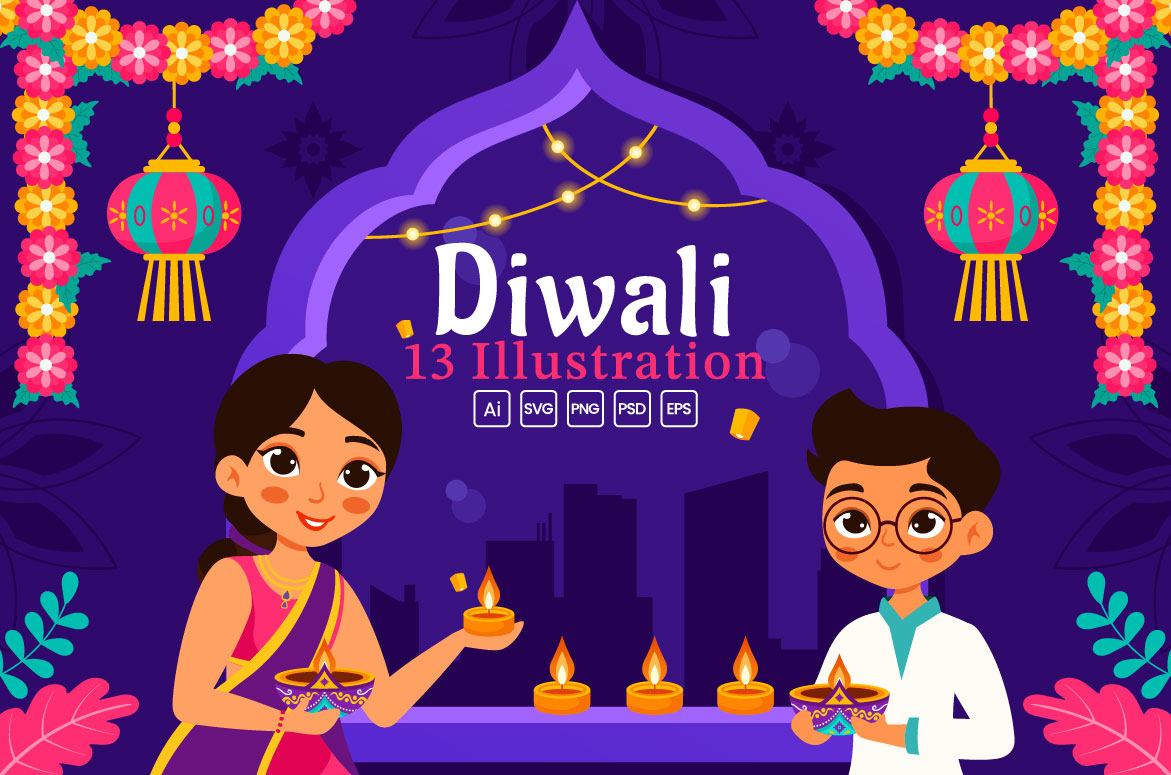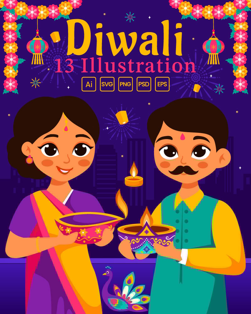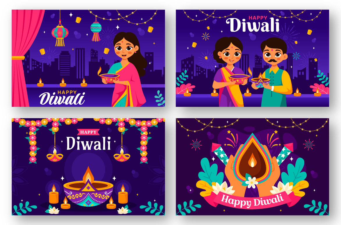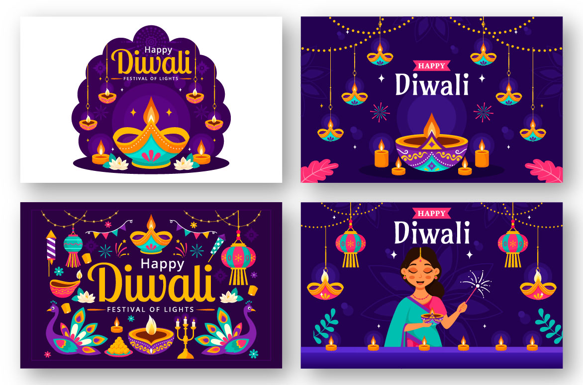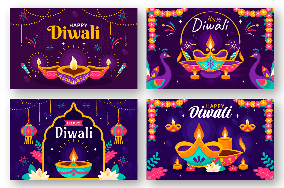 Diwali Festival of Lights Vector Illustration featuring Traditional Indian Rangoli Decoration, Festive Lamp and Fireworks in a Holiday Flat Background Suitable for Poster, Web Banner, Brochure, Landing Page and Others Background Template Features: