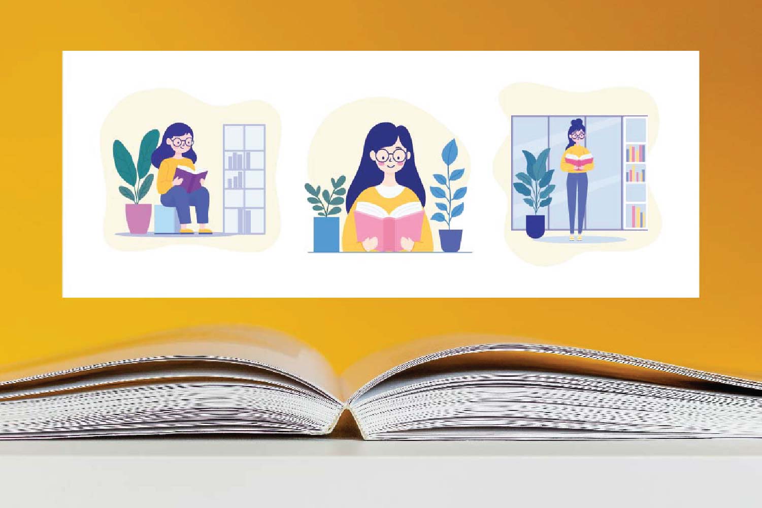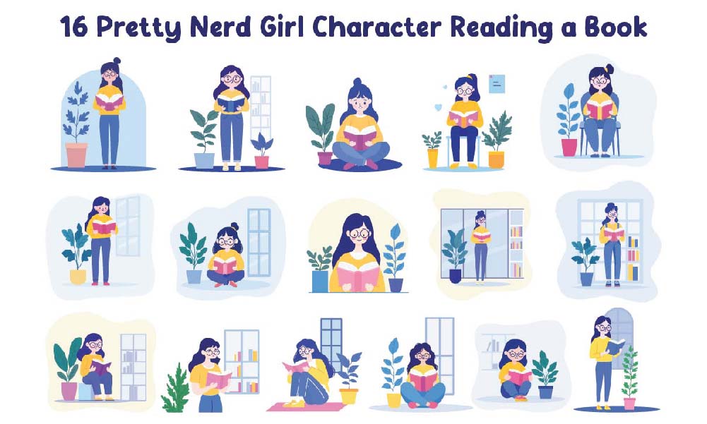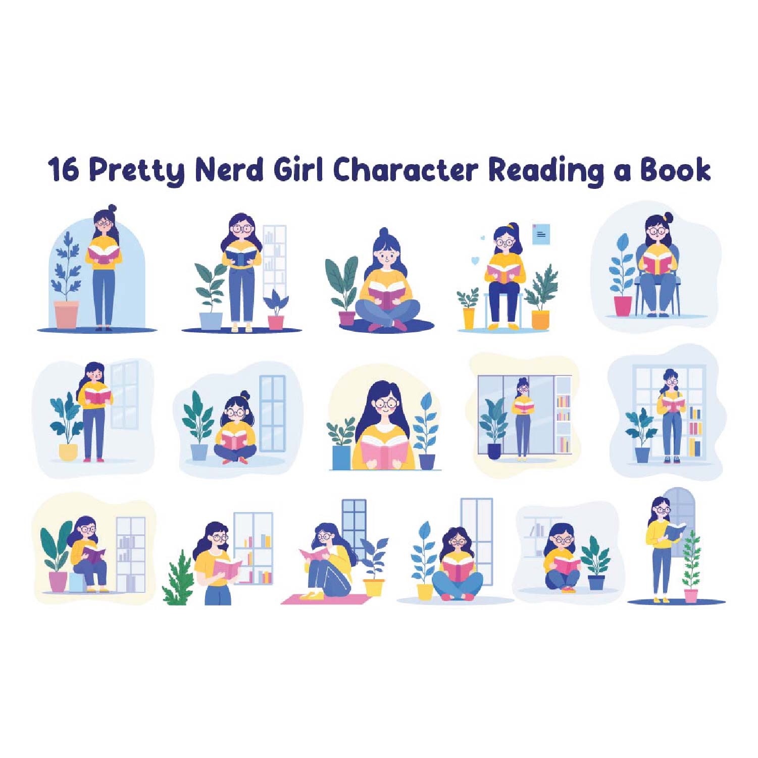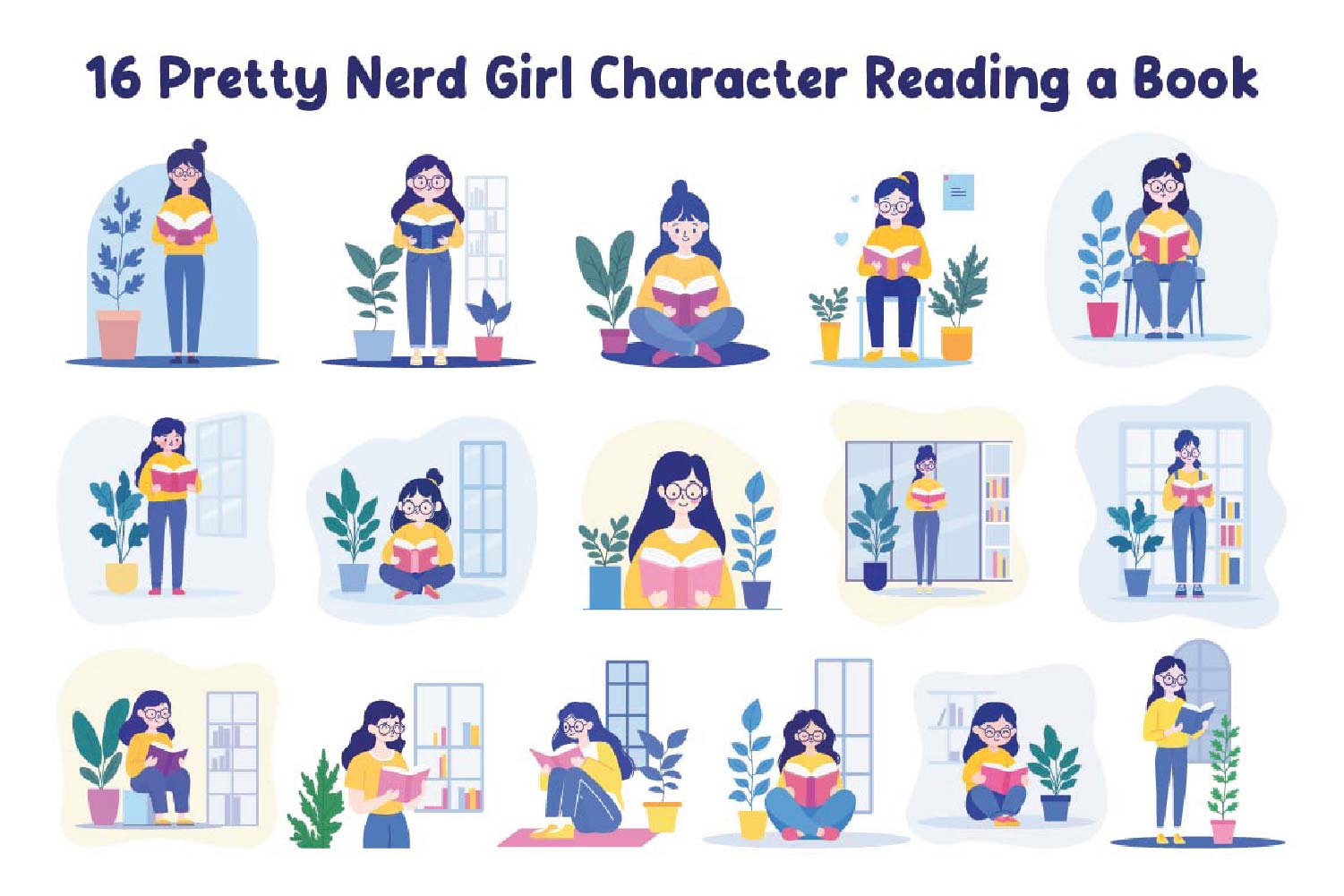 16 Pretty Nerd Girl Character Reading a Book Illustration