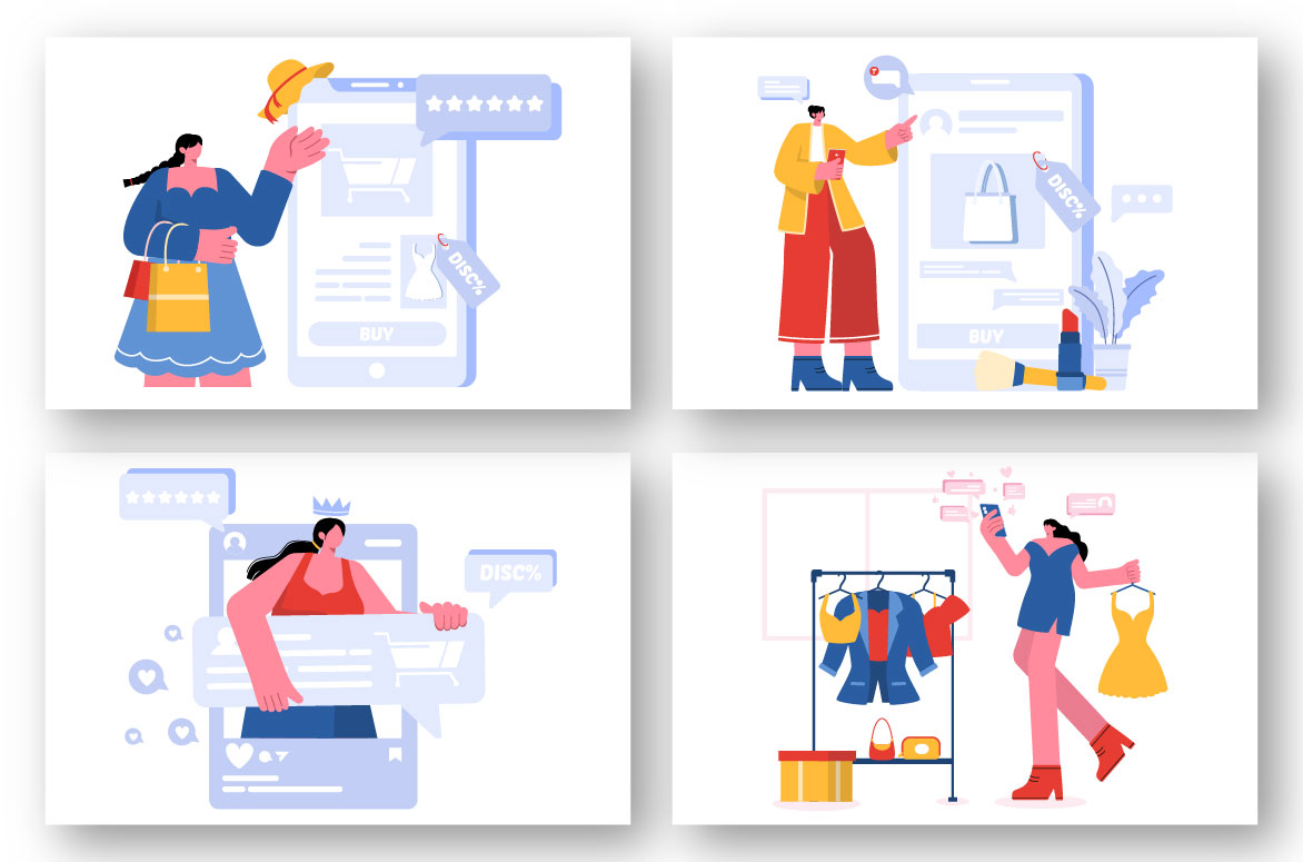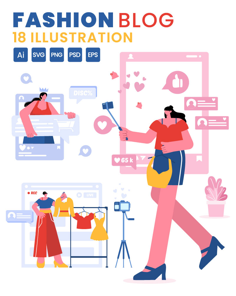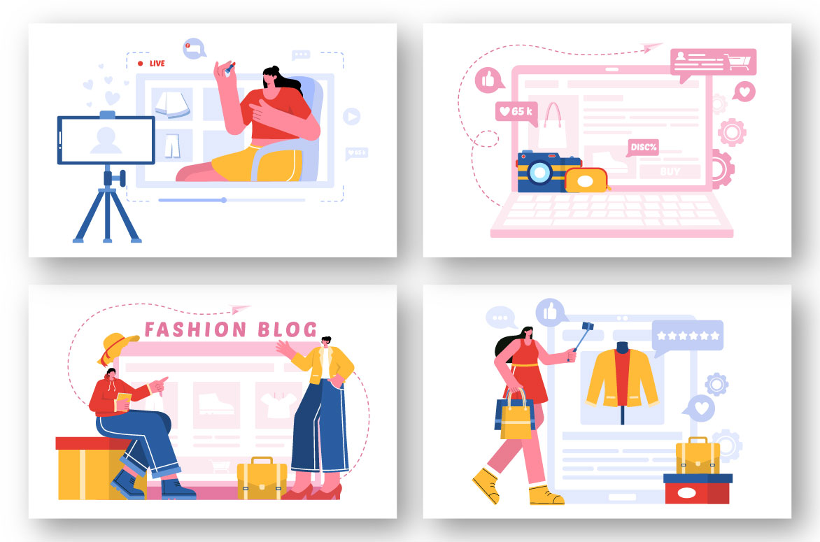 Vector Illustration for a Fashion Blog with Bloggers Reviewing Videos of Fashionable Clothing Trends, Featuring an Online Runway in a Flat Background Suitable for Poster, Web Banner, Brochure, Landing Page and Others Background Template Features:
