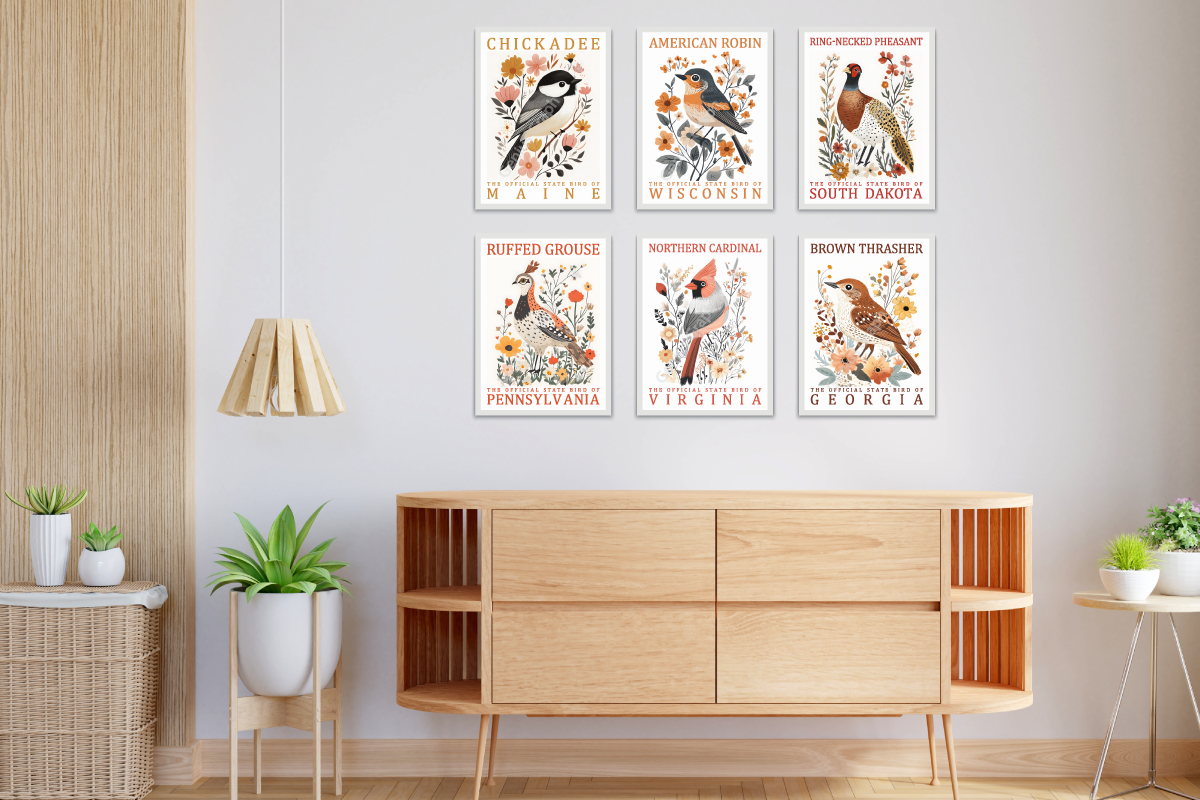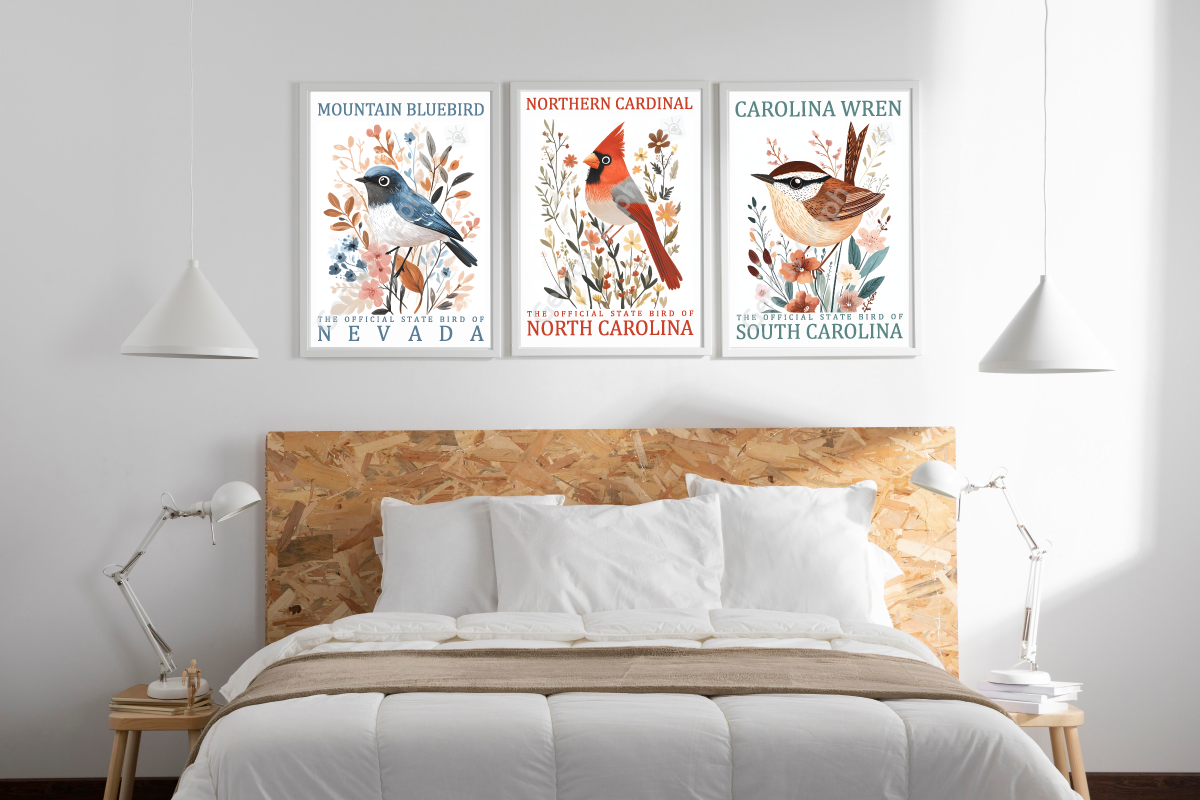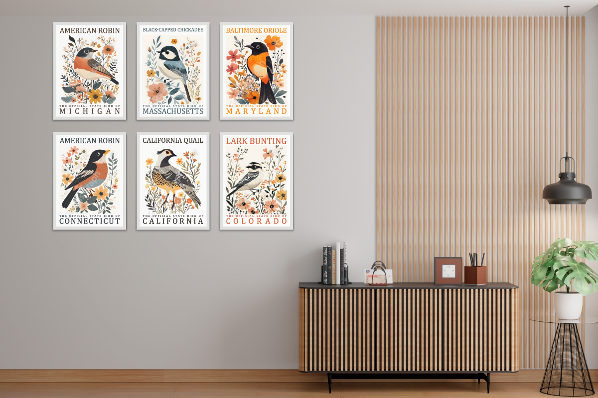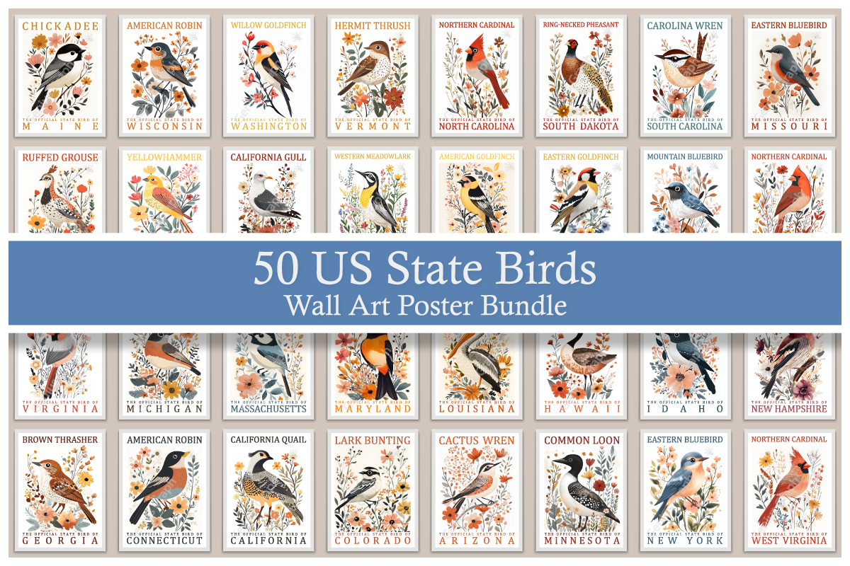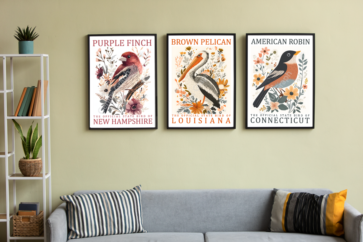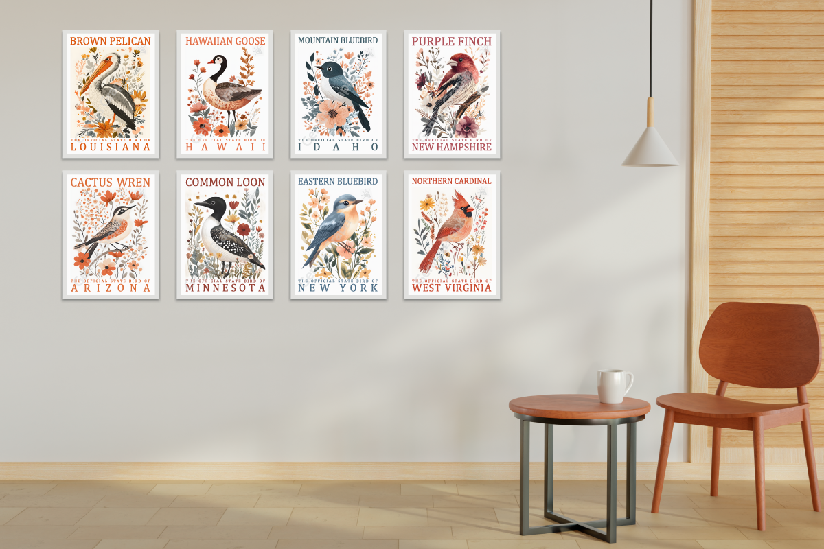 U.S 50 State Bird Wall Art Poster Bundle | State Bird Canvas Print | living room decor.