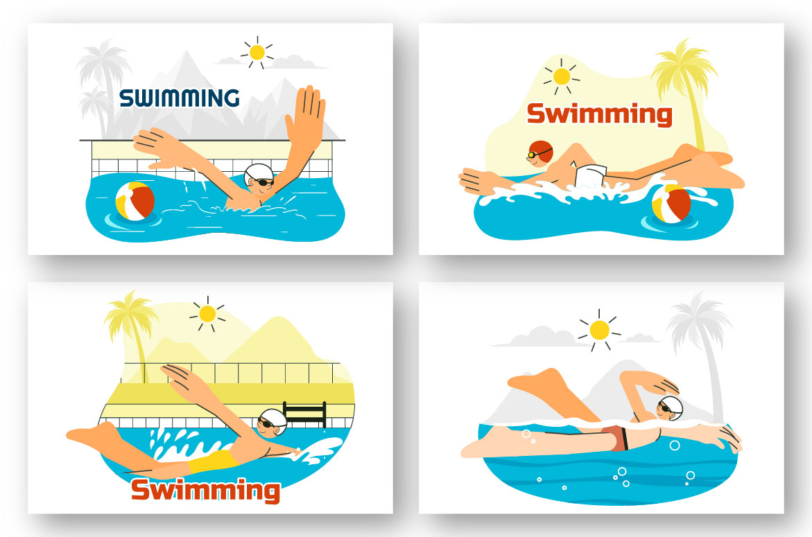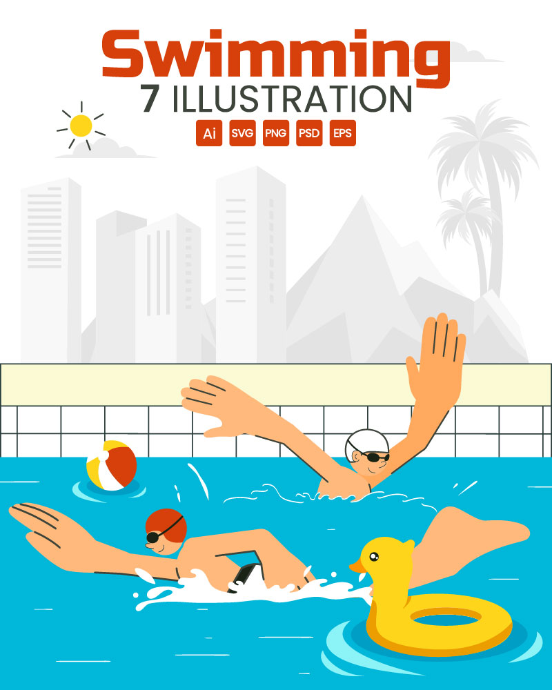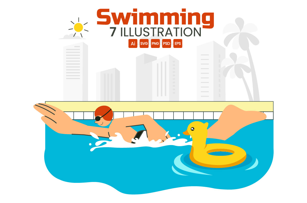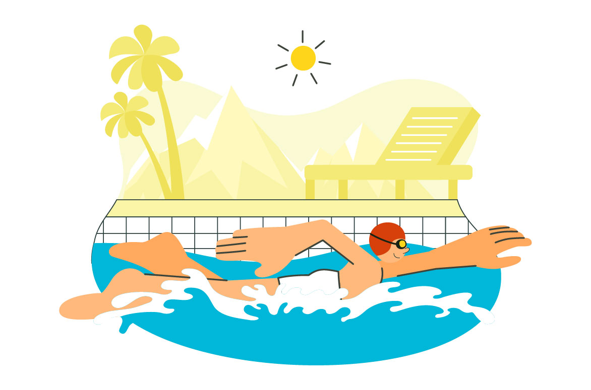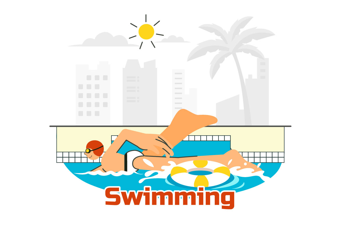 Swimming Pool Vector Illustration featuring a Summer Vacation Landscape Concept with Swimming Activities, Water Sports, and Fun Recreation Suitable for Poster, Web Banner, Brochure, Landing Page and Others Background Template Features: