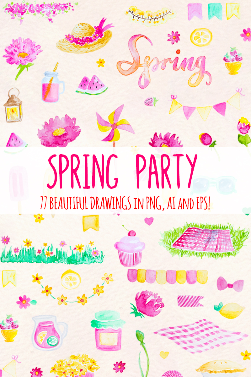 This pack contains 77 themed drawings/paintings including picnics, flowers, lemonade and bunting. The PNGs are the original hand drawn scans and the EPS and AI files are slightly smoothed versions for accurate scaling.