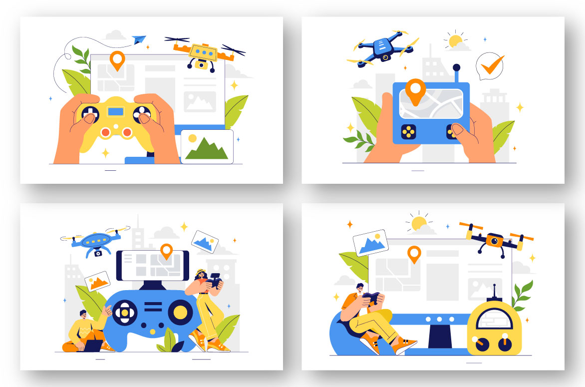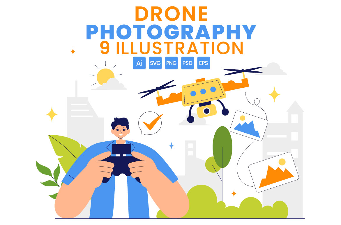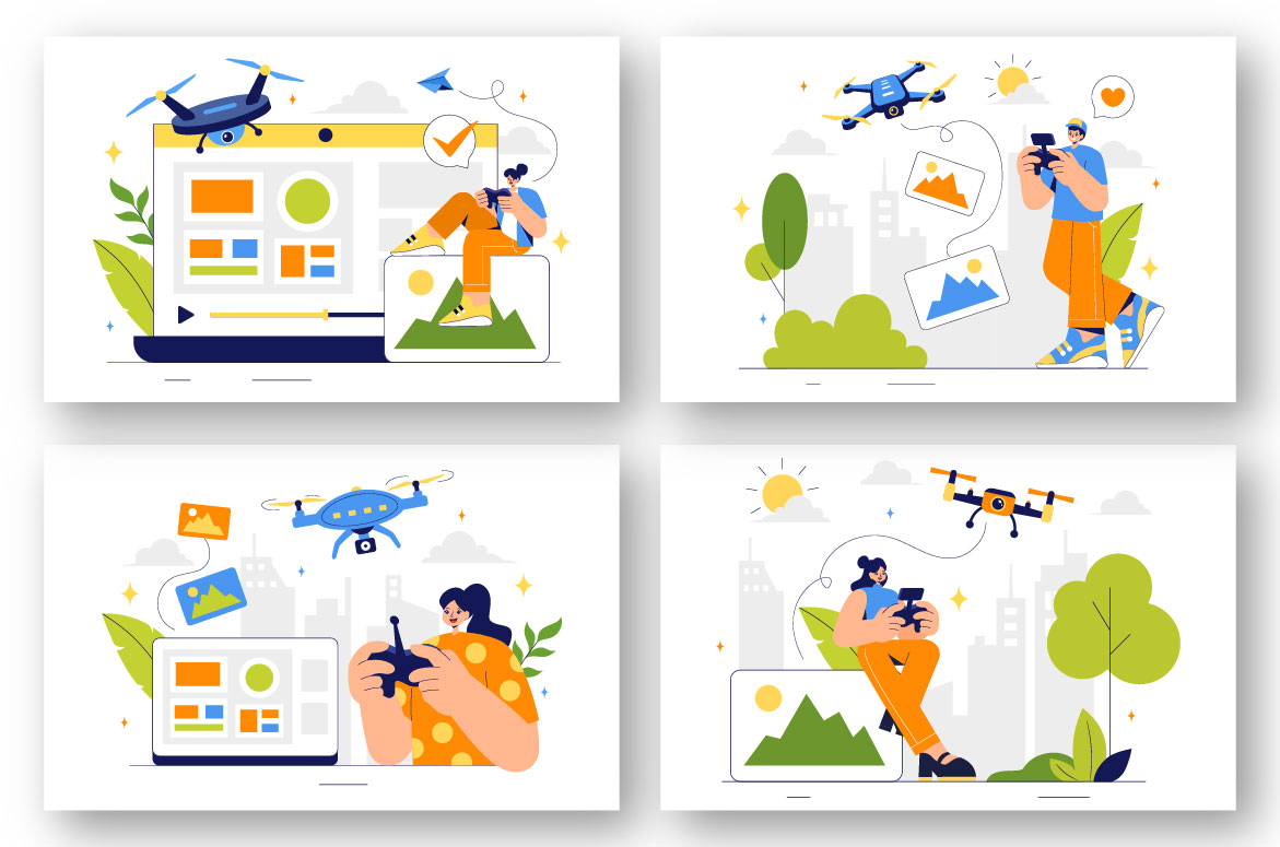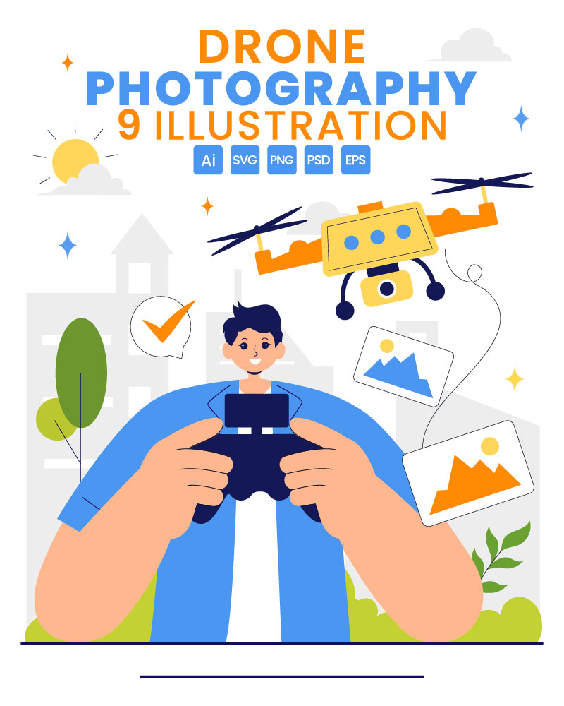 Drone Photography Vector Illustration featuring a Drone with a Remote Control, Capturing Aerial Photos and Videos from Above in a Flat Background Suitable for Poster, Web Banner, Brochure, Landing Page and Others Background Template Features: