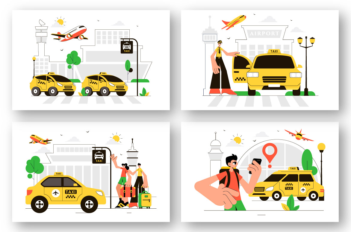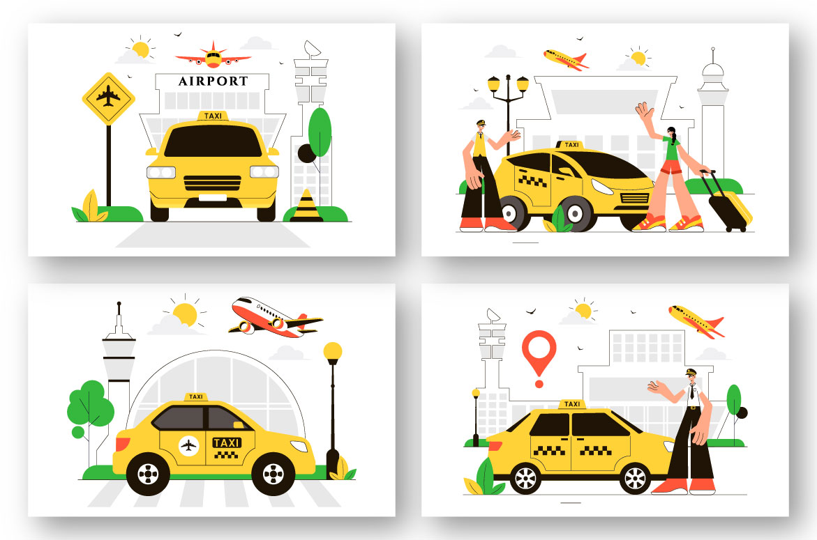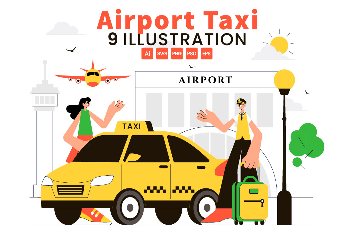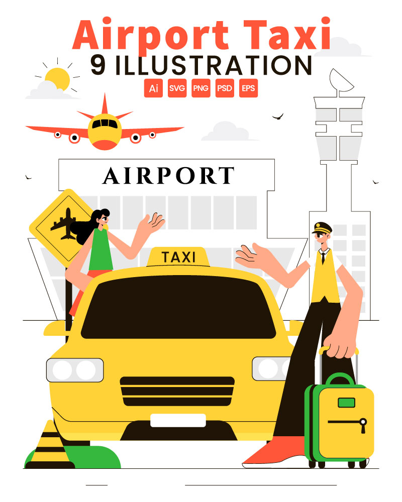 Airport Taxi Service Vector Illustration Showing Passenger Transfer with Luggage from the Airport to Destination in a Flat Style Cartoon Background Suitable for Poster, Web Banner, Brochure, Landing Page and Others Background Template Features: