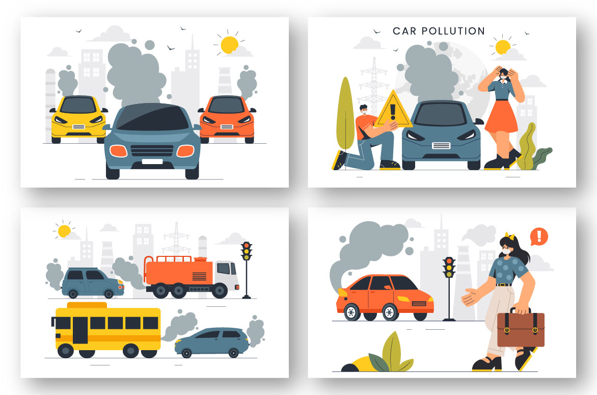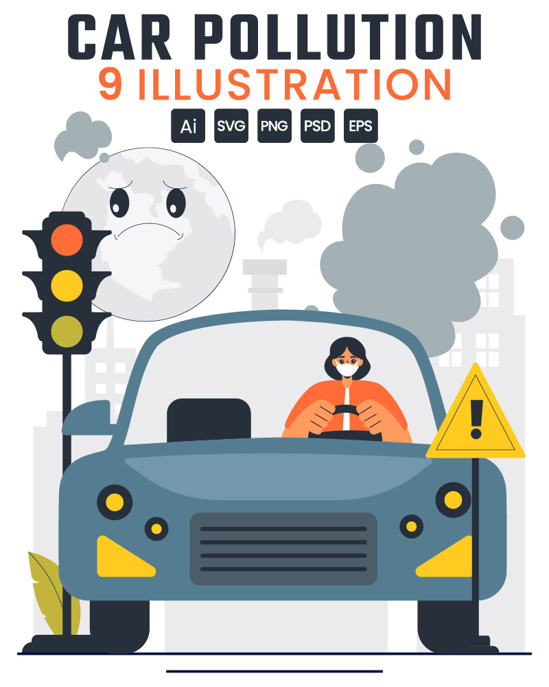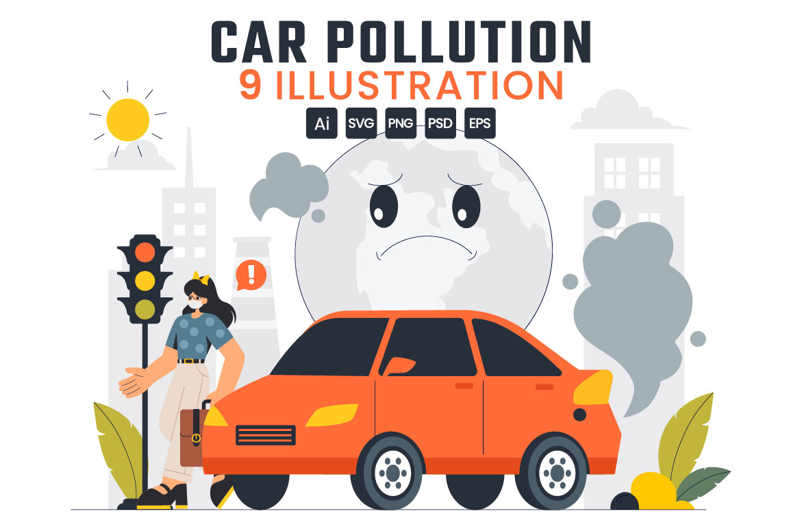 Car Air Pollution Vector Illustration featuring a Polluted Urban Environment, Vehicle Traffic, and Toxic Emissions from Automobiles and Transportation Suitable for Poster, Web Banner, Brochure, Landing Page and Others Background Template Features: