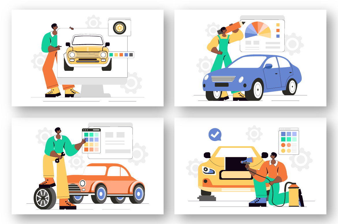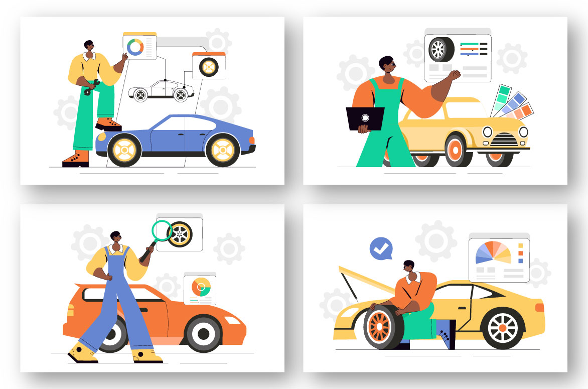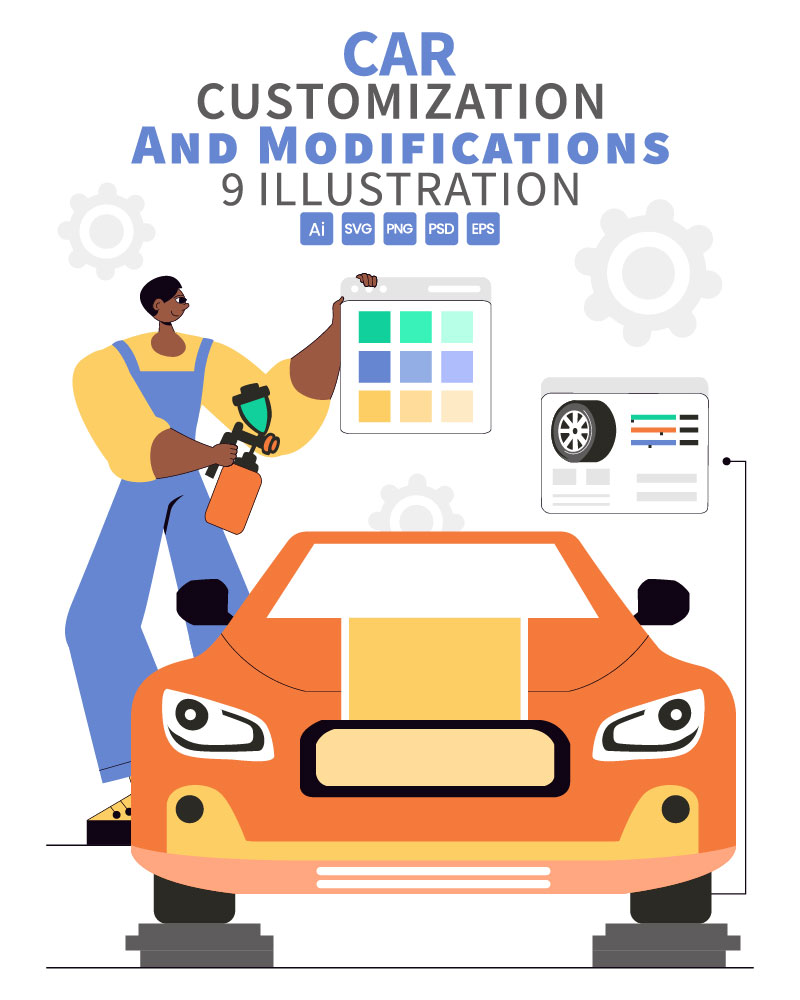 Car Customization and Modifications Vector Illustration featuring a Tuned Automobile with Upgraded Wheels, Nitrous Systems, and Body Kit Enhancements Suitable for Poster, Web Banner, Brochure, Landing Page and Others Background Template Features: