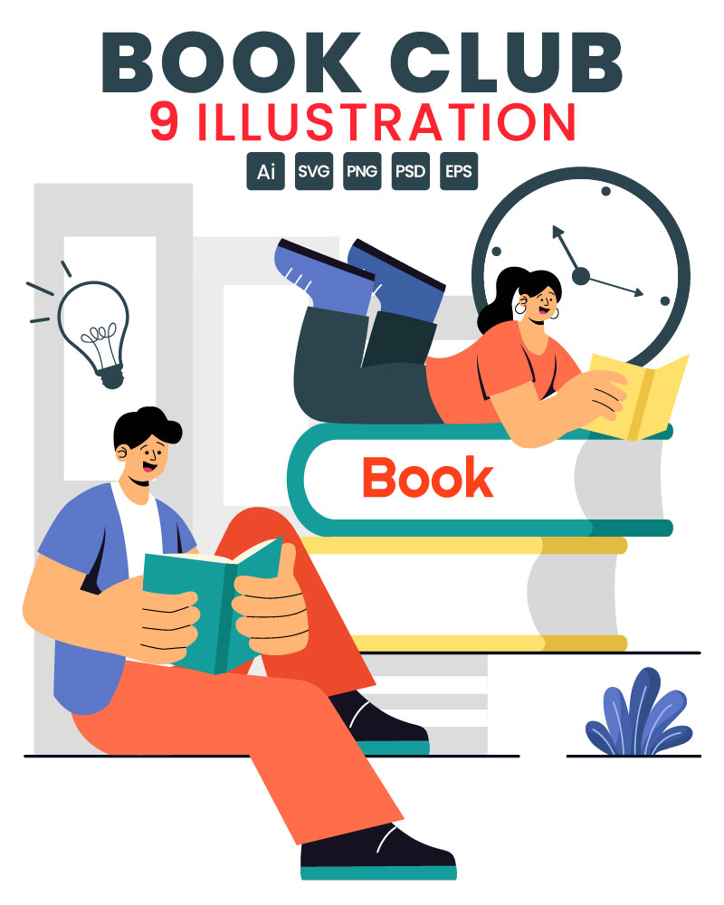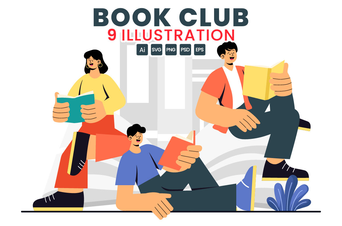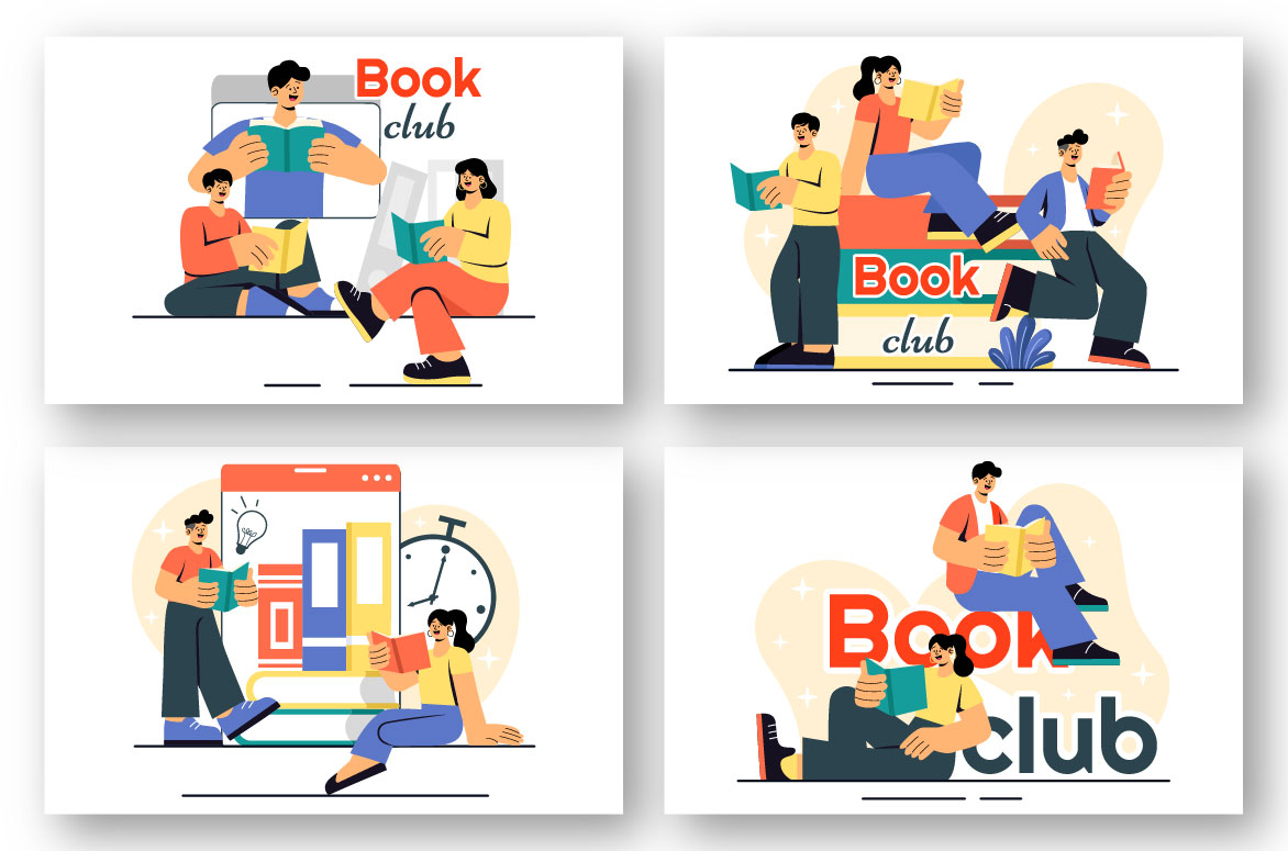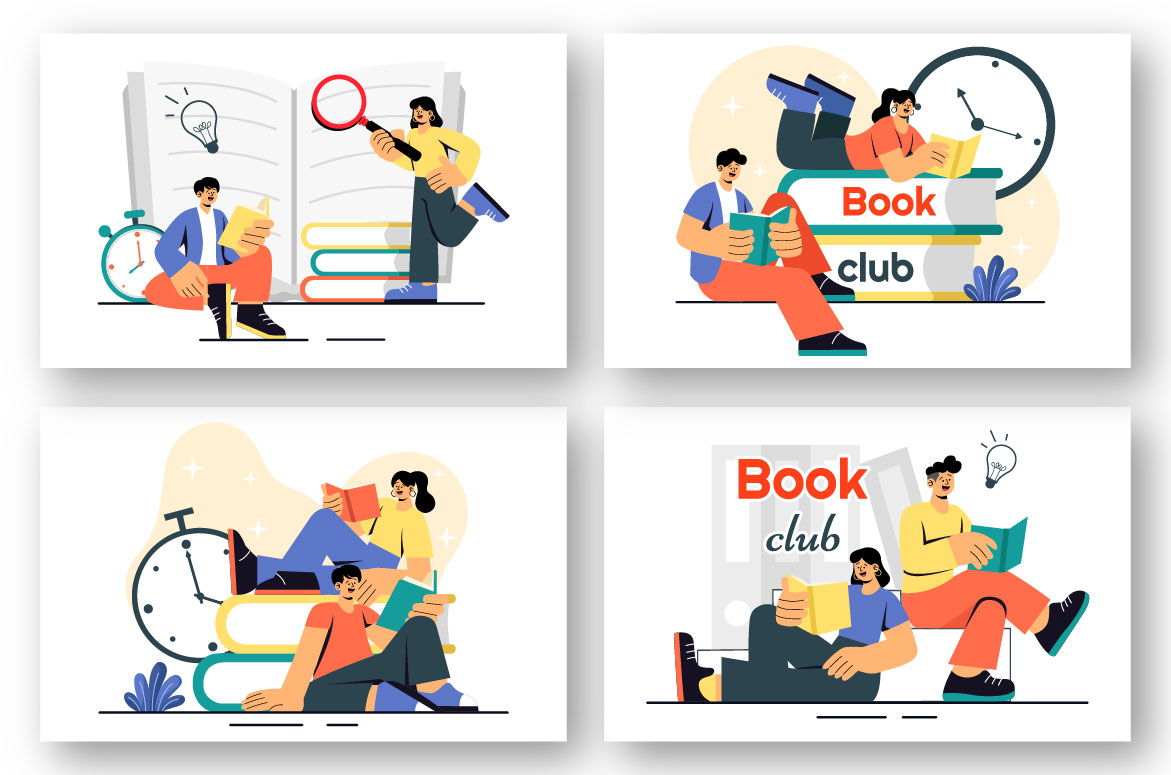 Book Club Vector Illustration featuring a Group of Men and Women Reading Together, Sharing Literature, and Fostering Education and Self-Development Suitable for Poster, Web Banner, Brochure, Landing Page and Others Background Template Features: