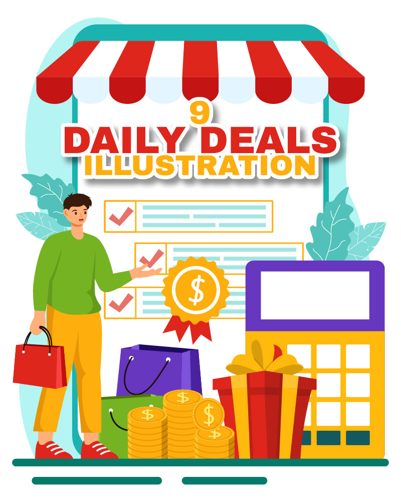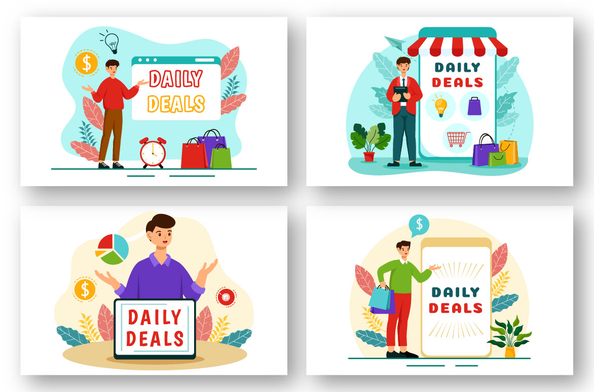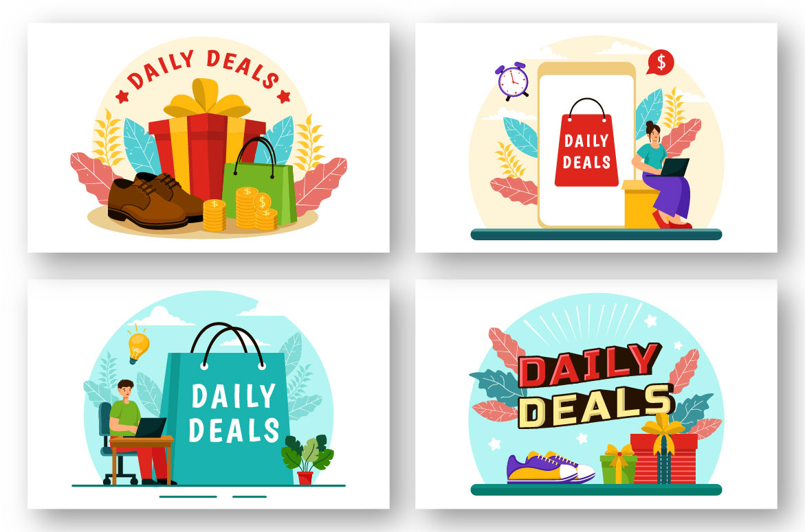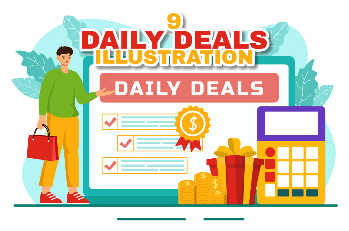 Daily Deals Vector Illustration featuring Shopping Goods and Hunting for Discounts set against a Flat Cartoon Style Background Suitable for Poster, Web Banner, Brochure, Landing Page and Others Background Template Features: