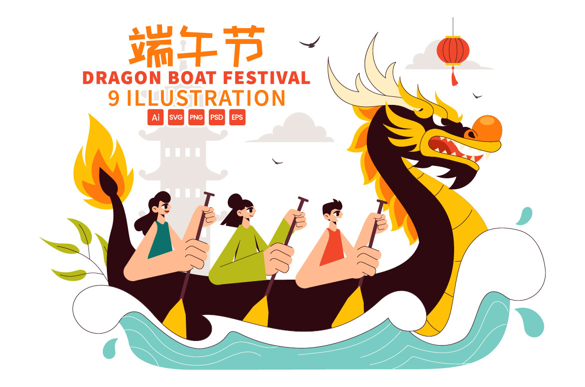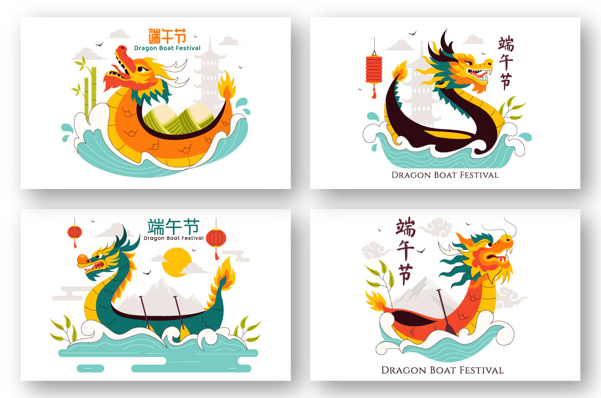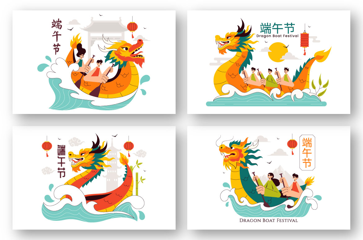 Duanwu Translation: Dragon Boat Festival Vector Illustration featuring a Dragon Boat Race on the River, Participated by Several People in a Background Suitable for Poster, Web Banner, Brochure, Landing Page and Others Background Template Features: