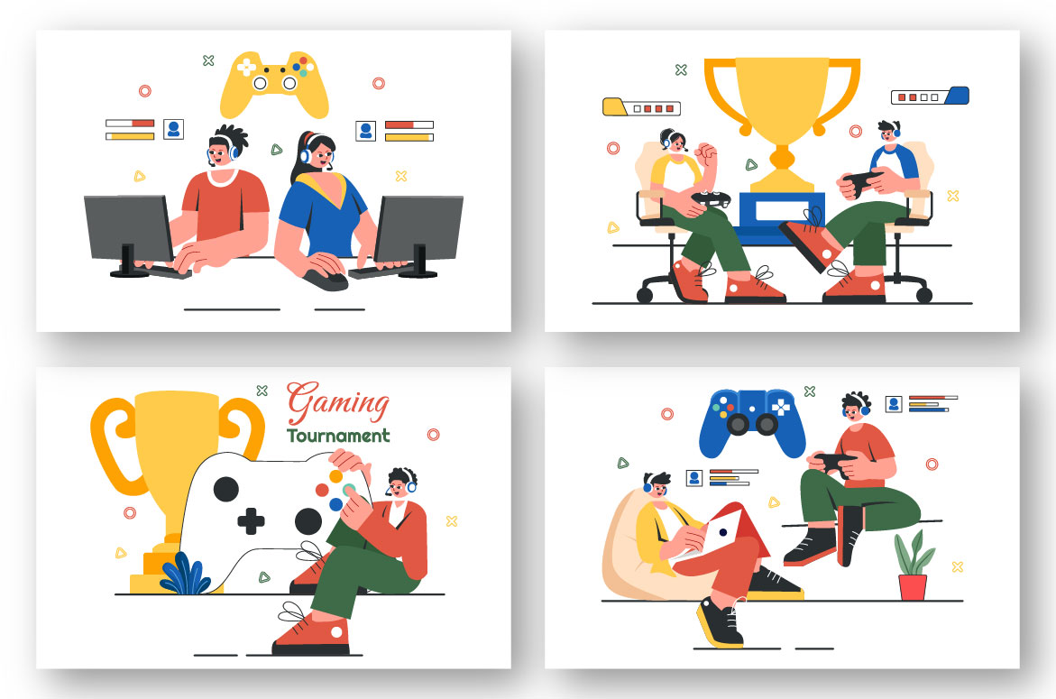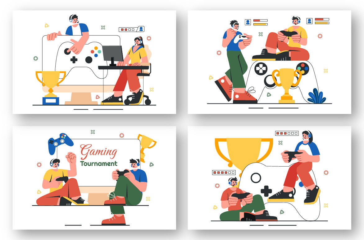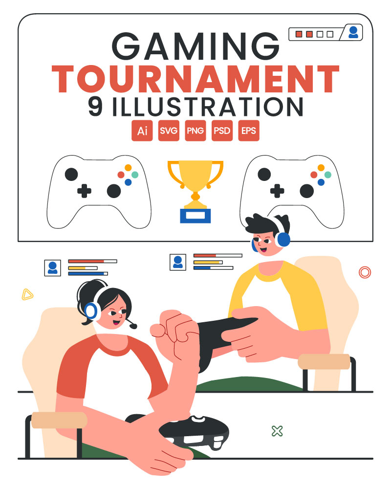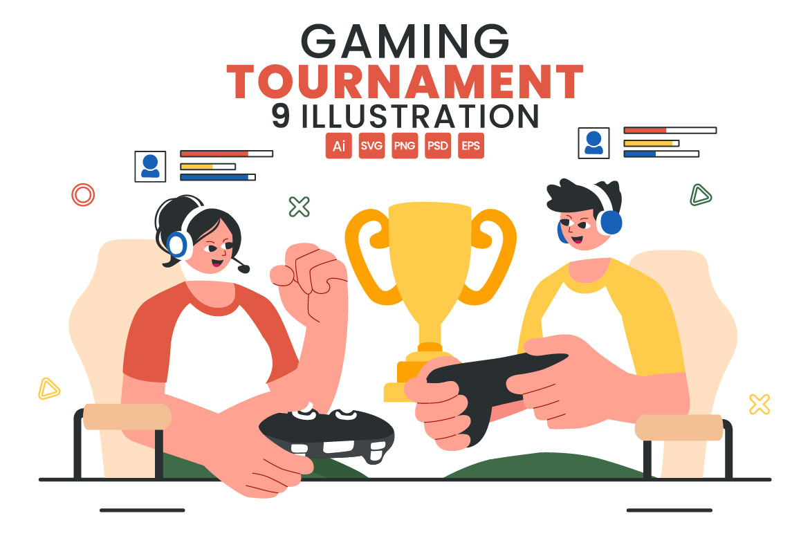 E-Sports Tournament Vector Illustration featuring Two Players Competing in an Online Game for a Cyber Sports Competition inside a Gaming Arena Suitable for Poster, Web Banner, Brochure, Landing Page and Others Background Template Features: