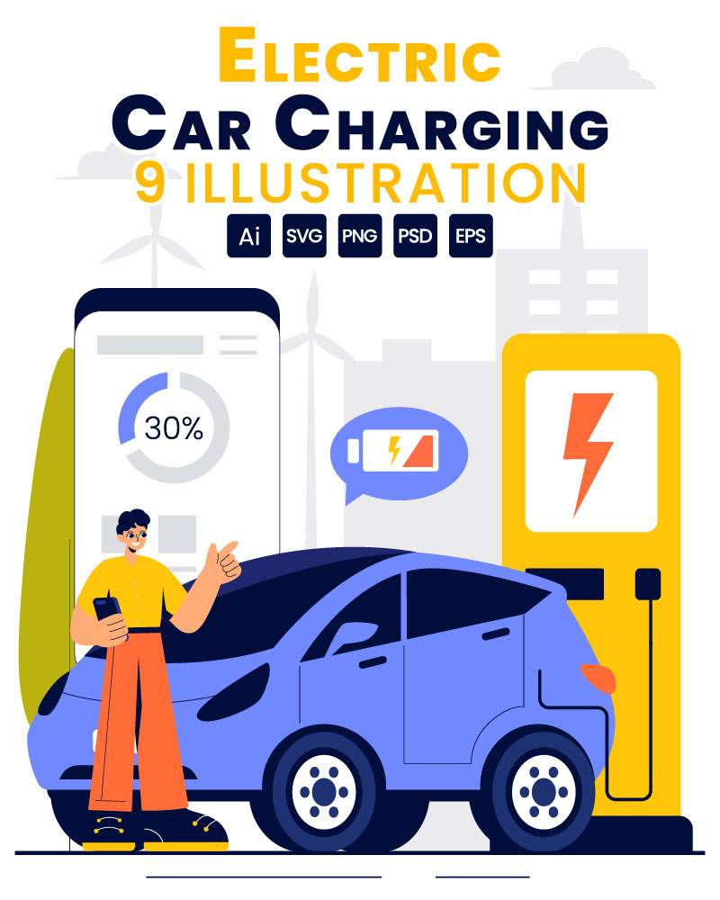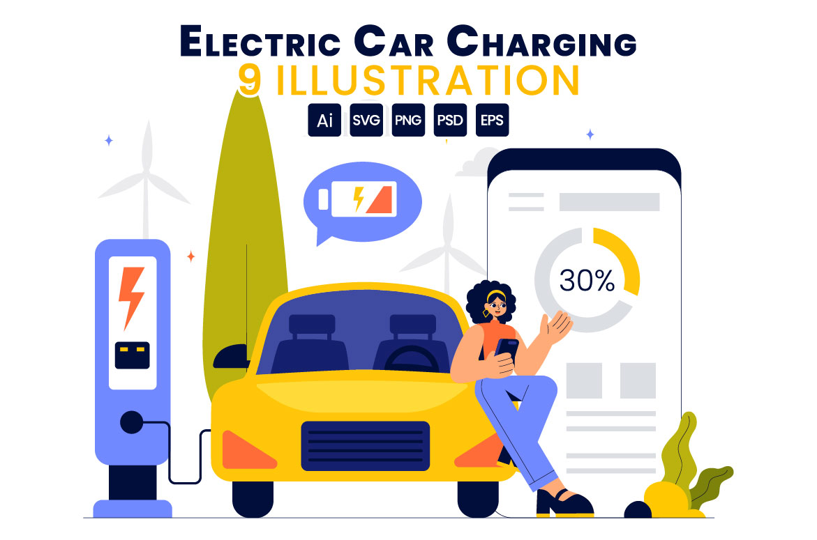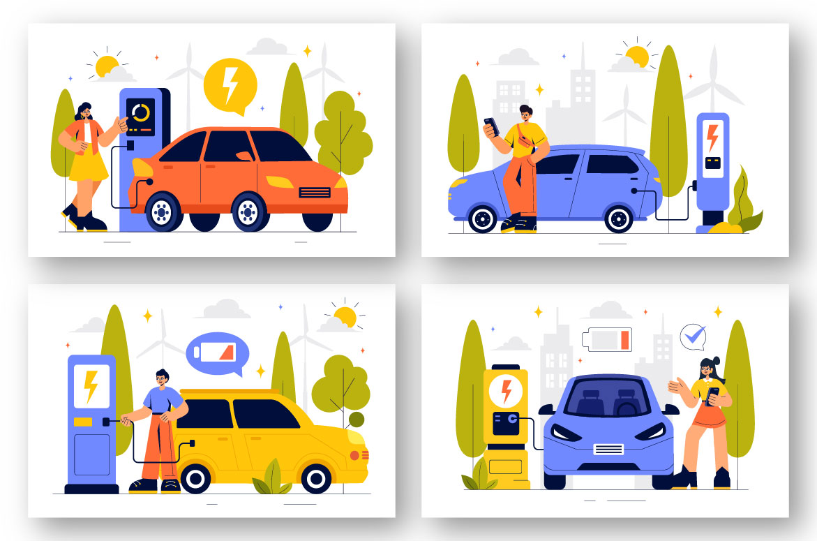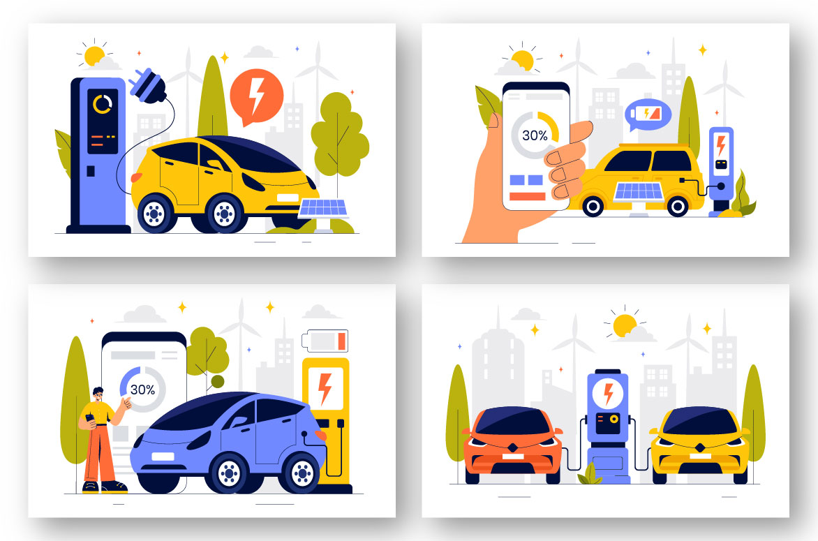 Charging Electric Car Batteries Vector Illustration with of Charger and Cable Plugs Representing Green Energy, Environmental Sustainability or Ecology Suitable for Poster, Web Banner, Brochure, Landing Page and Others Background Template Features: