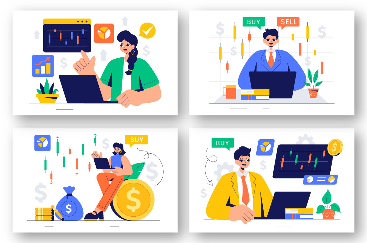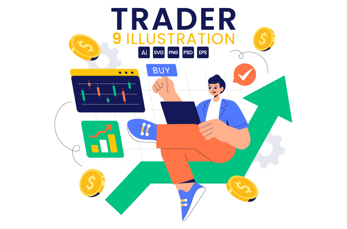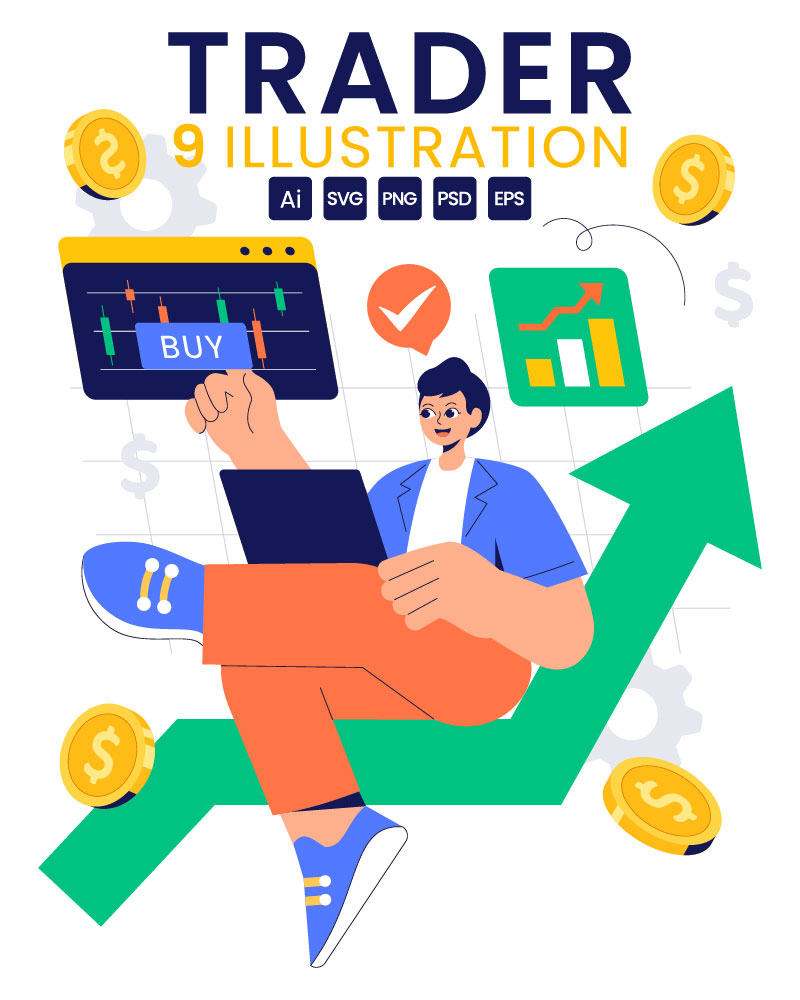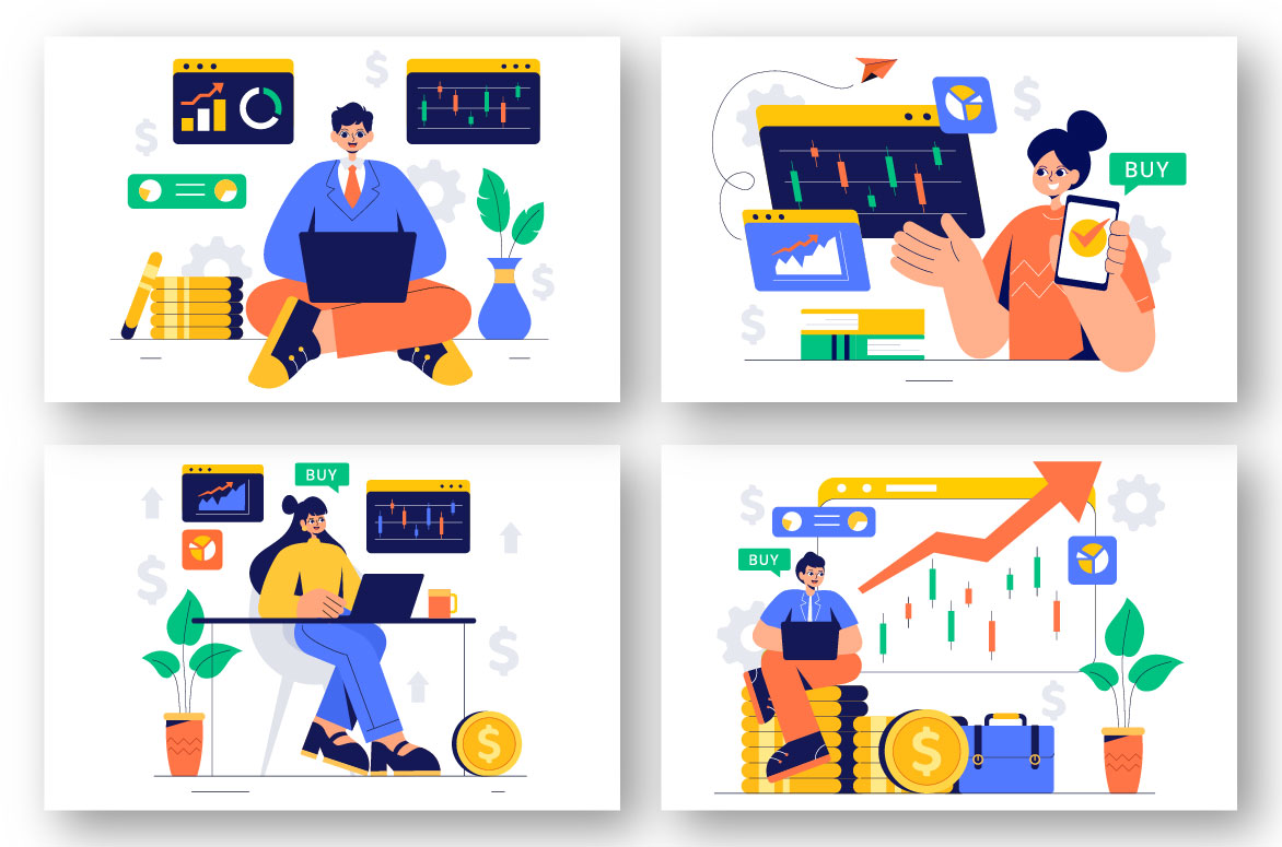 Trader Vector Illustration Featuring Financial Trend Evaluation, Data Analysis, Traders Analyzing Charts, Candle Bars, and Graphs on Digital Devices Suitable for Poster, Web Banner, Brochure, Landing Page and Others Background Template Features: