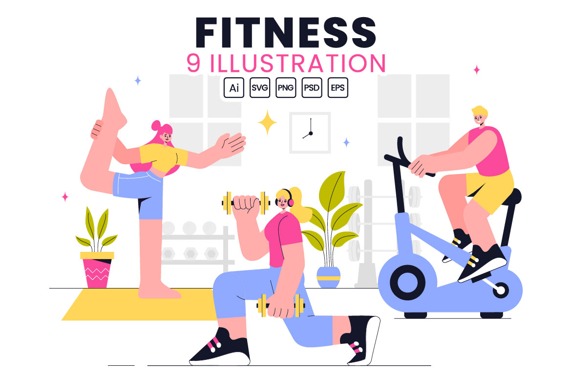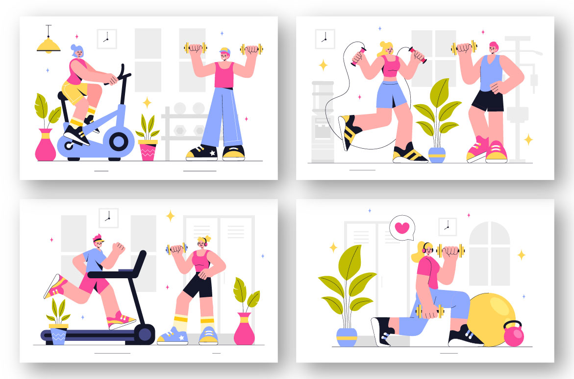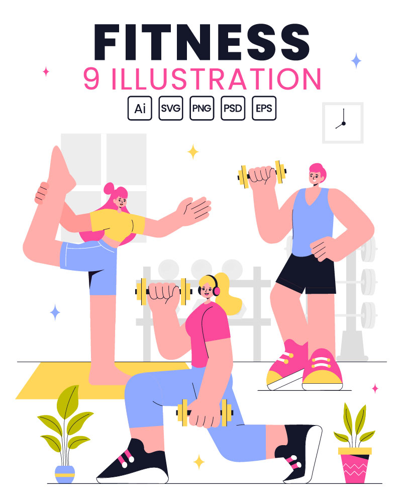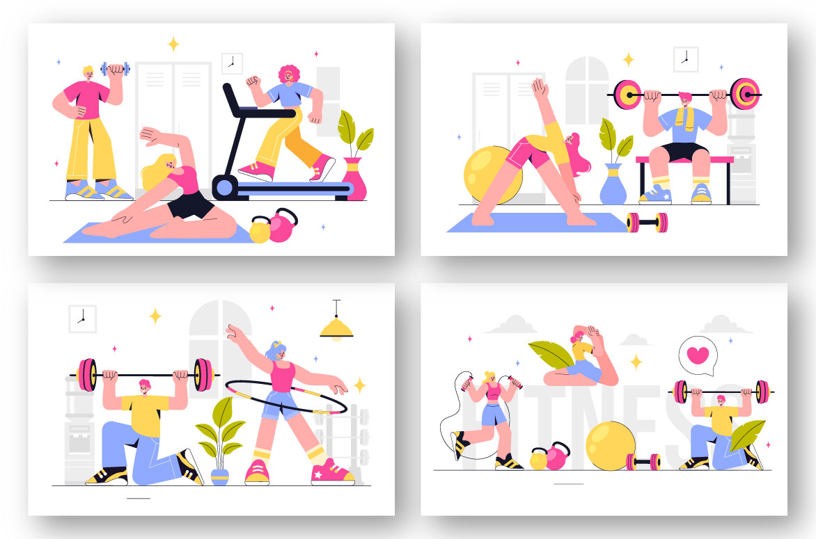 Fitness and Gym Vector Illustration Featuring Exercise, Wellness, Mental Health, Healthcare, and a Healthy Lifestyle in a Flat Style Background Suitable for Poster, Web Banner, Brochure, Landing Page and Others Background Template Features: