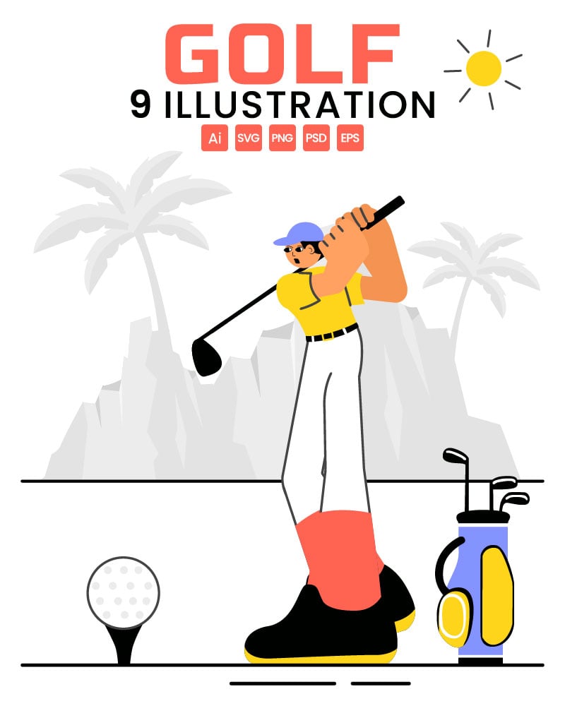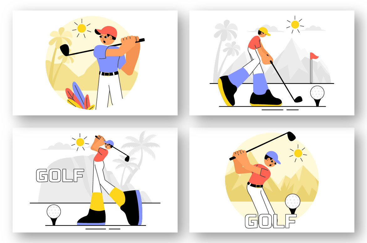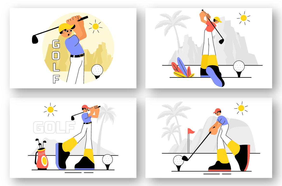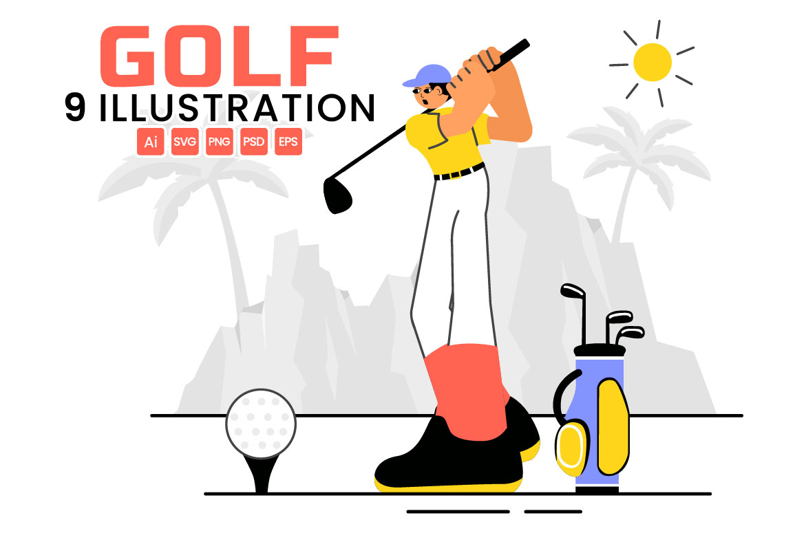 Golf Sport Vector Illustration Featuring Flags, Golf Cart, Clubs, Green Field, and Sand Bunker for Outdoor Fun and Active Lifestyle in Background Suitable for Poster, Web Banner, Brochure, Landing Page and Others Background Template Features: