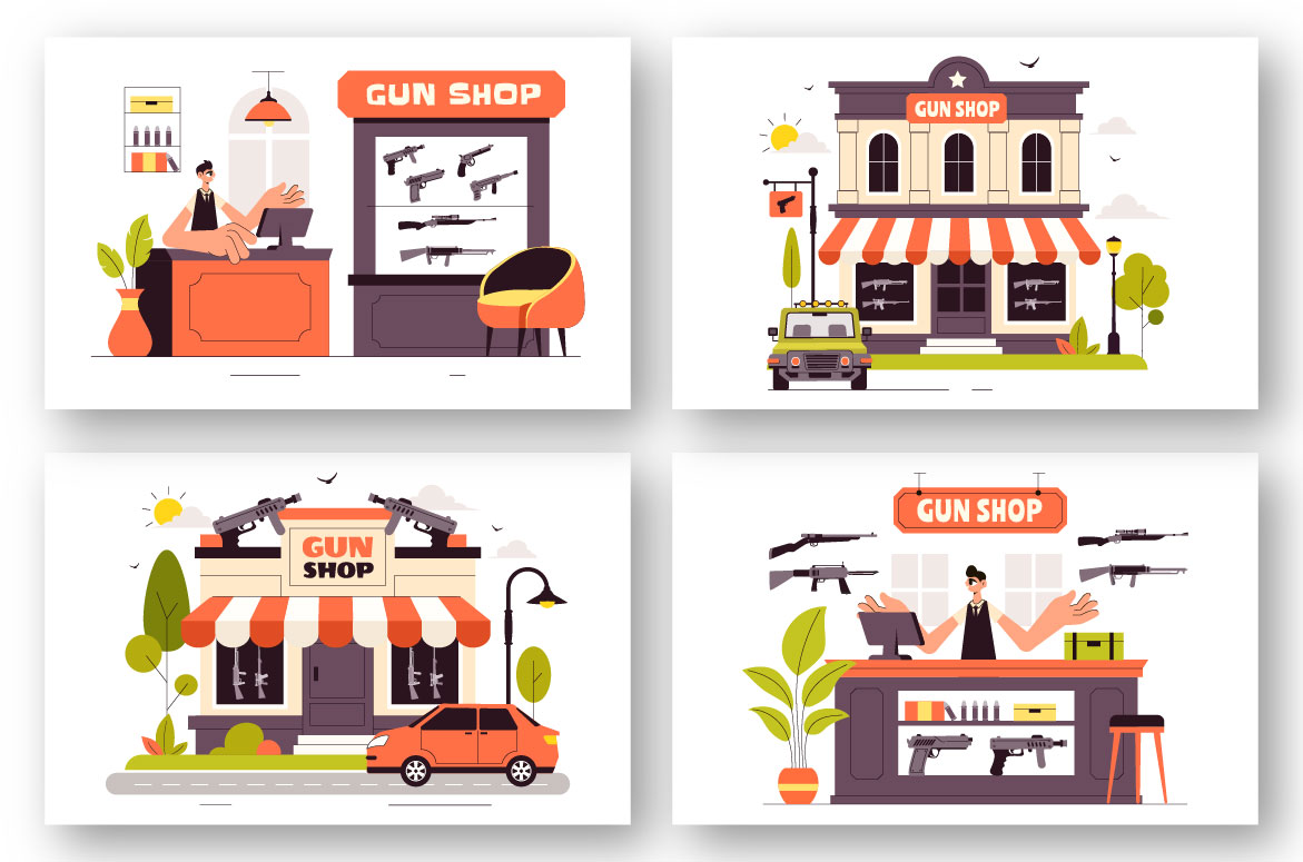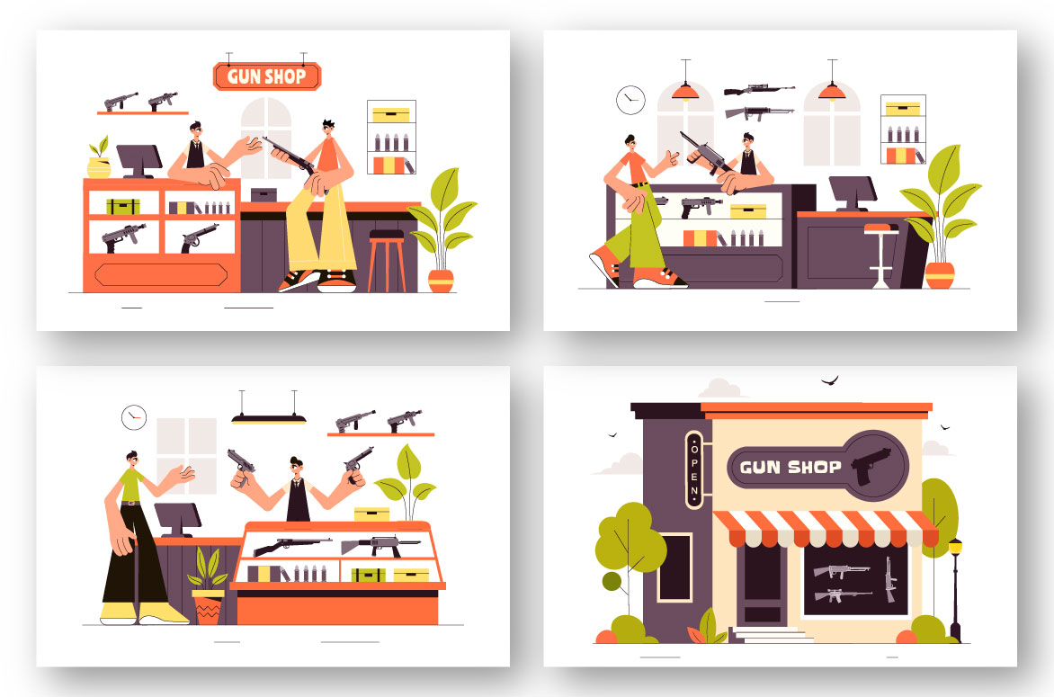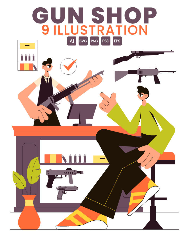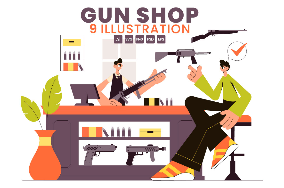 Gun Accessories Shop Vector Illustration featuring a Rifle, Bullets, Weapons, and Hunting Equipment in a Flat Style Cartoon Background Suitable for Poster, Web Banner, Brochure, Landing Page and Others Background Template Features: