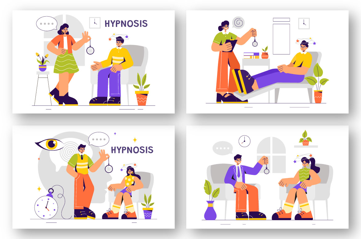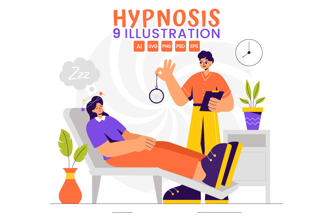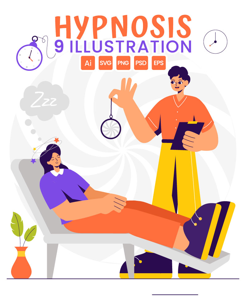 Hypnosis Vector Illustration featuring Black and White Spiral Patterns to Induce an Altered State of Mind for Treatment Services in a Flat Background Suitable for Poster, Web Banner, Brochure, Landing Page and Others Background Template Features: