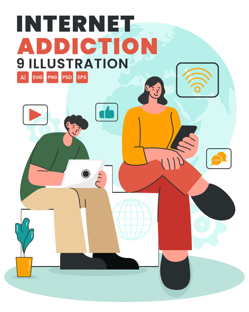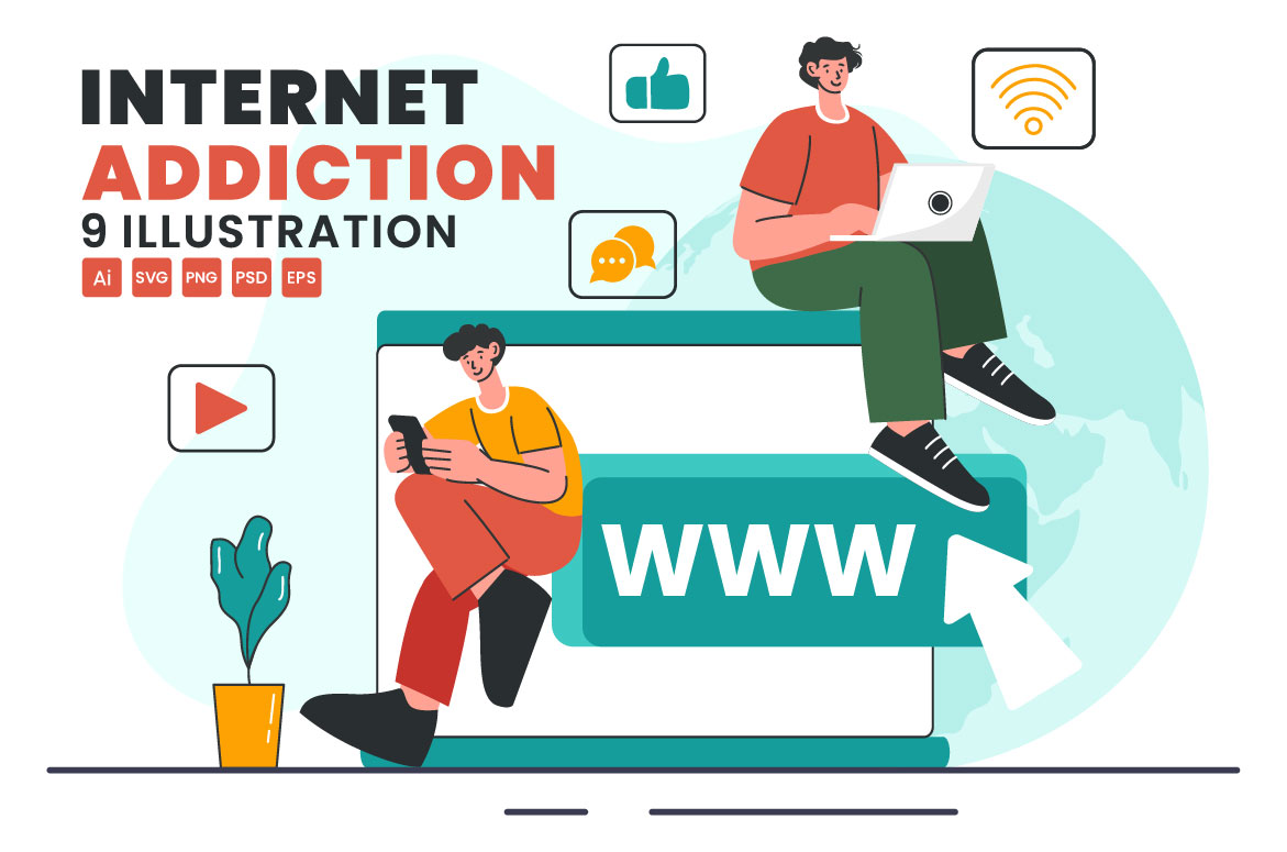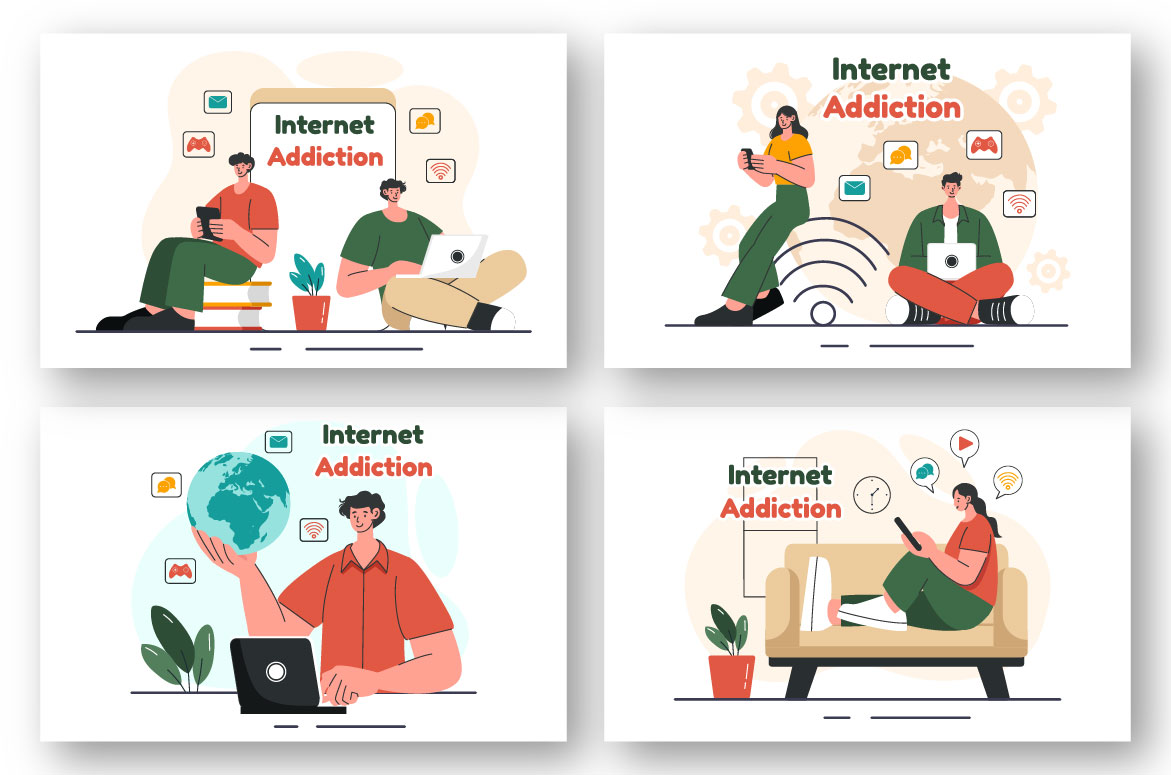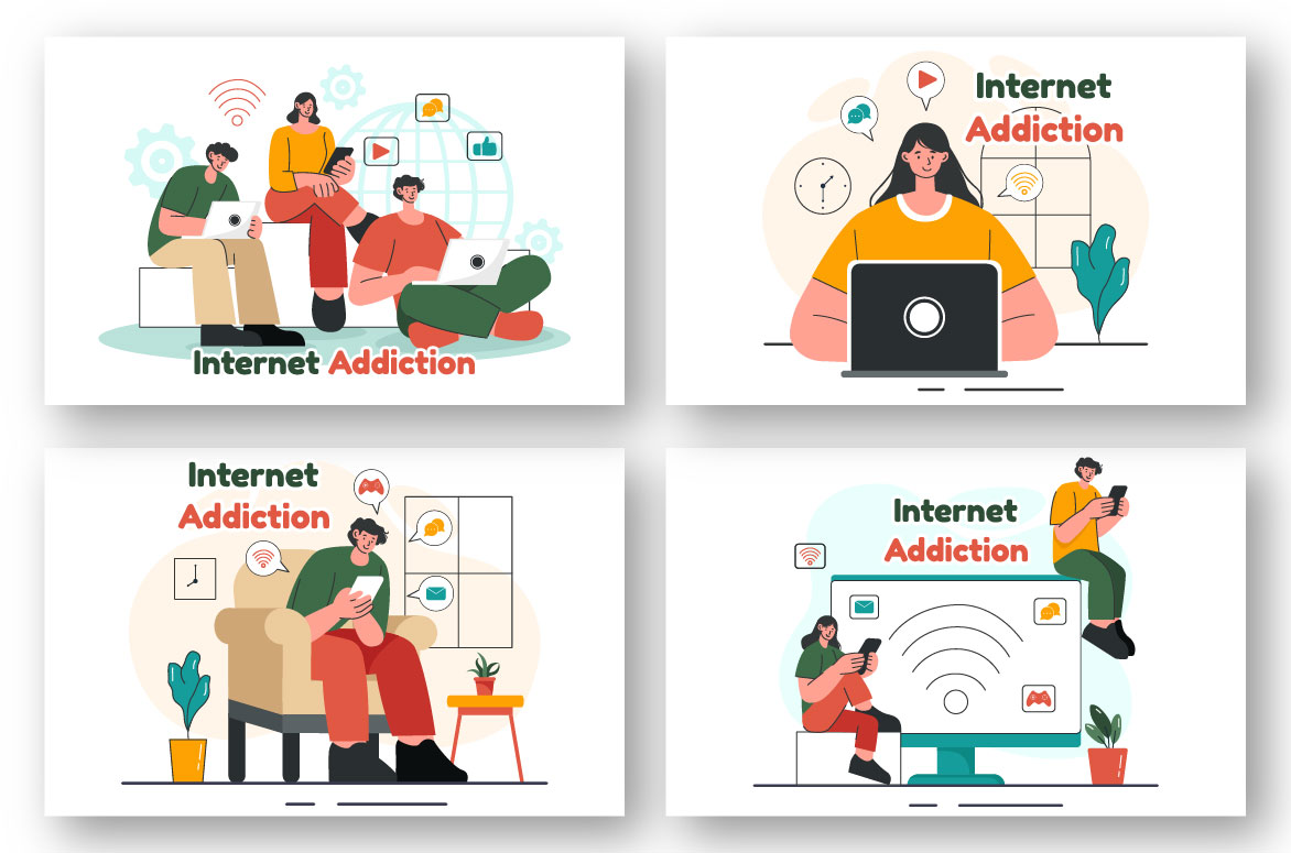 Internet Addiction Vector Illustration with Young People Addicted to Using Devices Such as Laptops or Smartphones in a Flat Style Cartoon Background Suitable for Poster, Web Banner, Brochure, Landing Page and Others Background Template Features: