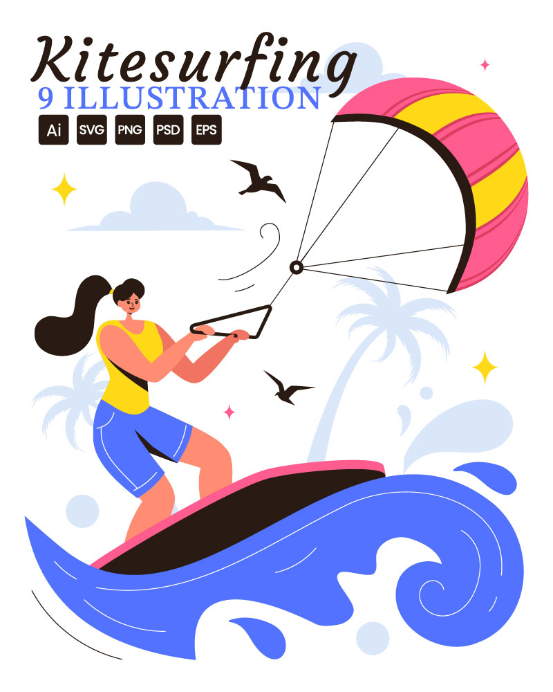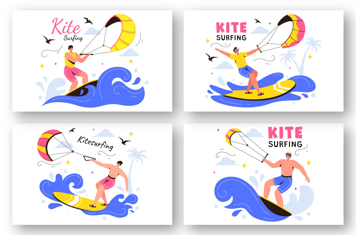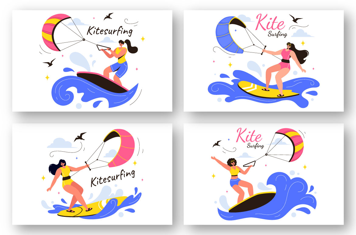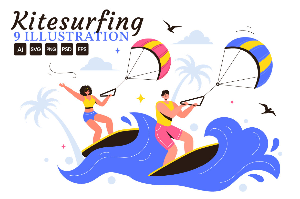 Kitesurfing Vector Illustration featuring a Kite Surfer Standing on a Kiteboard in the Summer Sea in Extreme Water Sports with a Cartoon Background Suitable for Poster, Web Banner, Brochure, Landing Page and Others Background Template Features:
