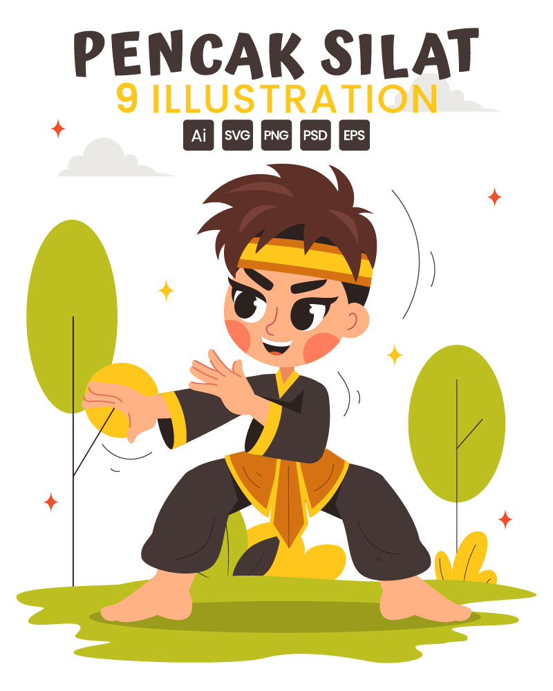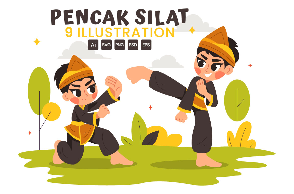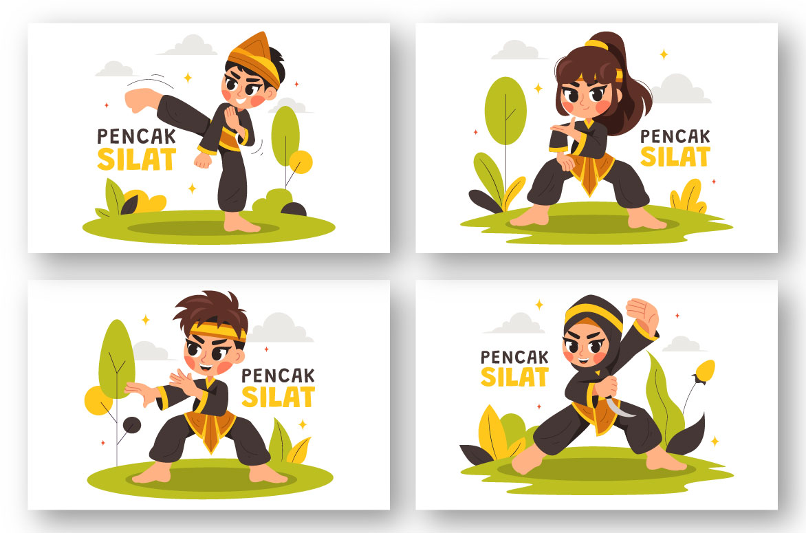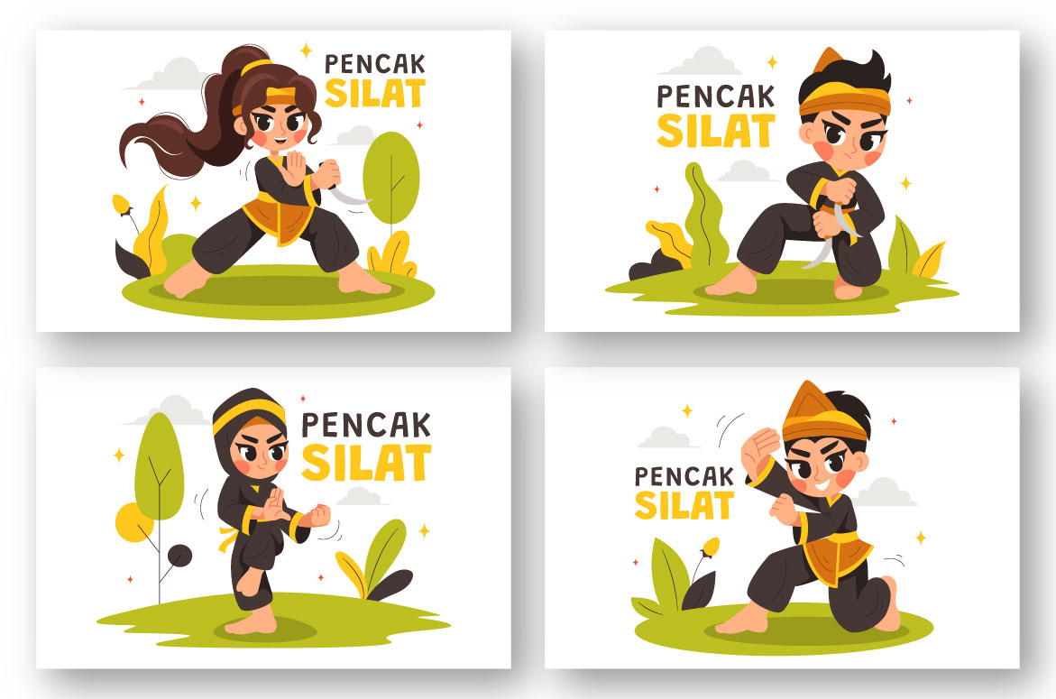 Pencak Silat Sport Vector Illustration featuring Martial Artists Posing in Traditional Indonesian Fighting Stances, in a Flat Style Cartoon Background Suitable for Poster, Web Banner, Brochure, Landing Page and Others Background Template Features: