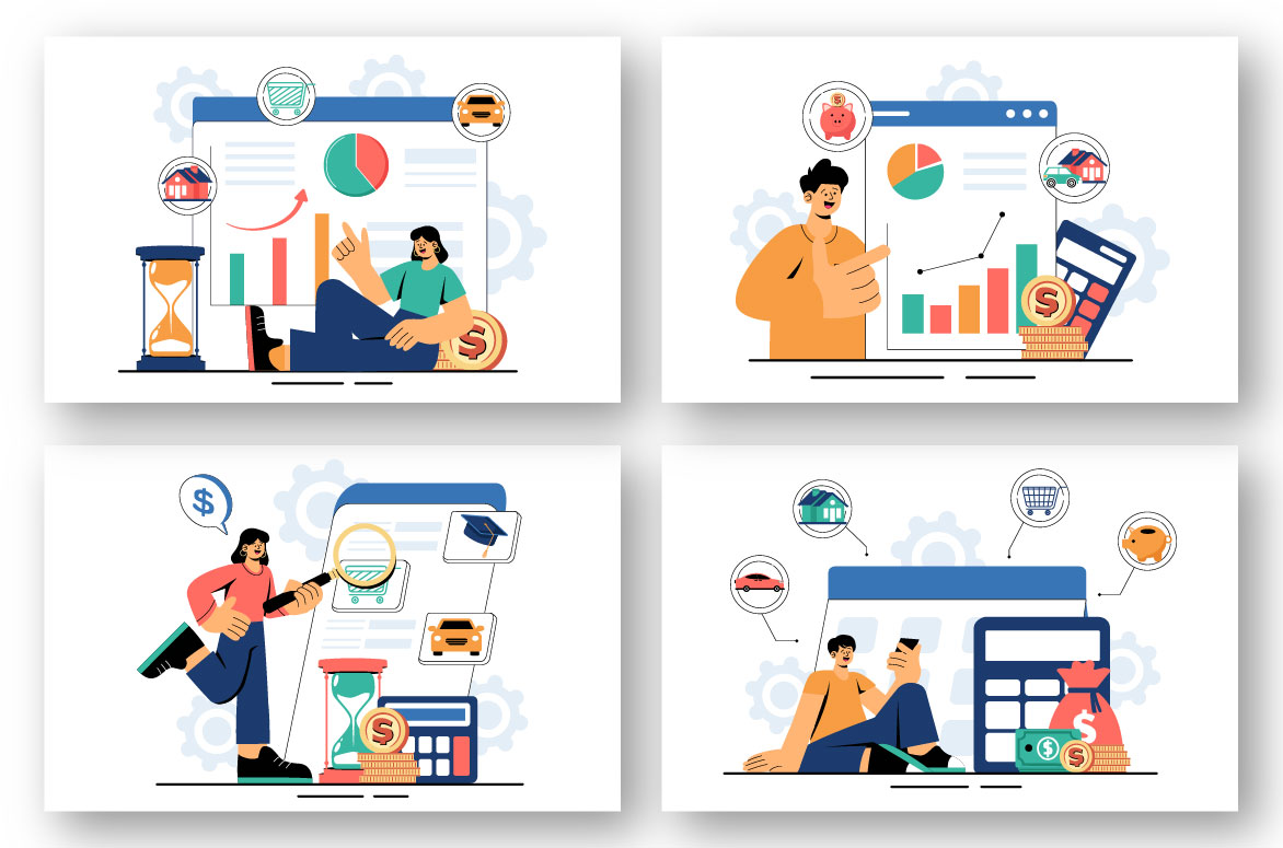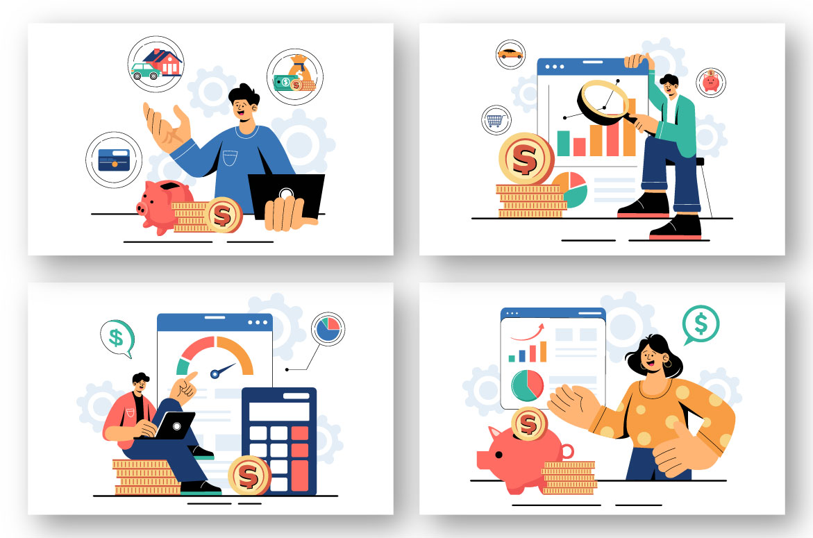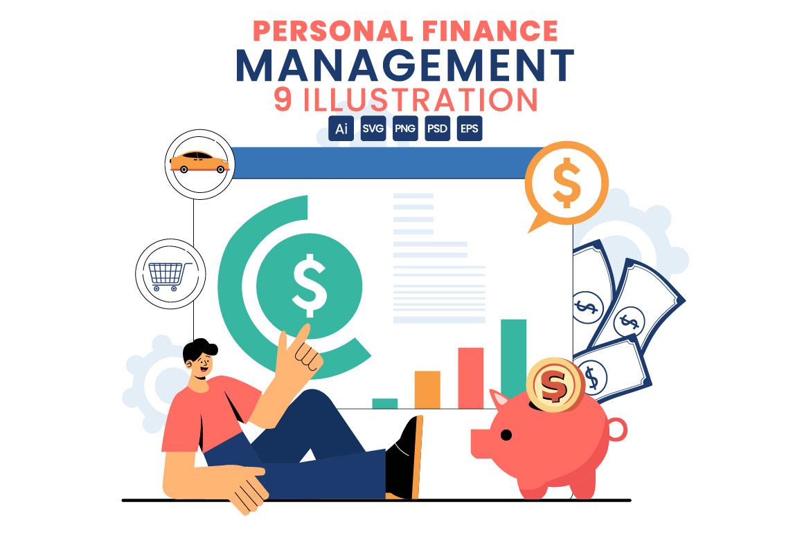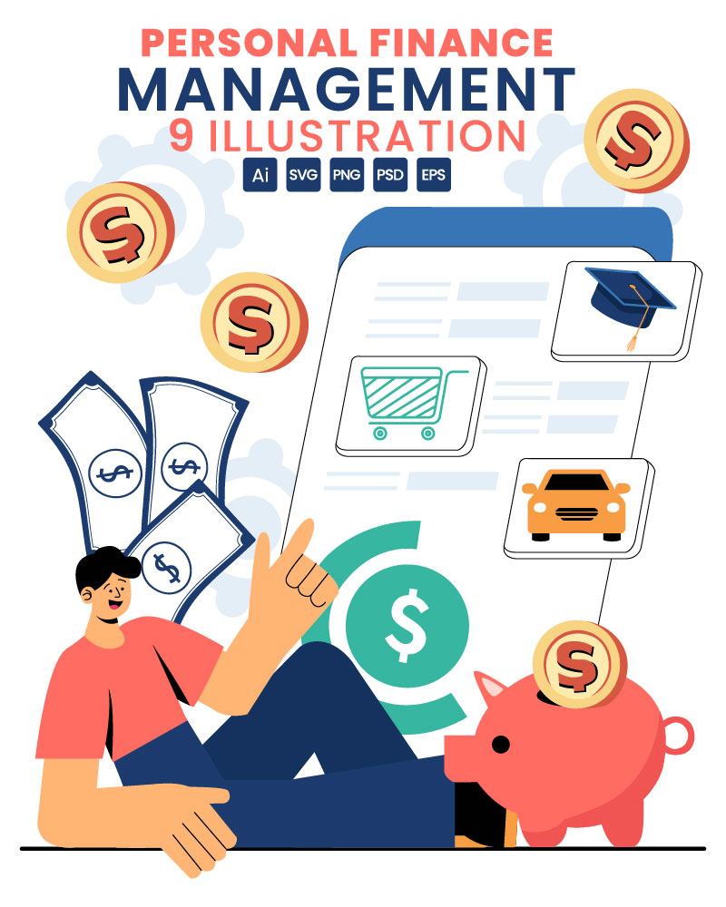Personal Finance Management Vector Illustration Depicting Money Spending Habits, Purchase Planning, Financial Goal Setting, and Budget Management Suitable for Poster, Web Banner, Brochure, Landing Page and Others Background Template Features: