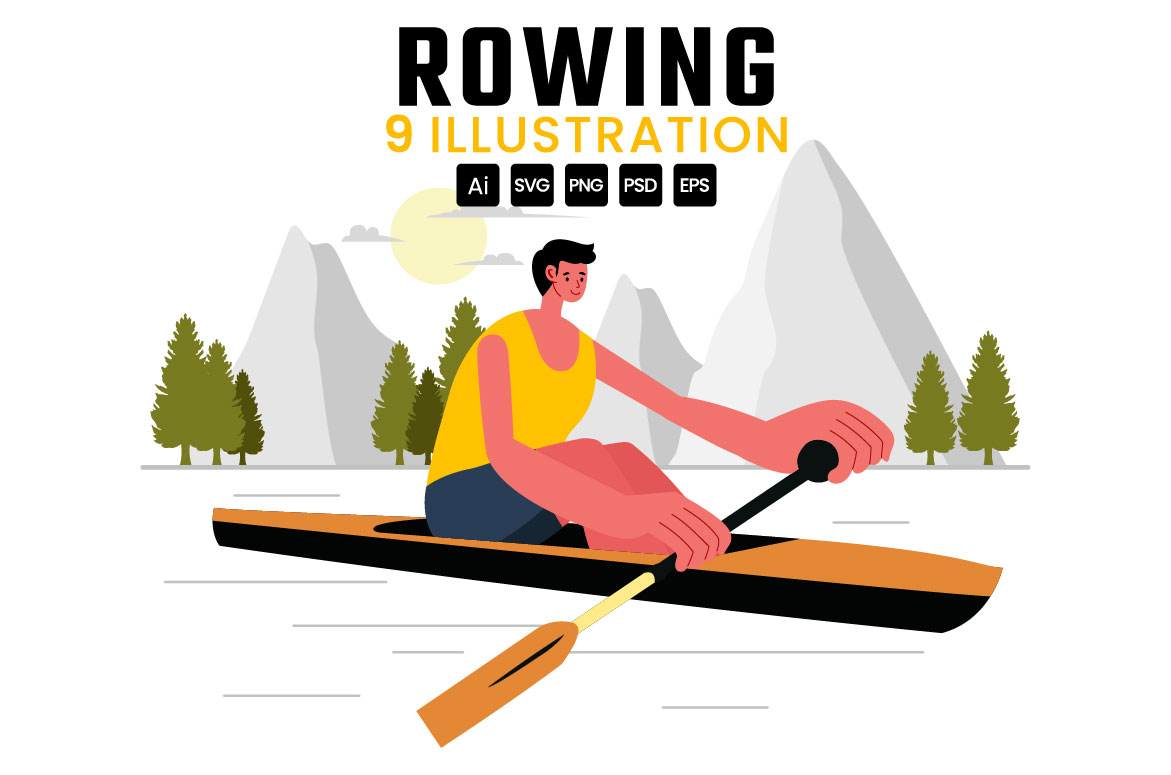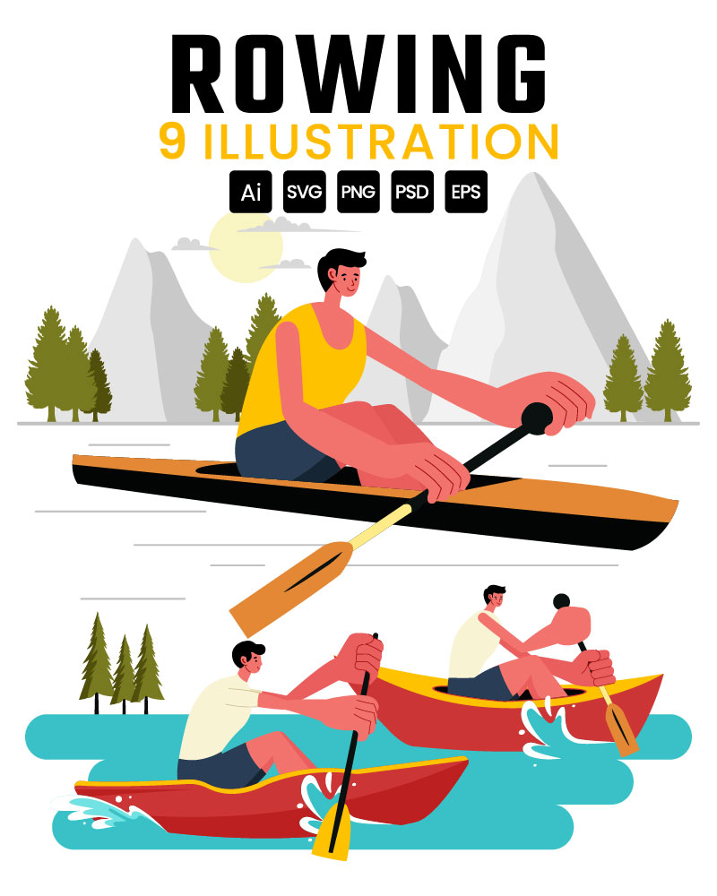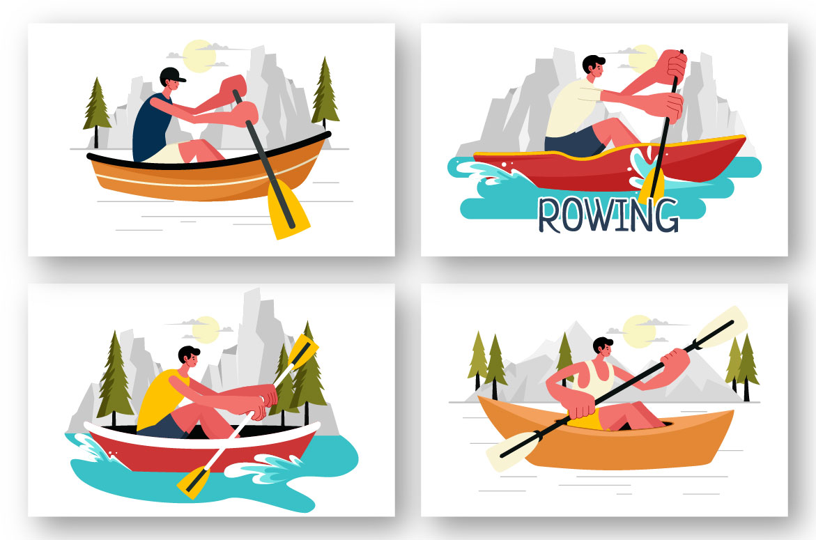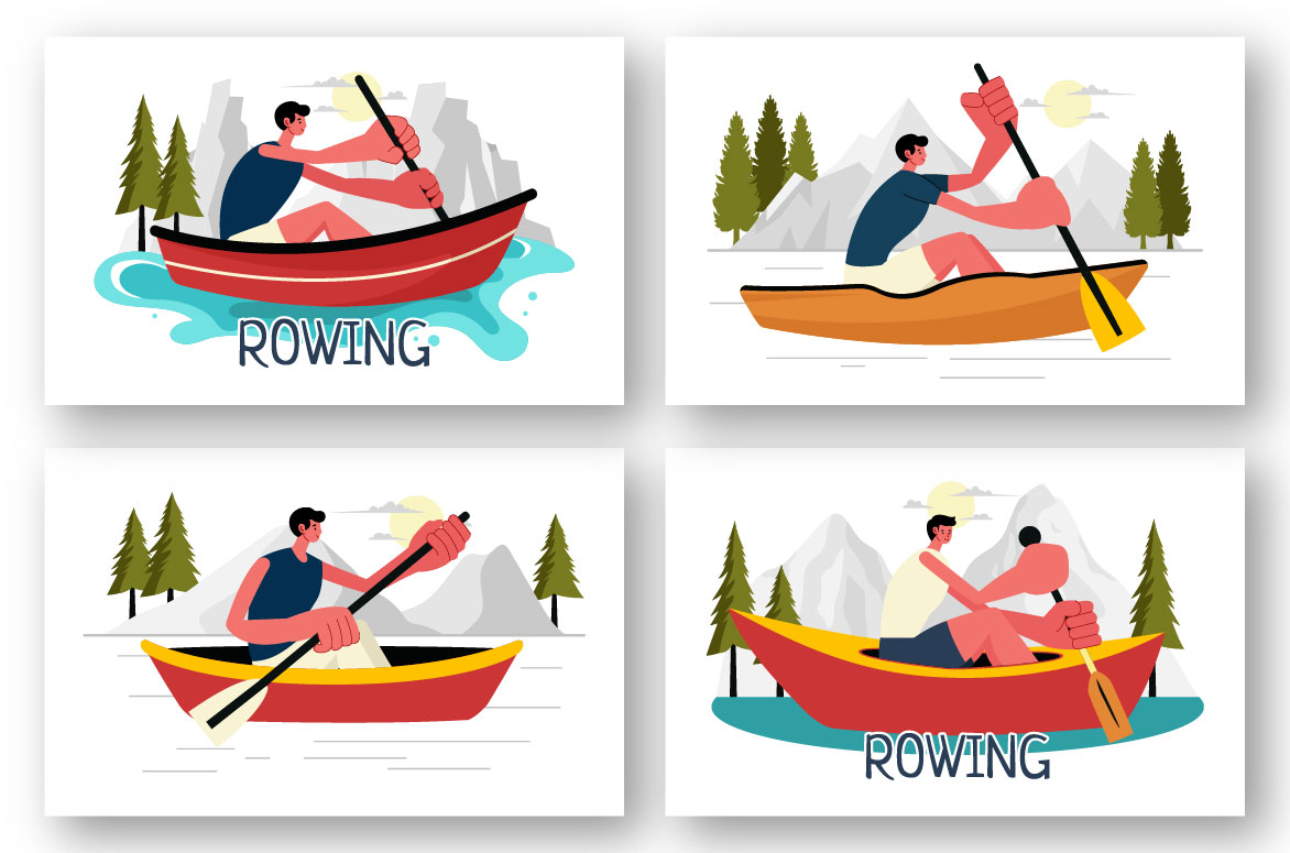 People Enjoying Rowing Vector Illustration with Canoes and Sailing on a River or Lake in Active Water Sports in a Flat Style Cartoon Background Suitable for Poster, Web Banner, Brochure, Landing Page and Others Background Template Features: