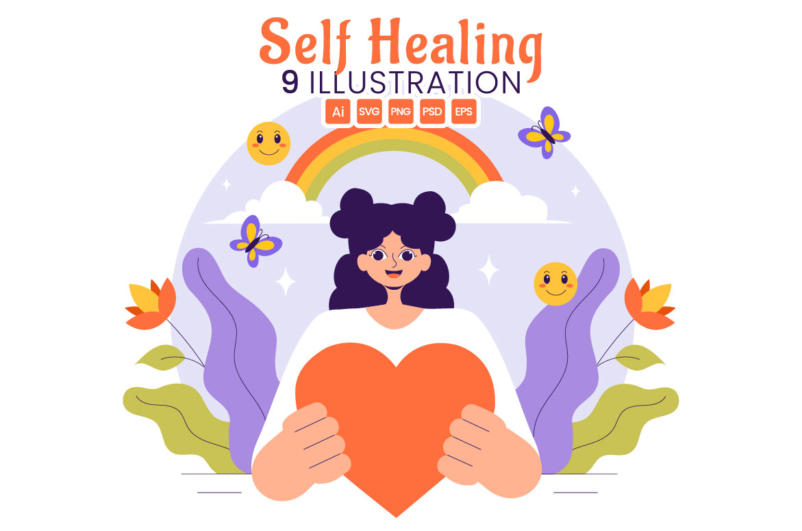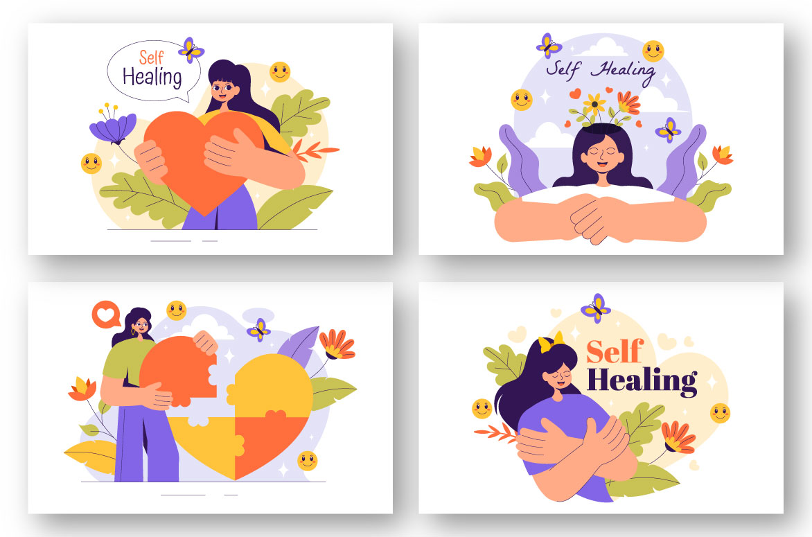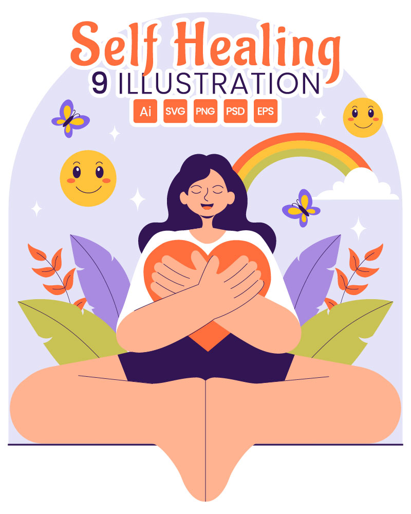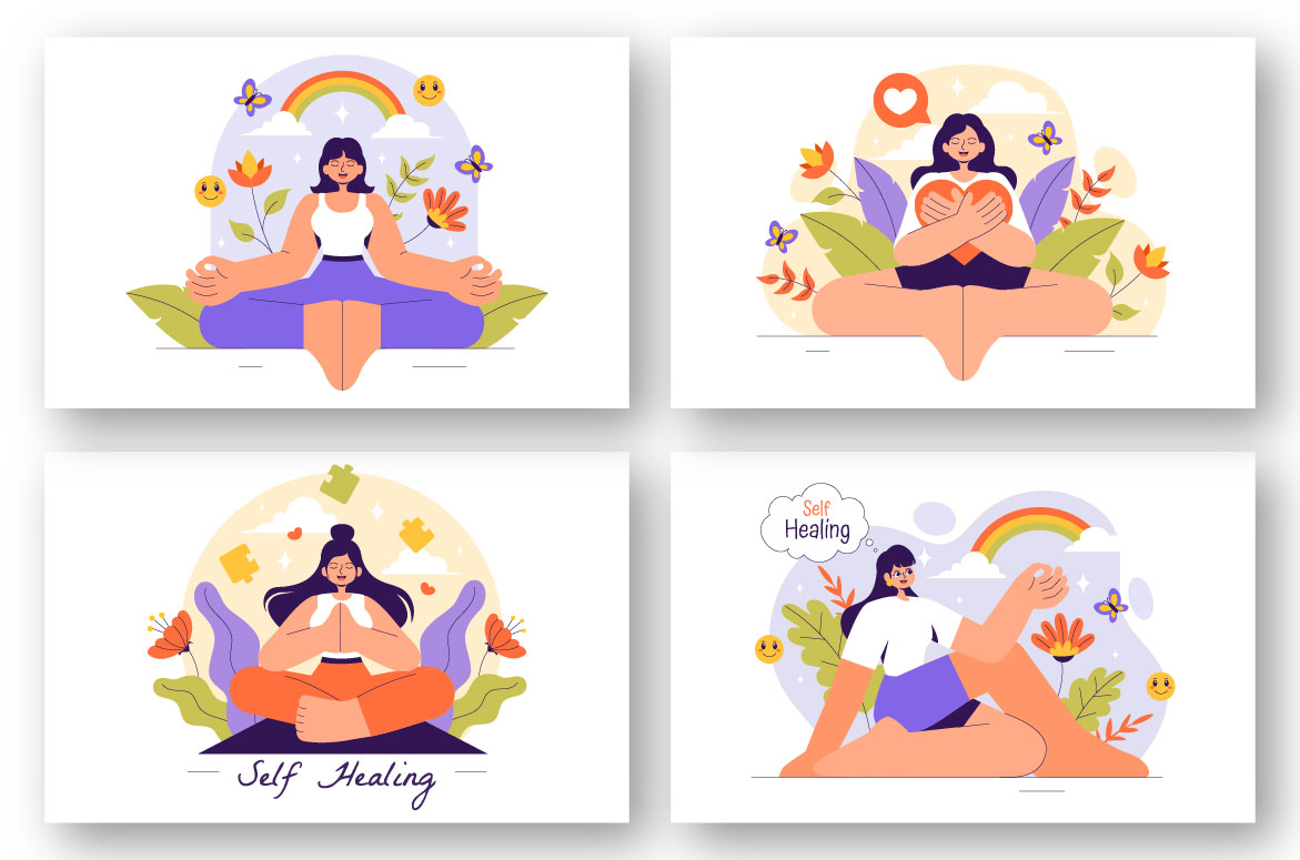 Self Healing Vector Illustration featuring a Woman Meditating and Restoring Mental Health and Inner Harmony through Yoga in a Flat Style Background Suitable for Poster, Web Banner, Brochure, Landing Page and Others Background Template Features: